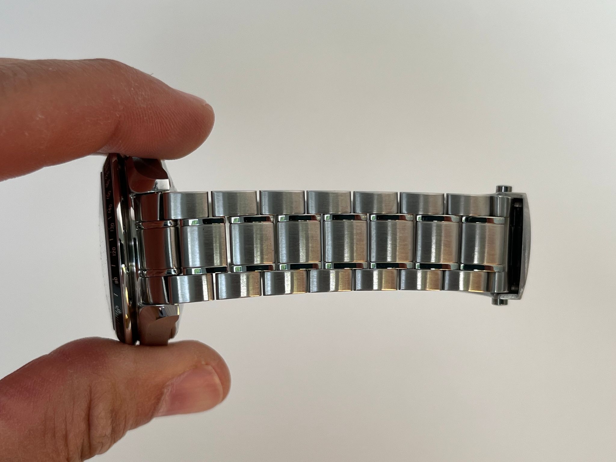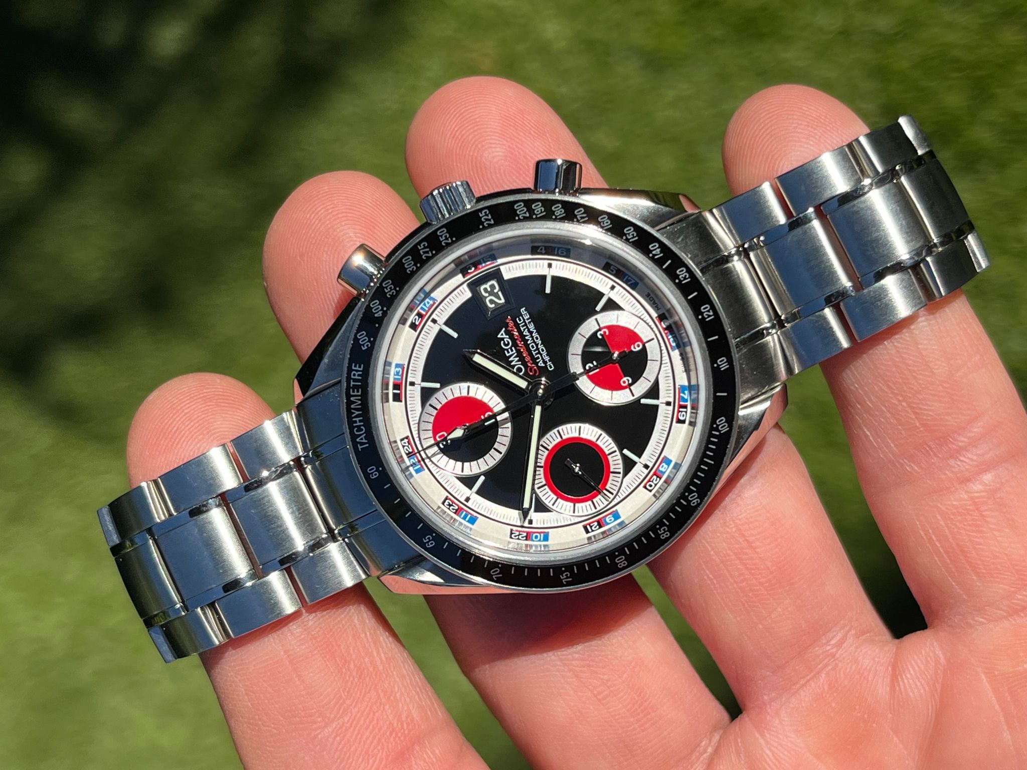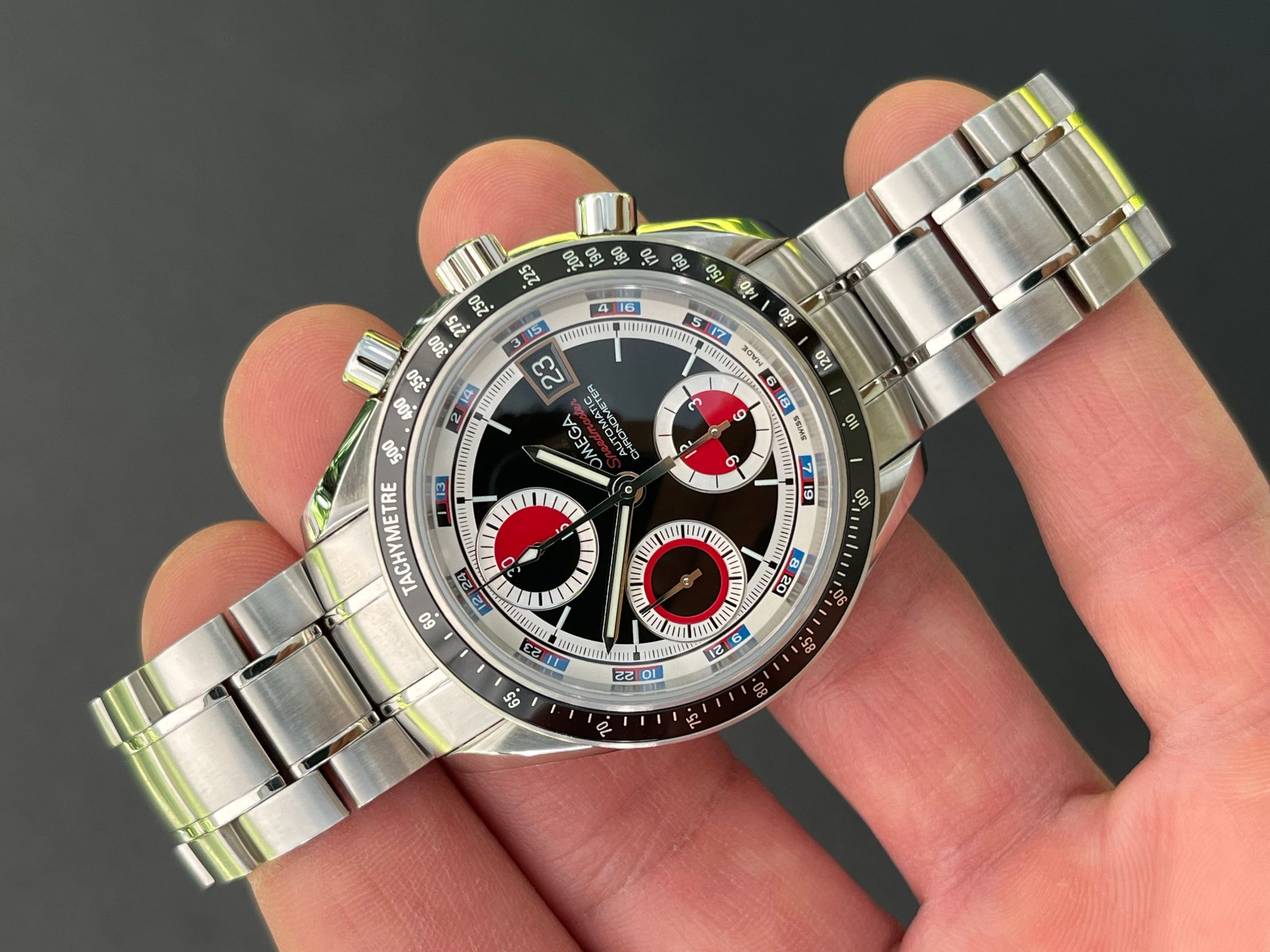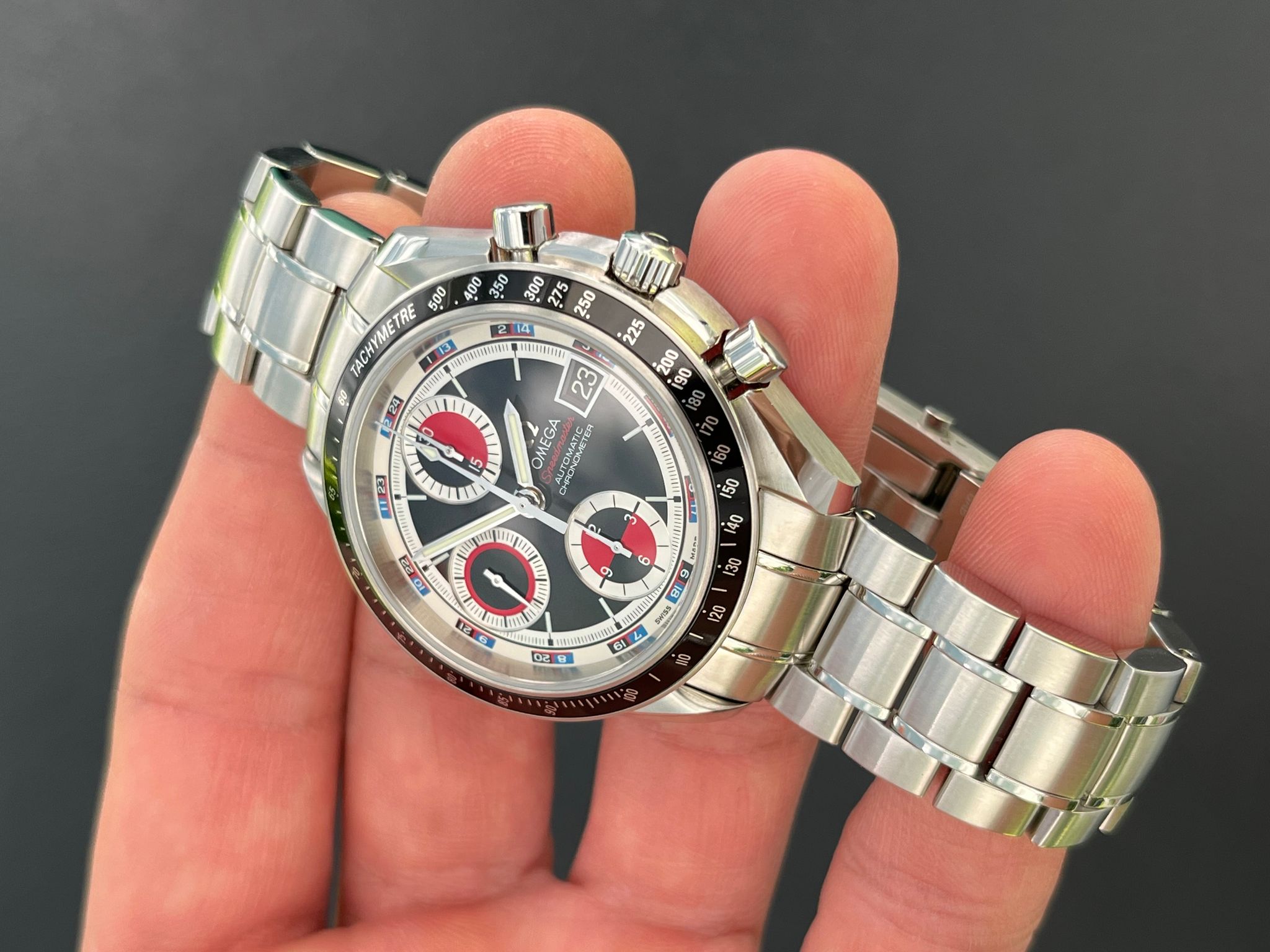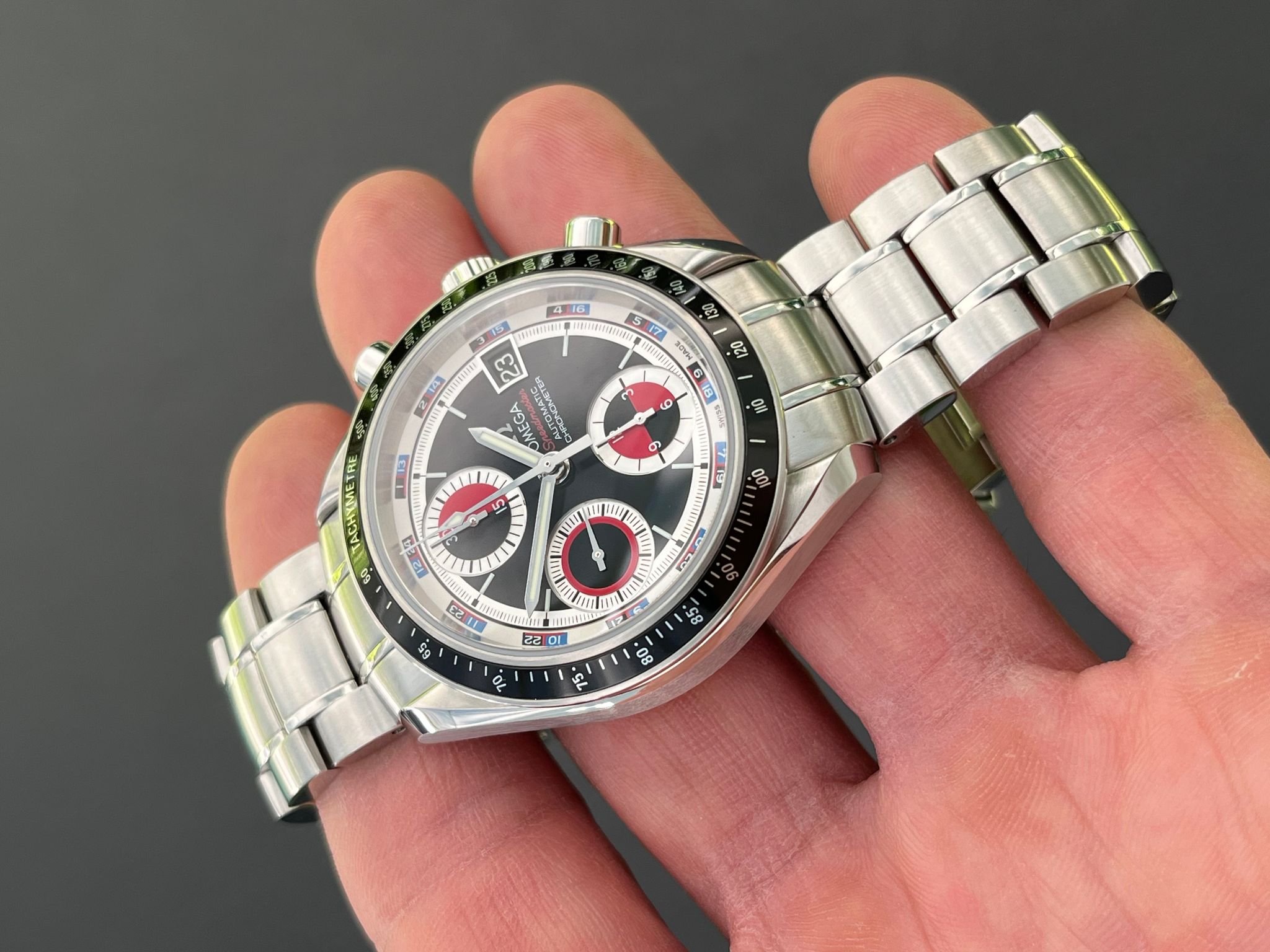 The Omega Speedmaster reference 3210.52 is a striking and versatile chronograph that embodies the brand’s commitment to precision and style. This model is characterized by its bold black dial, accented with red and white elements, and a tachymeter bezel, providing a sporty and functional aesthetic. Equipped with the Omega Caliber 1164 automatic movement, it offers reliable chronograph functionality and a date display at the 3 o’clock position. Measuring 40mm in stainless steel, it strikes a perfect balance between durability and wearability.