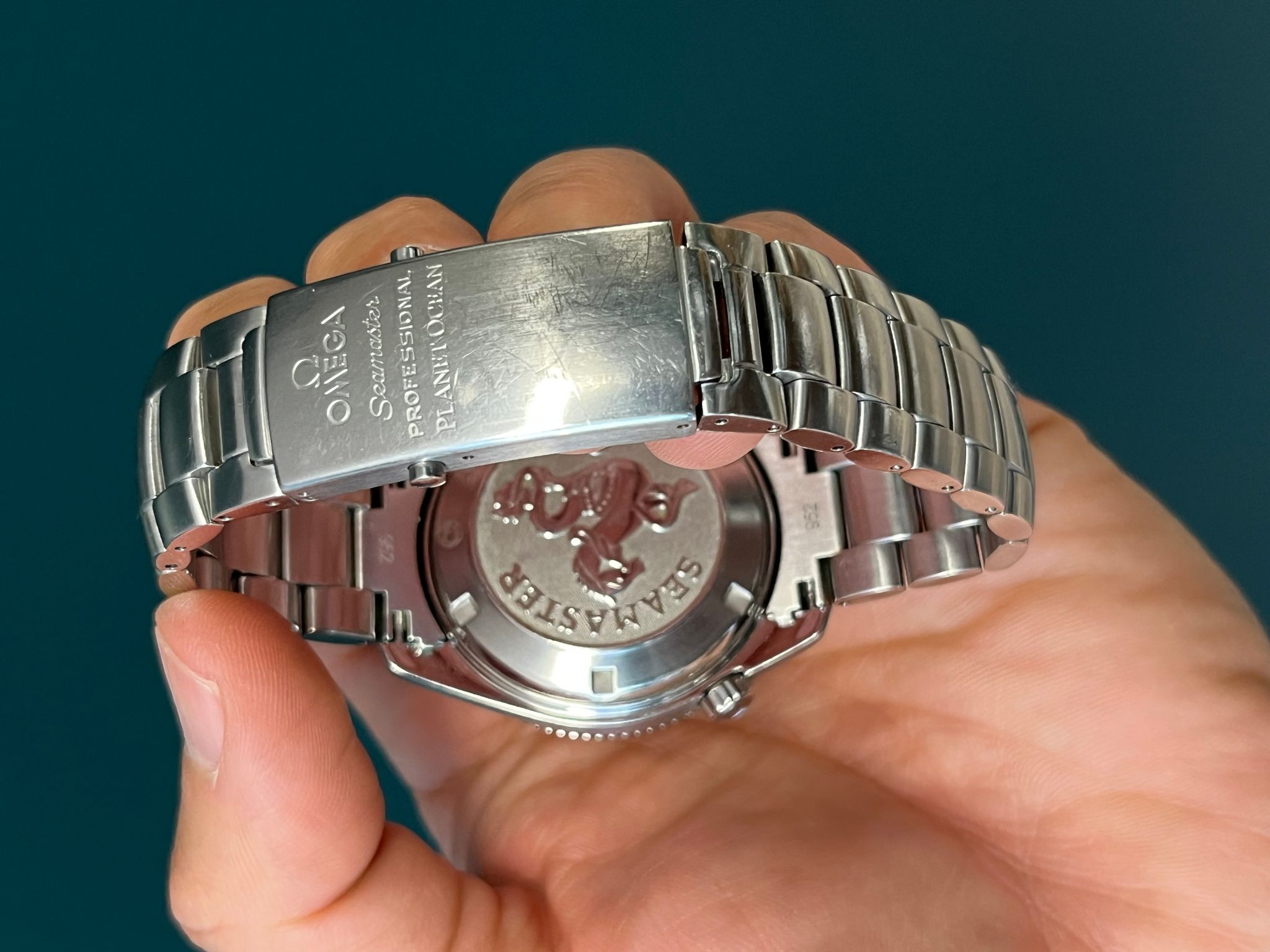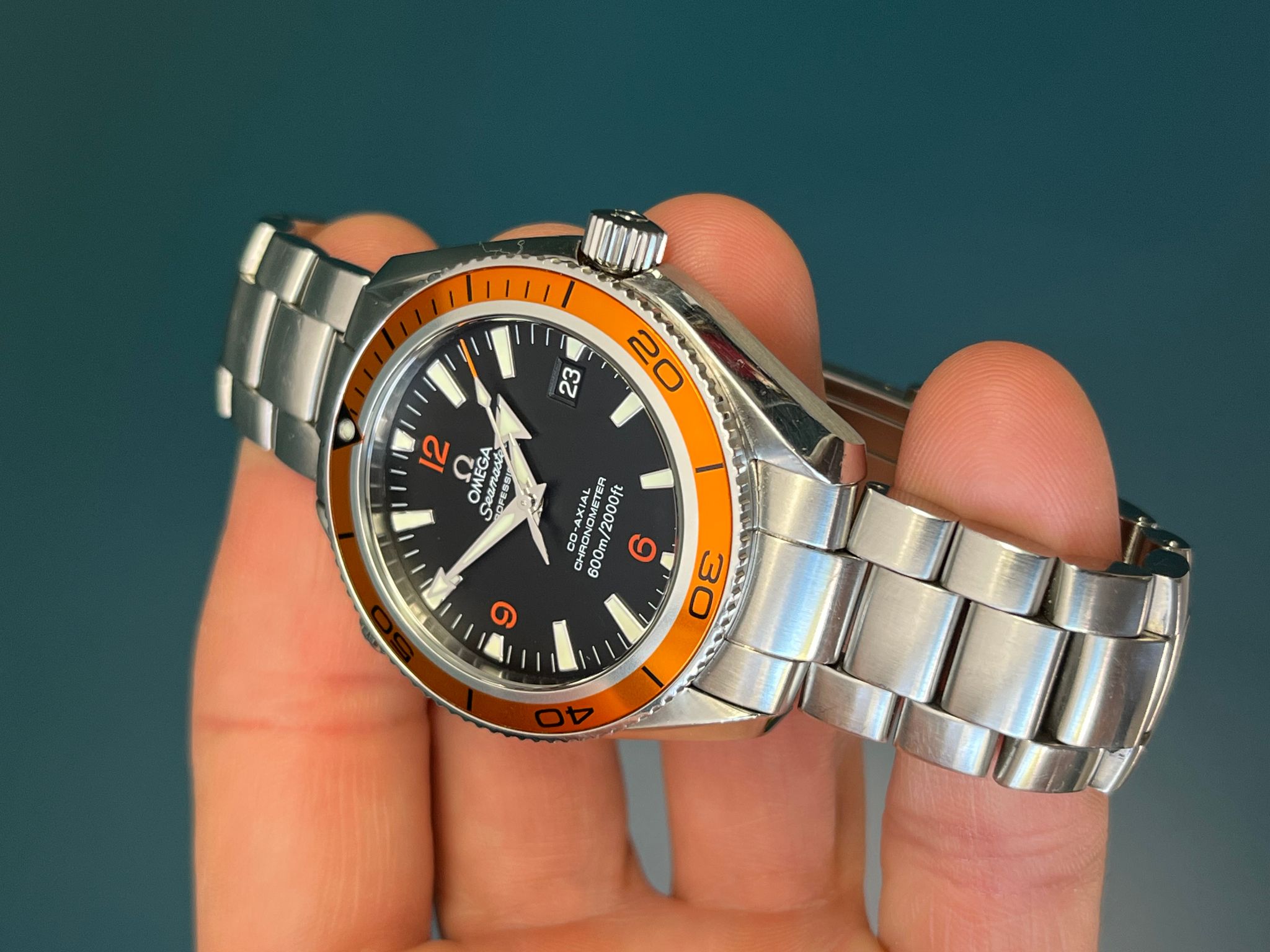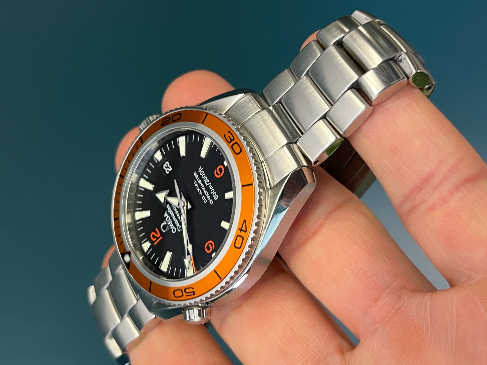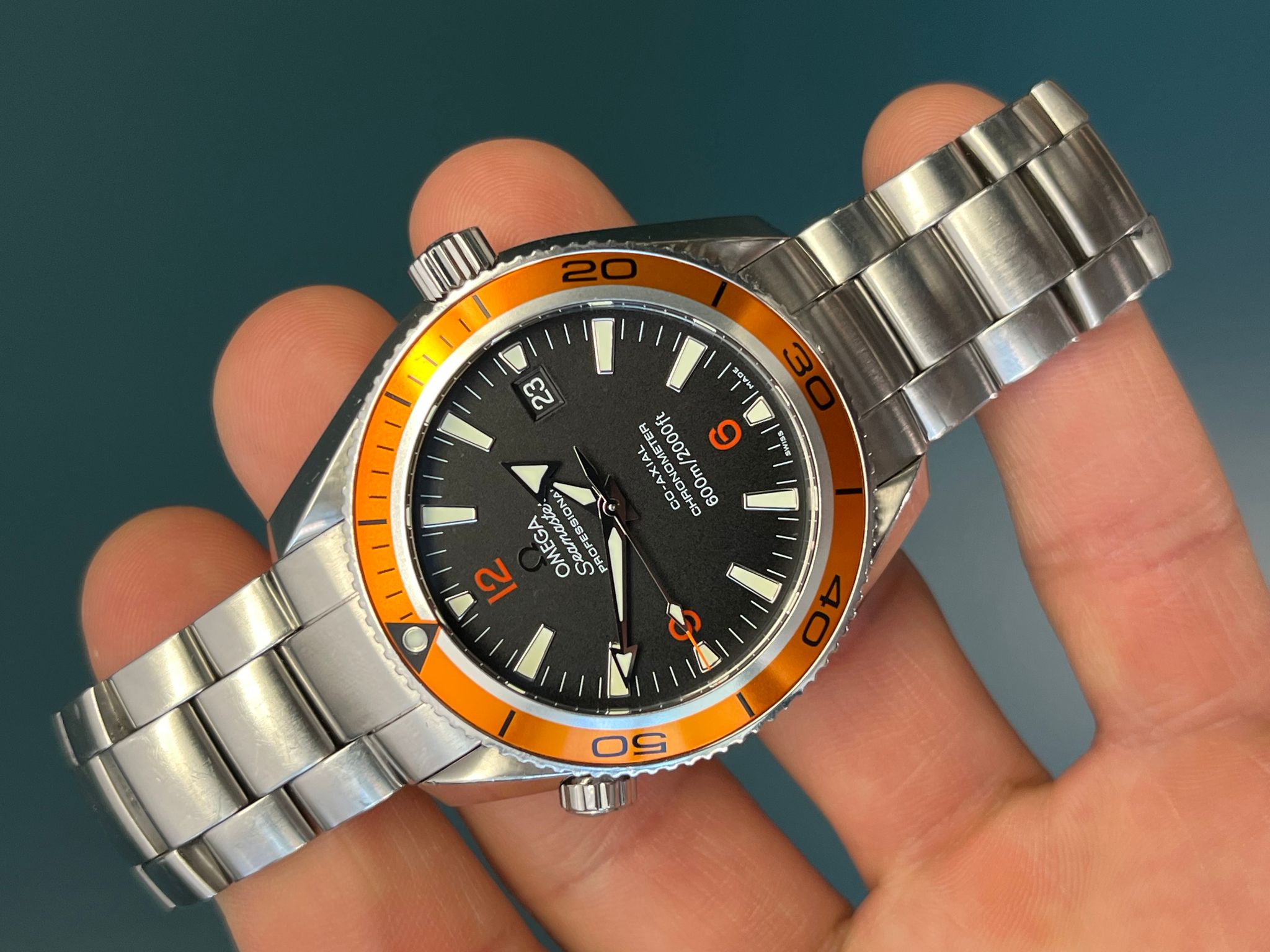 The Omega Seamaster Planet Ocean, reference 2209.50, is a professional-grade dive watch that blends rugged capability with refined style. Featuring a robust 42mm stainless steel case and a striking orange unidirectional bezel, it offers a bold yet versatile look that has become a signature of the Planet Ocean line. The black dial is accented with luminous hands and hour markers for optimal legibility in any lighting condition, while the helium escape valve at 10 o’clock underscores its serious diving credentials. Powered by Omega’s Co-Axial calibre 2500 automatic movement, it delivers exceptional precision and reliability, with water resistance rated to an impressive 600 meters (2000 feet). Offered here with its original Omega warranty card, this reference 2209.50 combines tool-watch performance, iconic design, and collectible completeness — making it a standout choice for both daily wear and the discerning enthusiast’s collection.