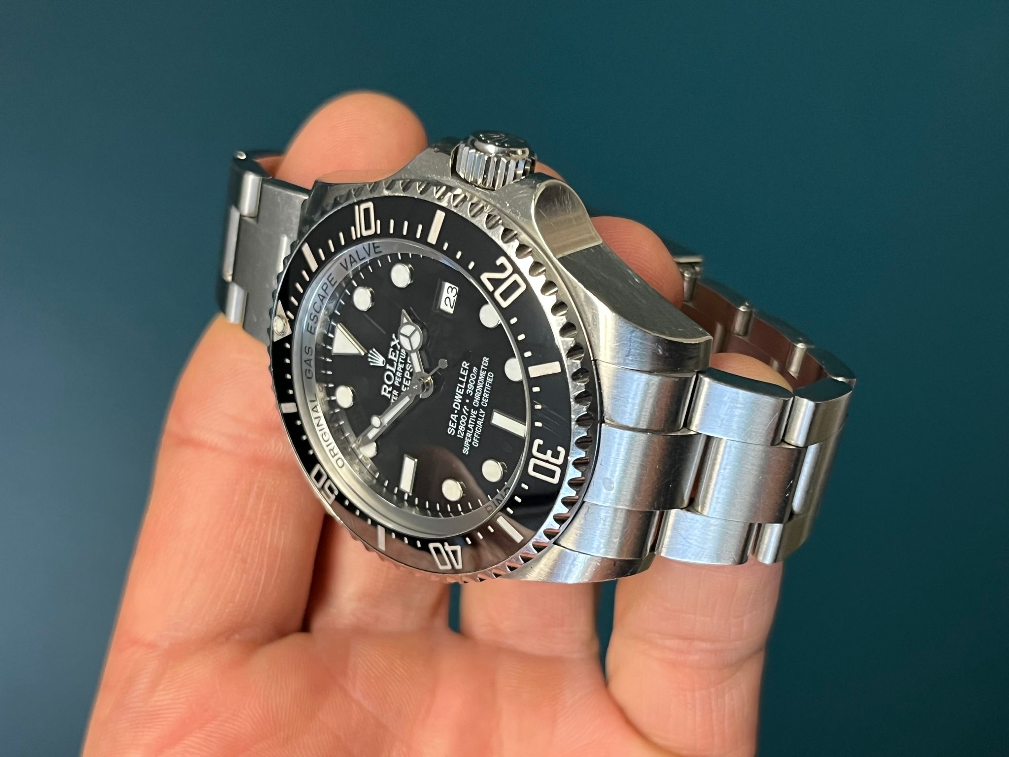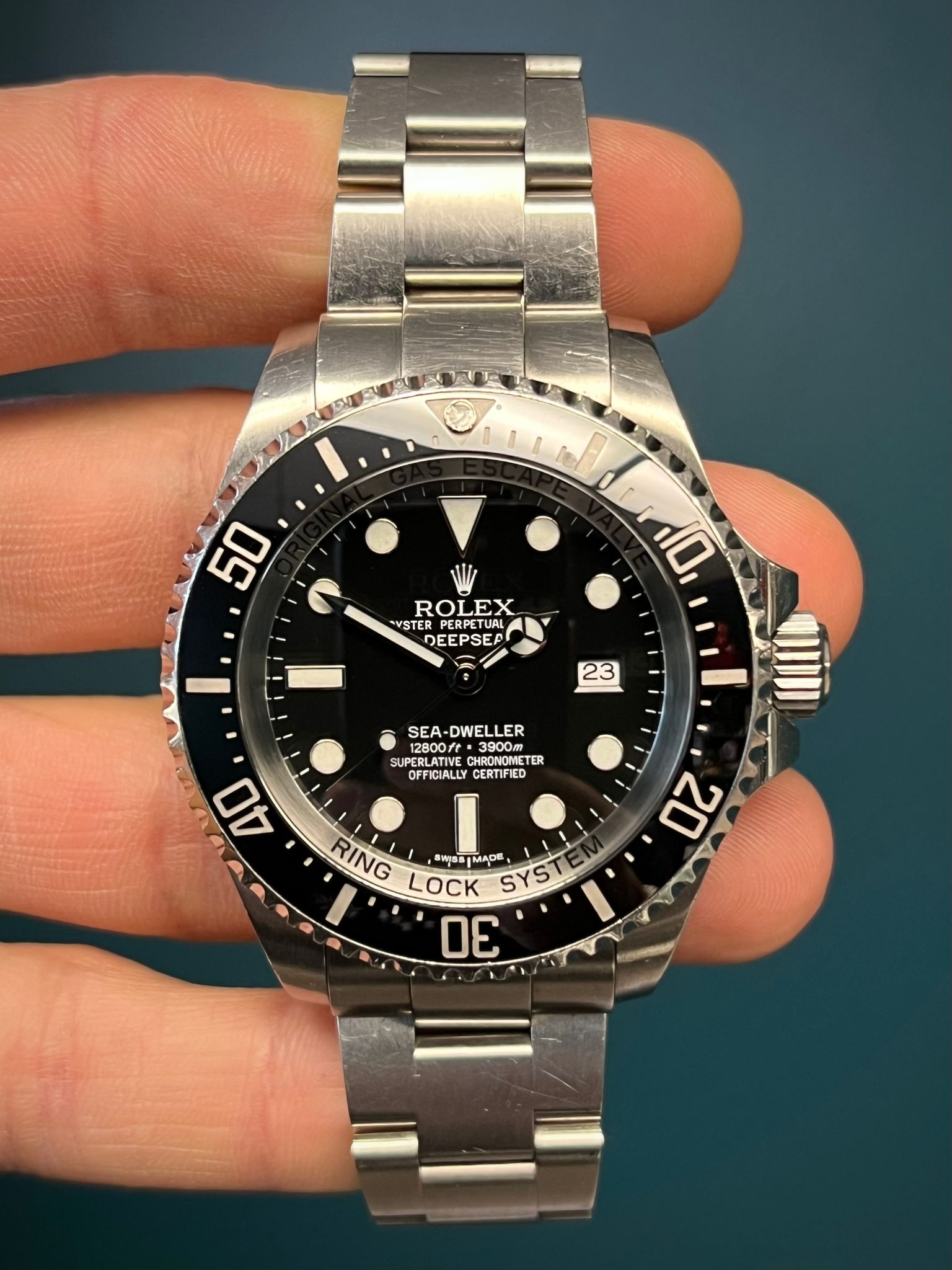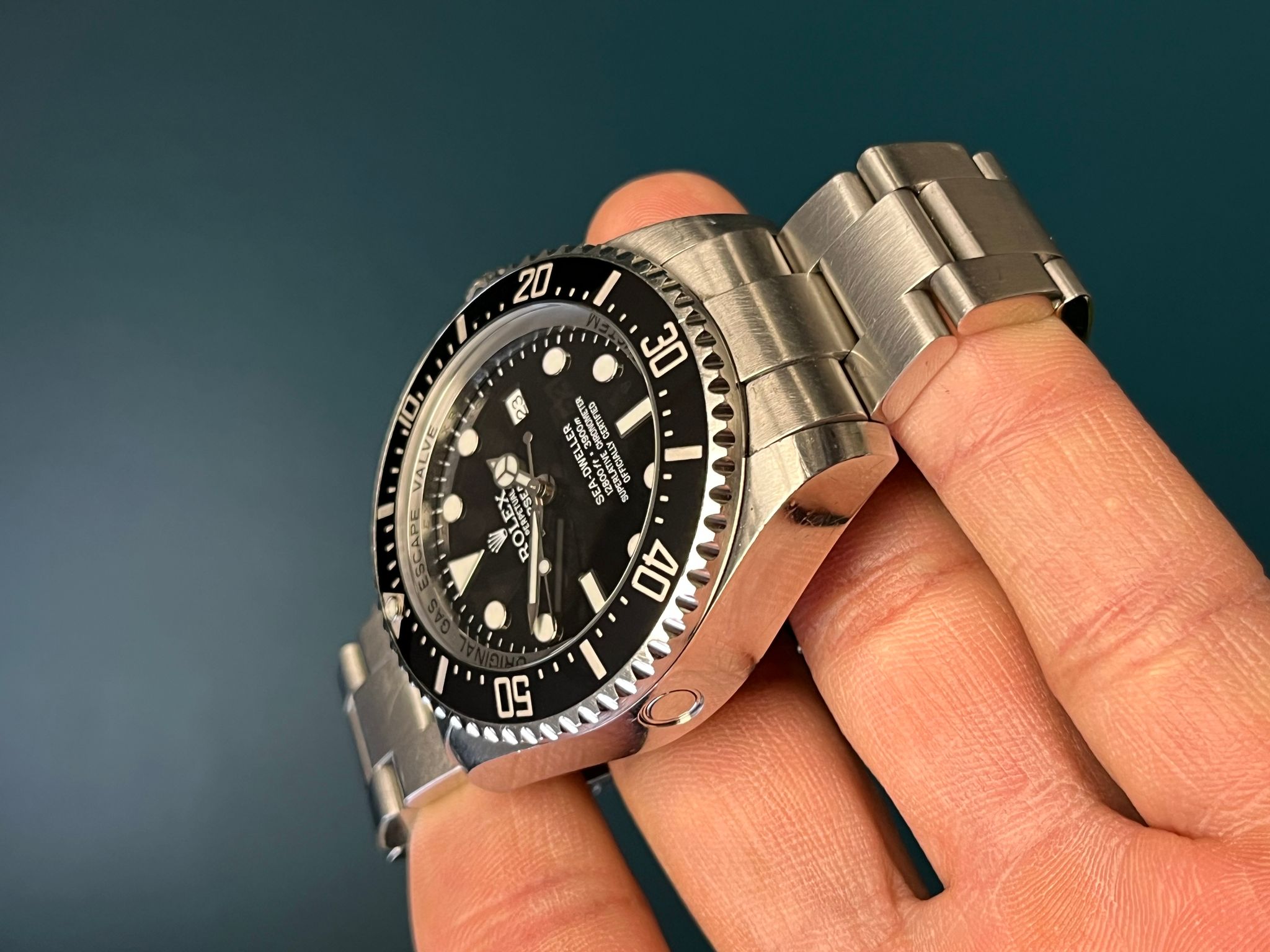 The Rolex Sea-Dweller Deepsea Reference 116660 is a professional-grade dive watch built to withstand extreme underwater conditions. Crafted from robust 904L stainless steel, its 44mm case is engineered with Rolex’s patented Ringlock System, allowing for an impressive water resistance of up to 3,900 meters (12,800 feet). The helium escape valve ensures reliability during saturation dives, while the unidirectional Cerachrom bezel with platinum-coated numerals provides precise dive timing. The black dial features Chromalight luminescence for superior readability in low-light conditions, along with the signature "Deepsea" inscription. Powered by Rolex’s Caliber 3135 automatic movement, this timepiece delivers outstanding accuracy and durability. Finished with an Oyster bracelet equipped with a Glidelock extension system, the Sea-Dweller Deepsea 116660 is a true tool watch built for the most demanding underwater explorers.