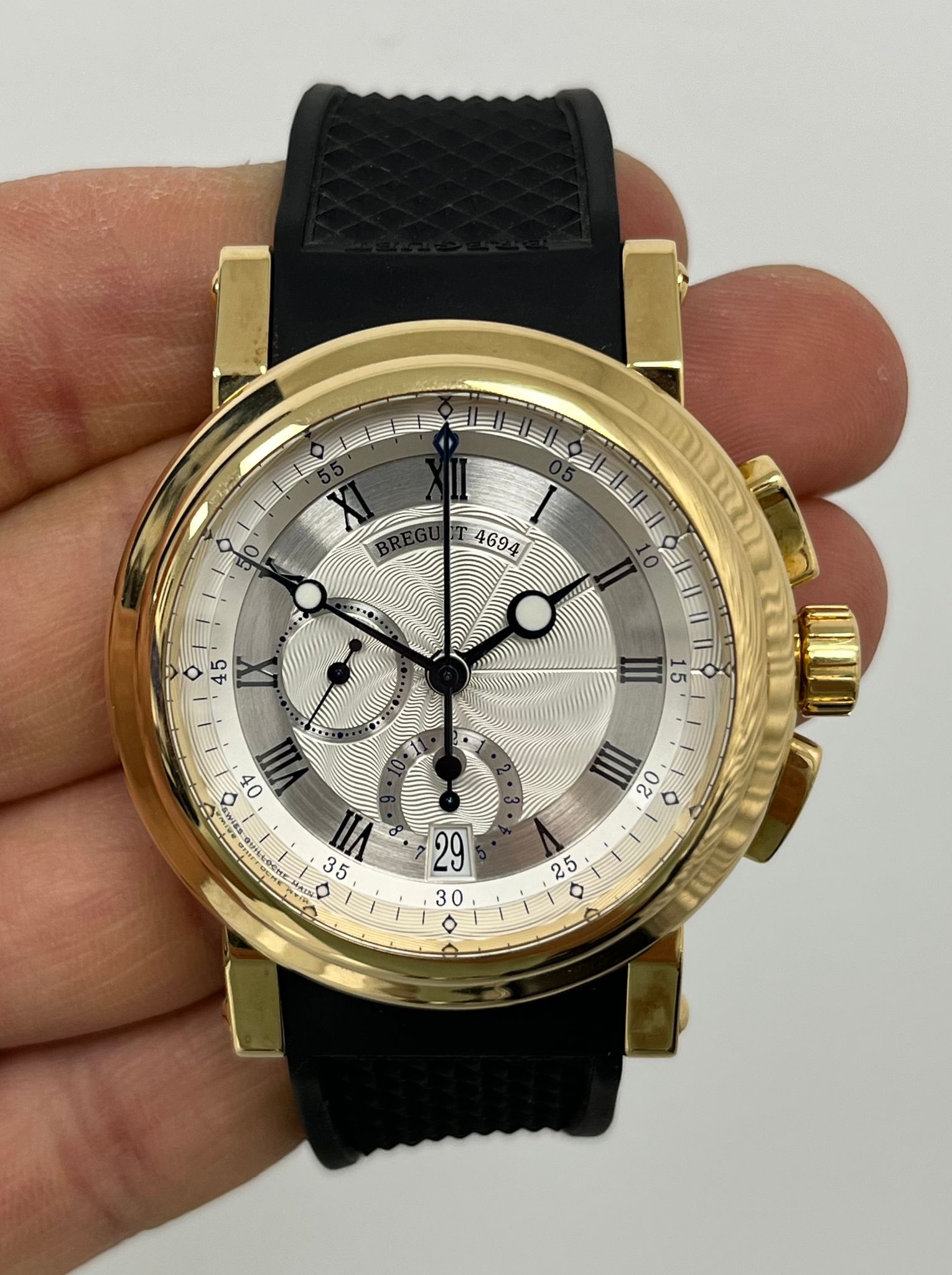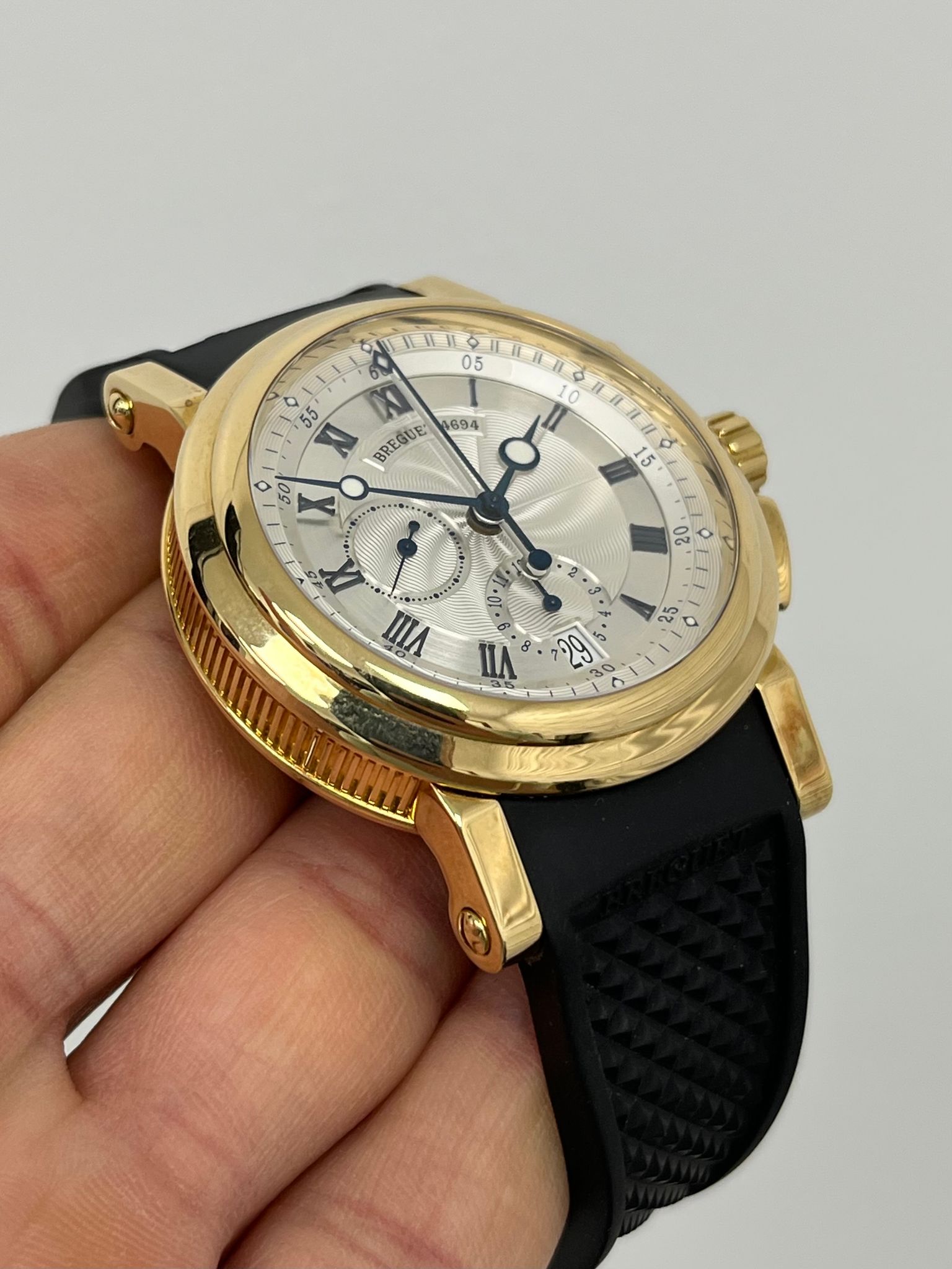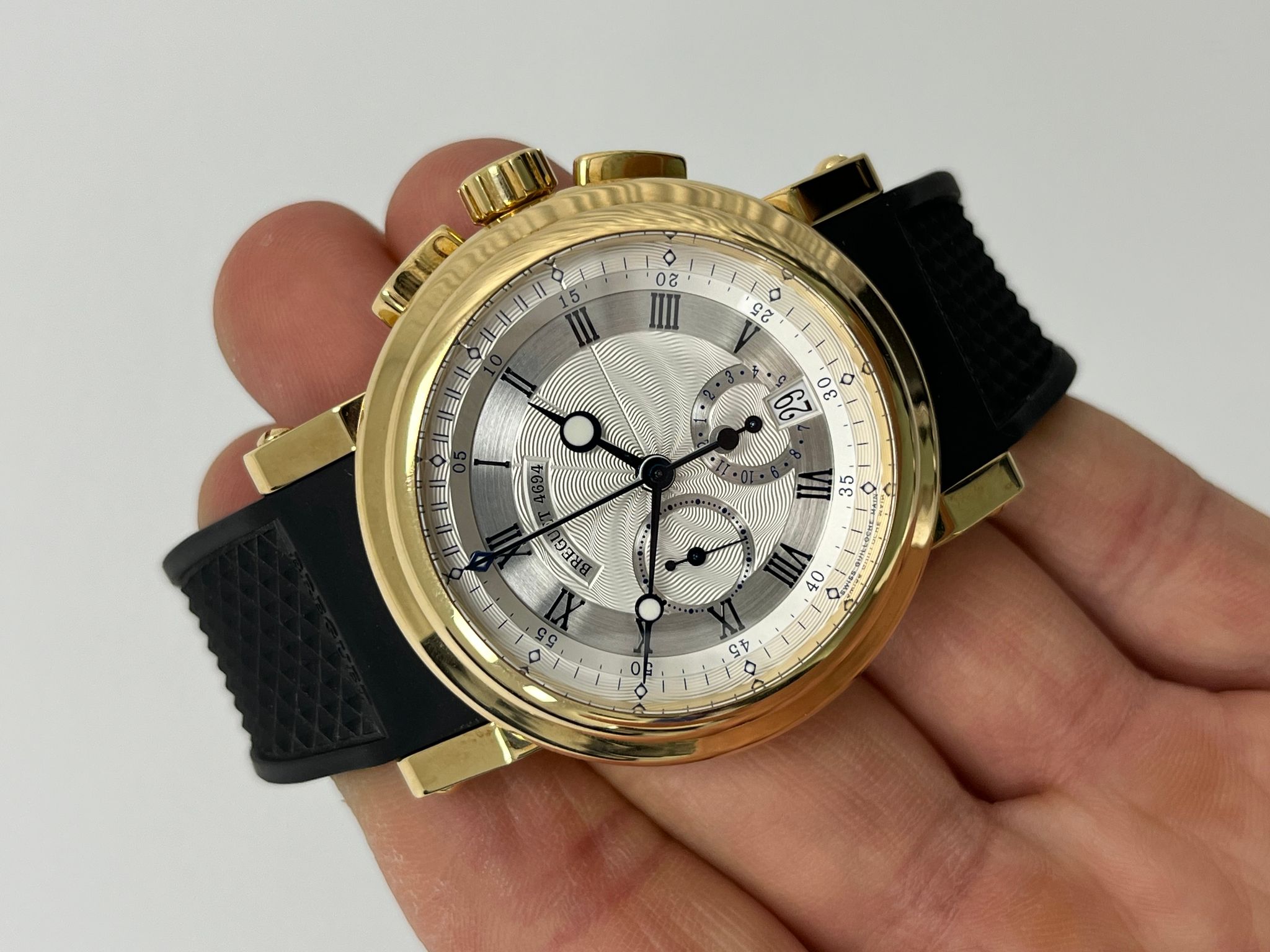 The Breguet Marine Chronograph Reference 5827BA is a stunning example of the brand’s mastery in haute horology, combining classic elegance with modern sportiness. Encased in luxurious 18k yellow gold, this timepiece features a beautifully engine-turned silvered gold dial with Roman numerals, signature Breguet hands, and a wave-pattern guilloché motif that enhances its refined aesthetic. The chronograph function is seamlessly integrated with subdials at 6, and 9 o’clock, offering both precision and functionality. Powered by the automatic Breguet Caliber 583Q/1, the watch delivers exceptional performance with a smooth chronograph operation and impressive power reserve. Presented as a full set in excellent condition, this 5827BA retains its sharp case lines, crisp engravings, and an exceptionally well-preserved dial, making it a highly desirable piece for collectors and enthusiasts alike. A perfect fusion of maritime inspiration and horological excellence, this Breguet Marine Chronograph is a distinguished addition to any collection.
