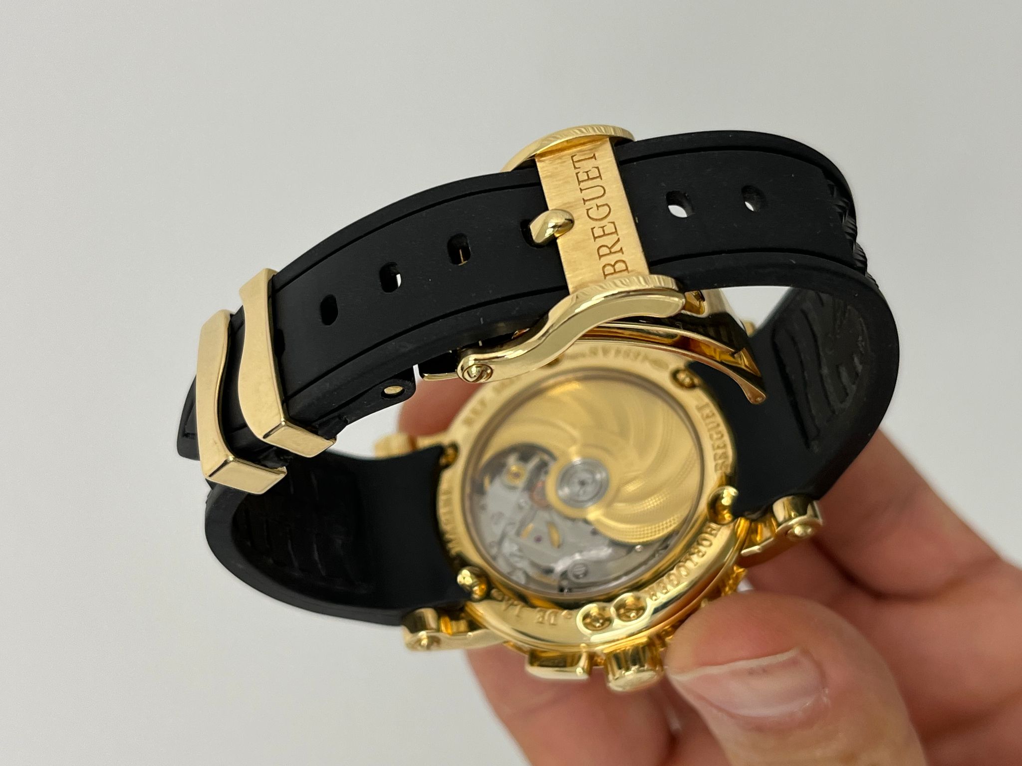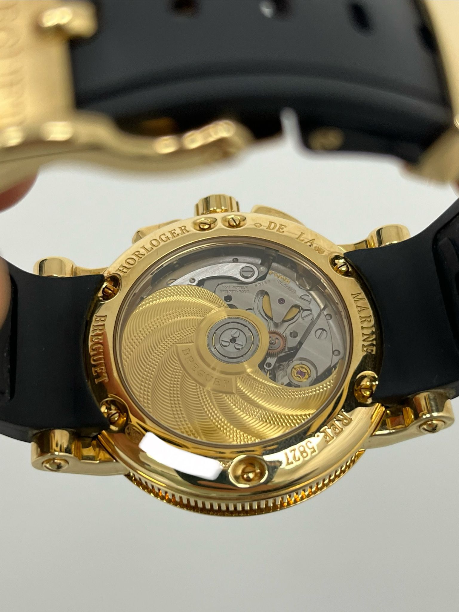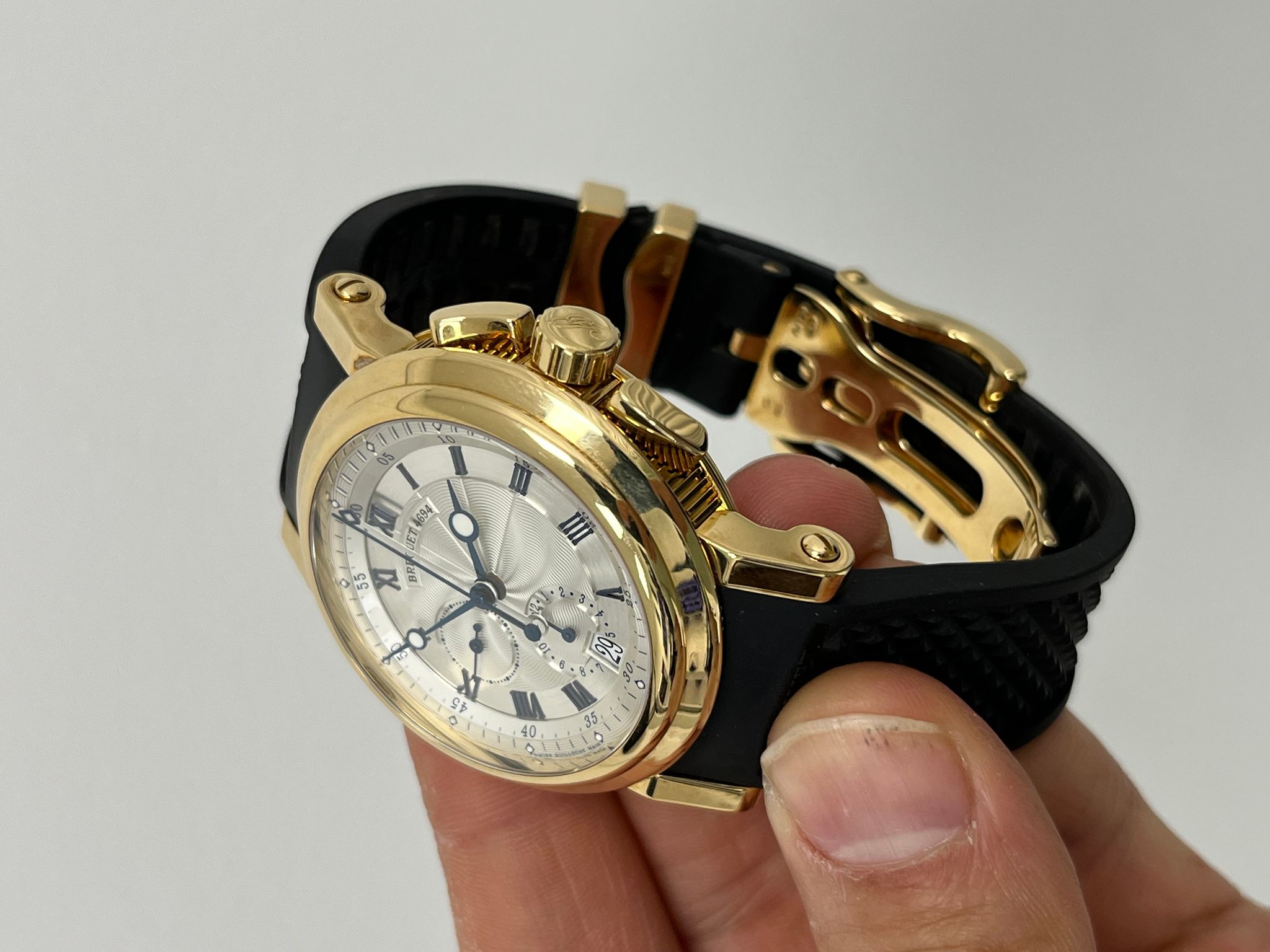 The Breguet Marine Chronograph Reference 5827BA is a stunning example of the brand’s mastery in haute horology, combining classic elegance with modern sportiness. Encased in luxurious 18k yellow gold, this timepiece features a beautifully engine-turned silvered gold dial with Roman numerals, signature Breguet hands, and a wave-pattern guilloché motif that enhances its refined aesthetic. The chronograph function is seamlessly integrated with subdials at 6, and 9 o’clock, offering both precision and functionality. Powered by the automatic Breguet Caliber 583Q/1, the watch delivers exceptional performance with a smooth chronograph operation and impressive power reserve. Presented as a full set in excellent condition, this 5827BA retains its sharp case lines, crisp engravings, and an exceptionally well-preserved dial, making it a highly desirable piece for collectors and enthusiasts alike. A perfect fusion of maritime inspiration and horological excellence, this Breguet Marine Chronograph is a distinguished addition to any collection.