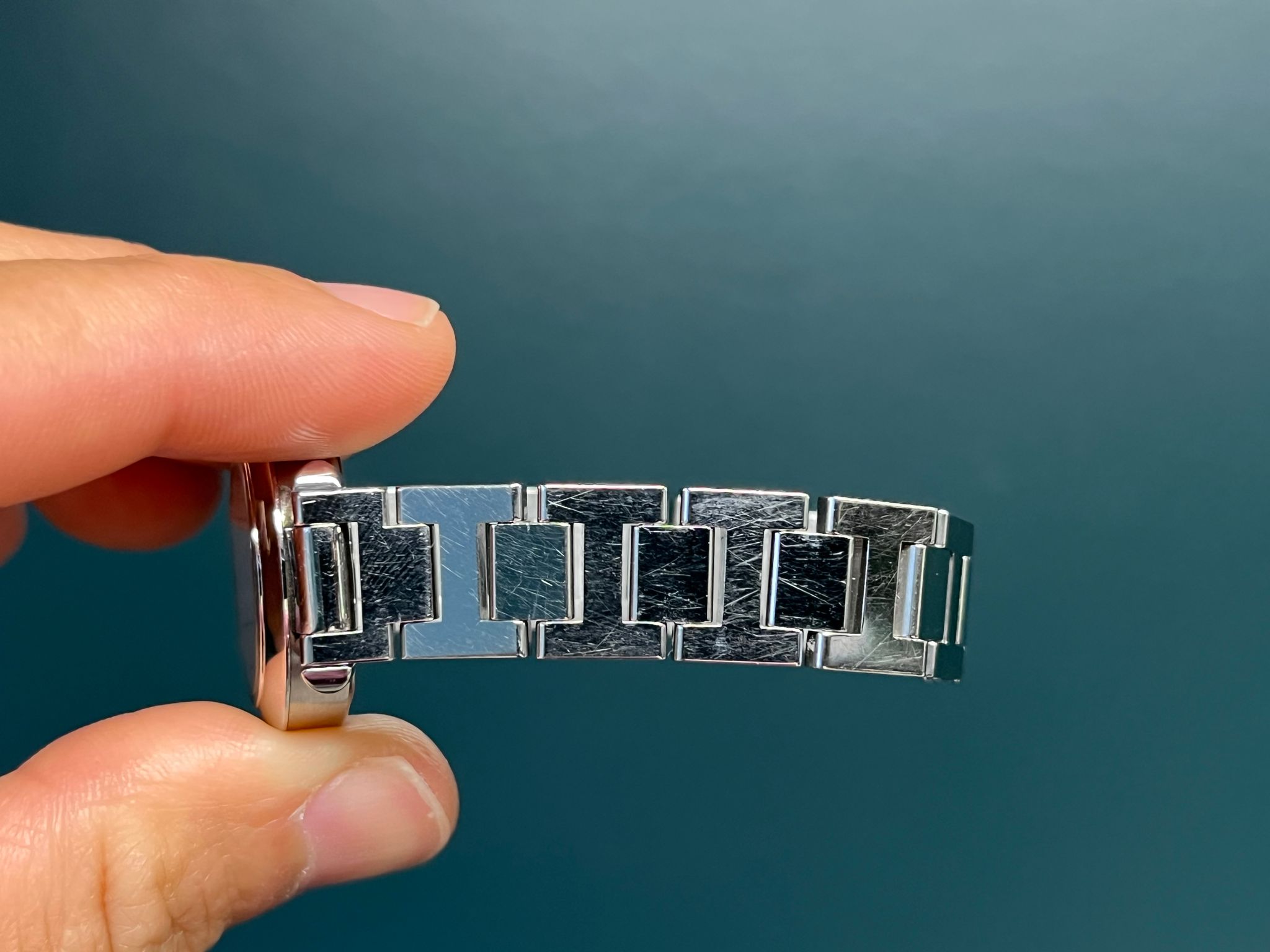 Today's example is in very nice preowned condition, The dial is mint and the quartz movement is keeping time with a new battery. The bracelet is long and has a total of 8 removable links and shows no stretch. This example is accompanied by its full complete set dated 11/14/13.