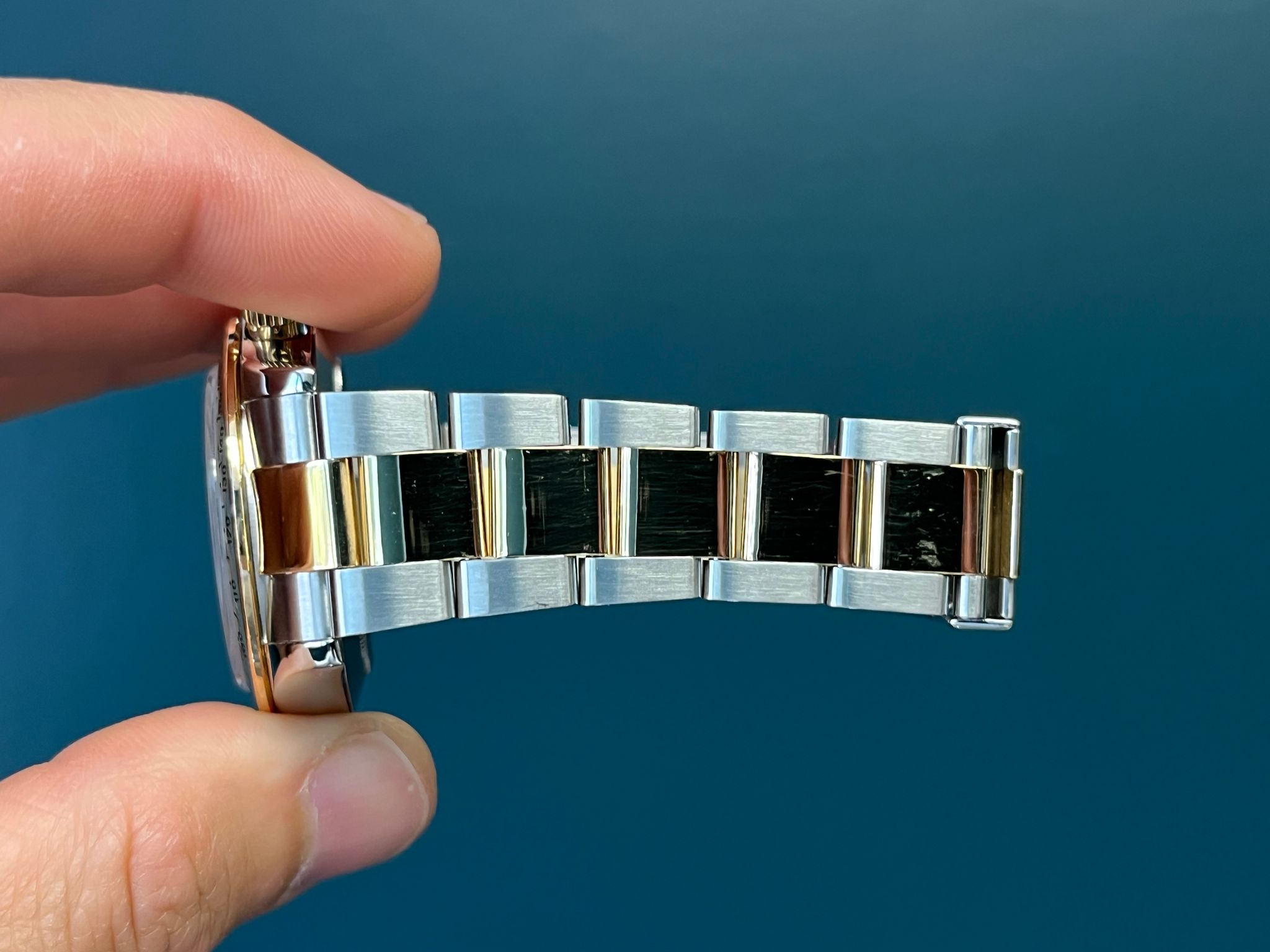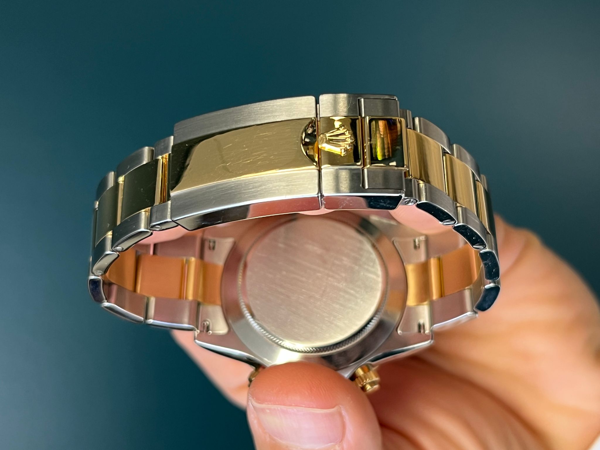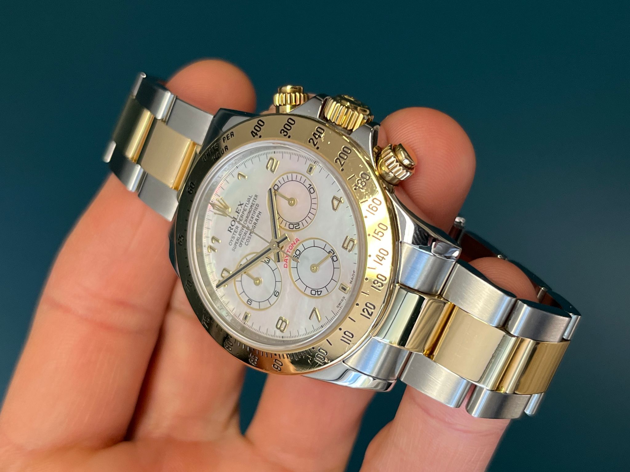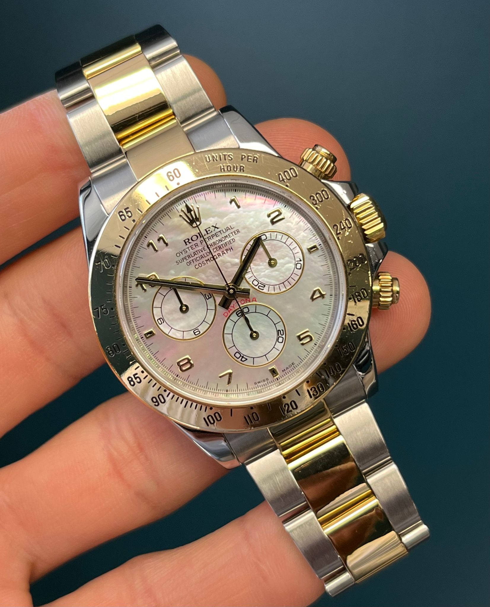 The Rolex Daytona Reference 116523 is a stunning fusion of luxury and performance, showcasing a sophisticated two-tone design crafted from stainless steel and 18k yellow gold. This iconic chronograph features a sleek, scratch-resistant sapphire crystal and a mother of pearl dial for precise time tracking. Driven by the high-performance Rolex Caliber 4130 automatic movement, it guarantees exceptional accuracy and reliability. The engraved tachymetric scale on the bezel makes it perfect for high-speed pursuits, cementing its status as a favorite among racing enthusiasts and collectors. The Daytona 116523 is a timeless embodiment of Rolex's commitment to excellence and innovation.