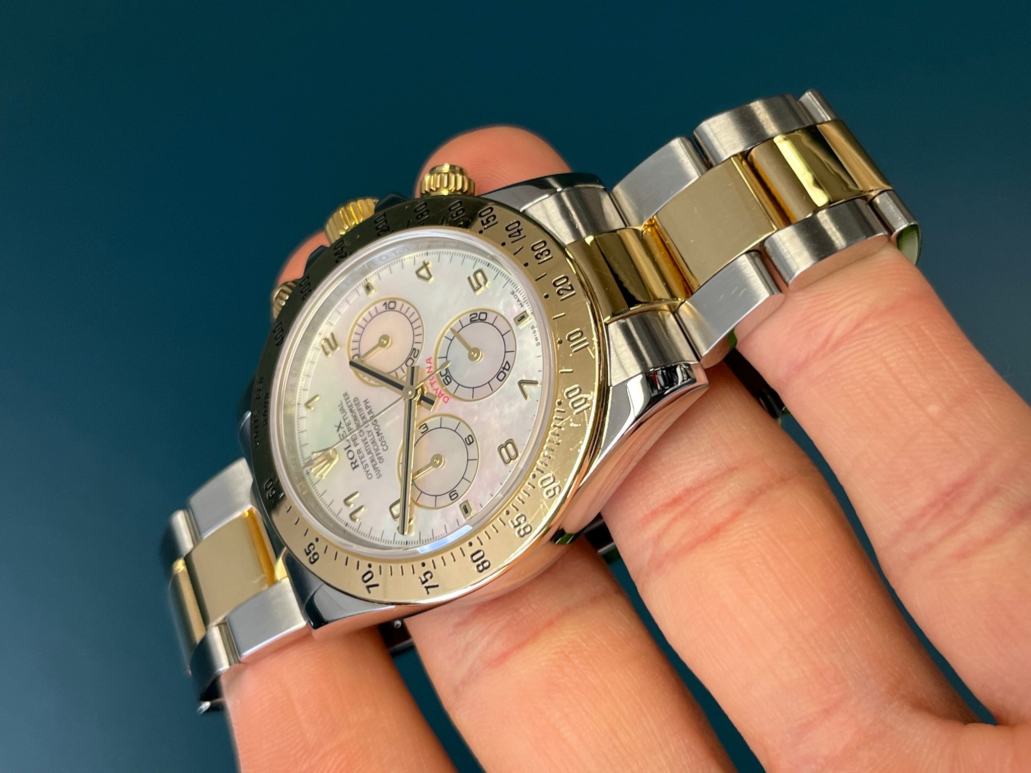 Today we bring you a top condition 116523 Mother of Pearl Daytona. This example features an excellent case and crisp bezel with engraved rehault. The Mother of Pearl dial is mint showing no visible wear. The solid link oyster bracelet with solid end links has 10.5 total links and is excellent showing no stretch. The chronograph feature is running perfect resetting at 12 and keeping great time. Just an overall excellent example of a reference 116523 with papers.