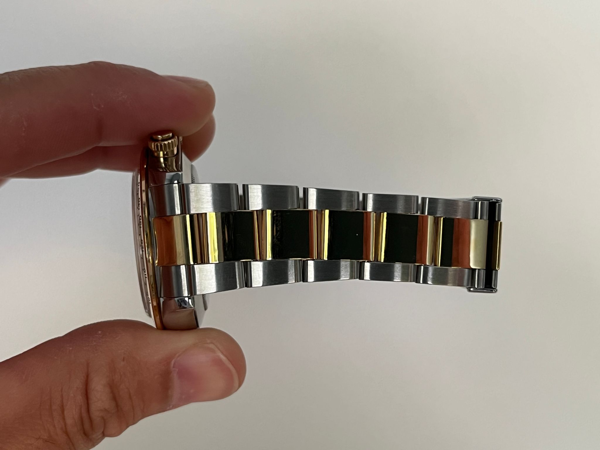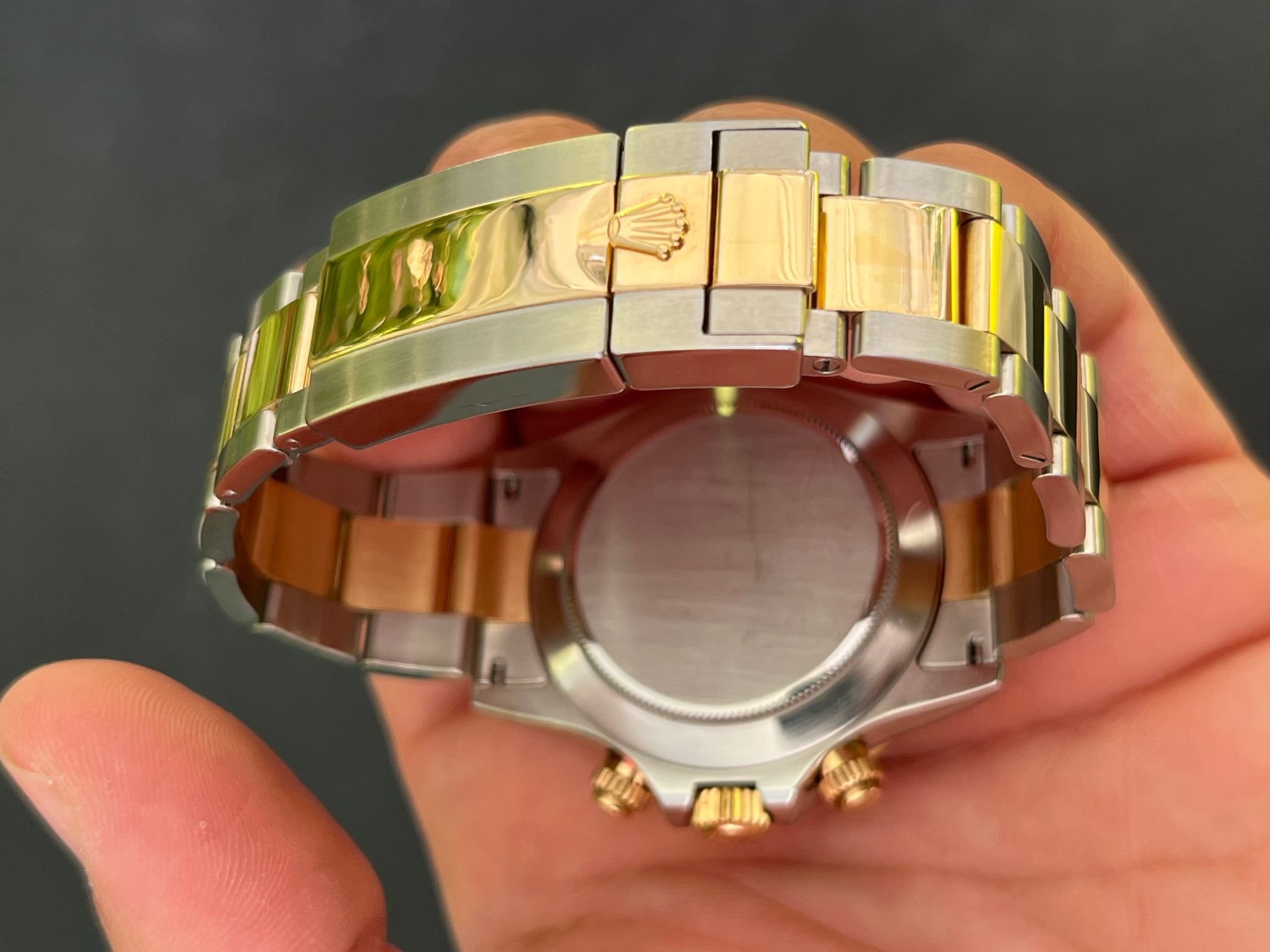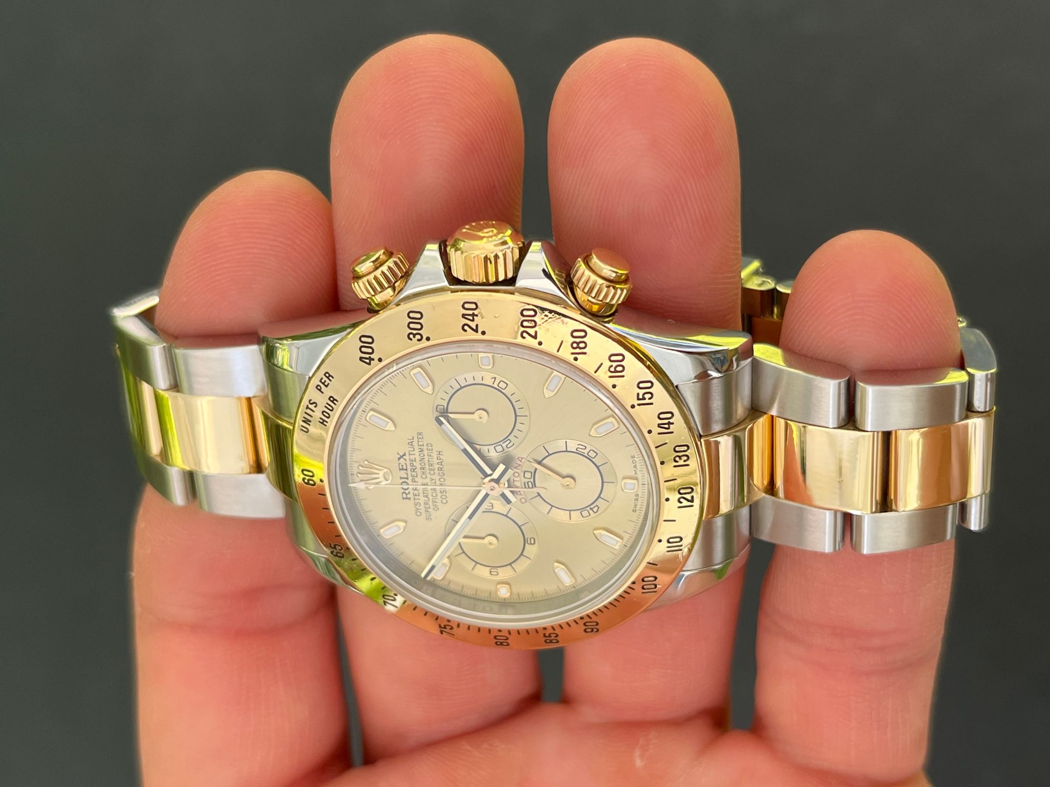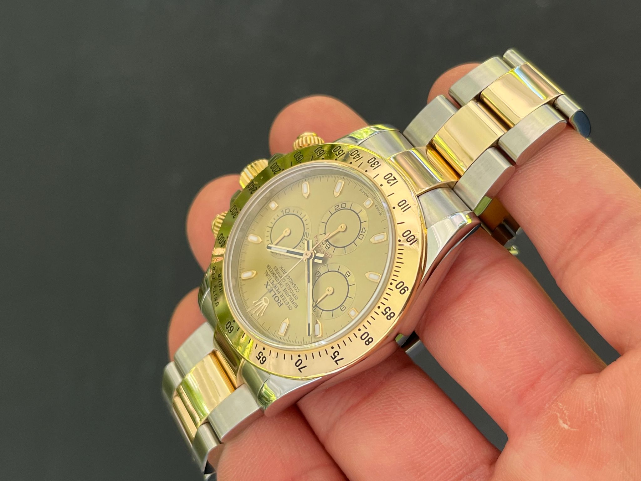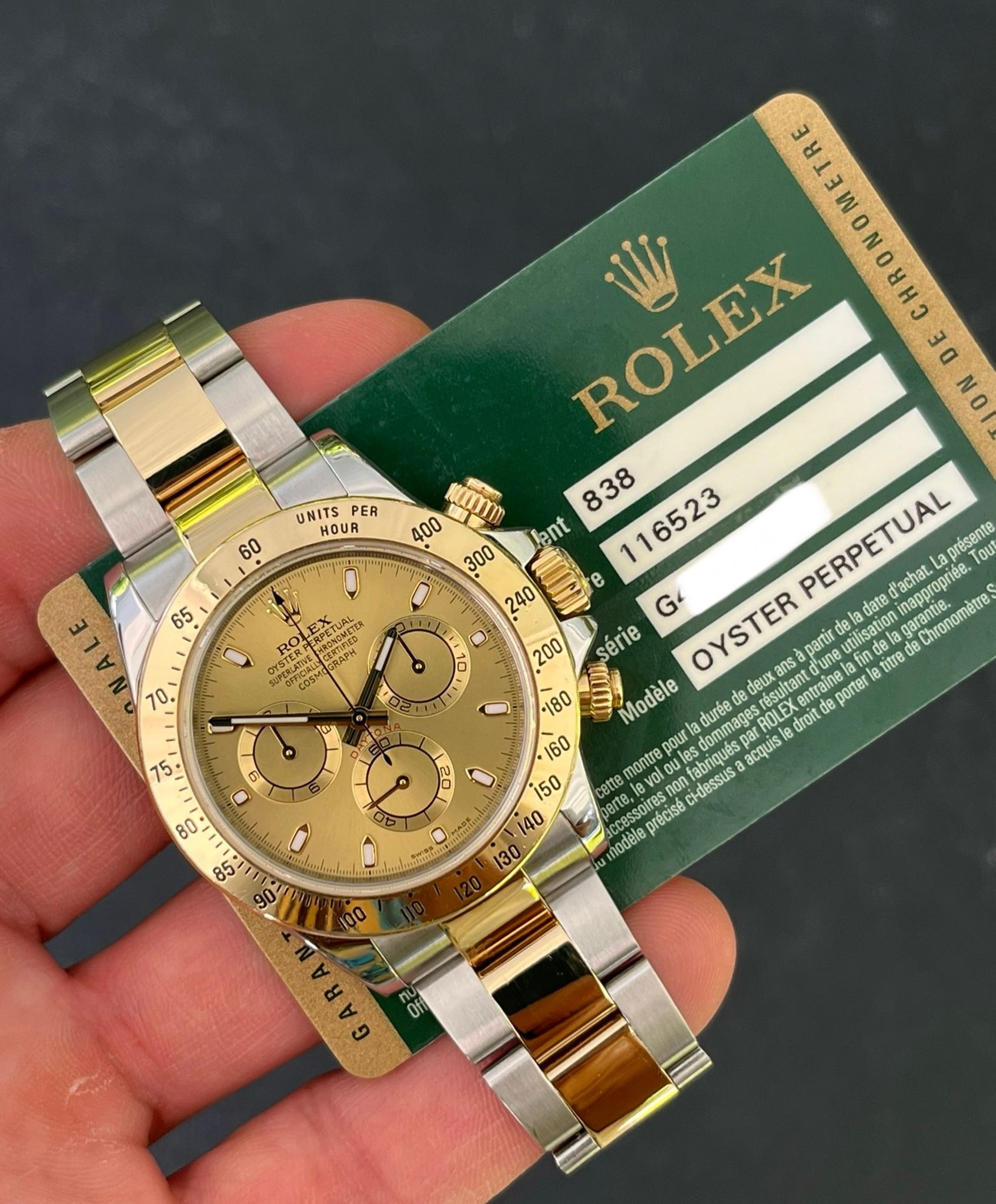 The Rolex Daytona Reference 116523 is a stunning fusion of luxury and performance, showcasing a sophisticated two-tone design crafted from stainless steel and 18k yellow gold. This iconic chronograph features a sleek, scratch-resistant sapphire crystal and a choice of dials with gold-trimmed sub-dials for precise time tracking. Driven by the high-performance Rolex Caliber 4130 automatic movement, it guarantees exceptional accuracy and reliability. The engraved tachymetric scale on the bezel makes it perfect for high-speed pursuits, cementing its status as a favorite among racing enthusiasts and collectors. The Daytona 116523 is a timeless embodiment of Rolex's commitment to excellence and innovation.
