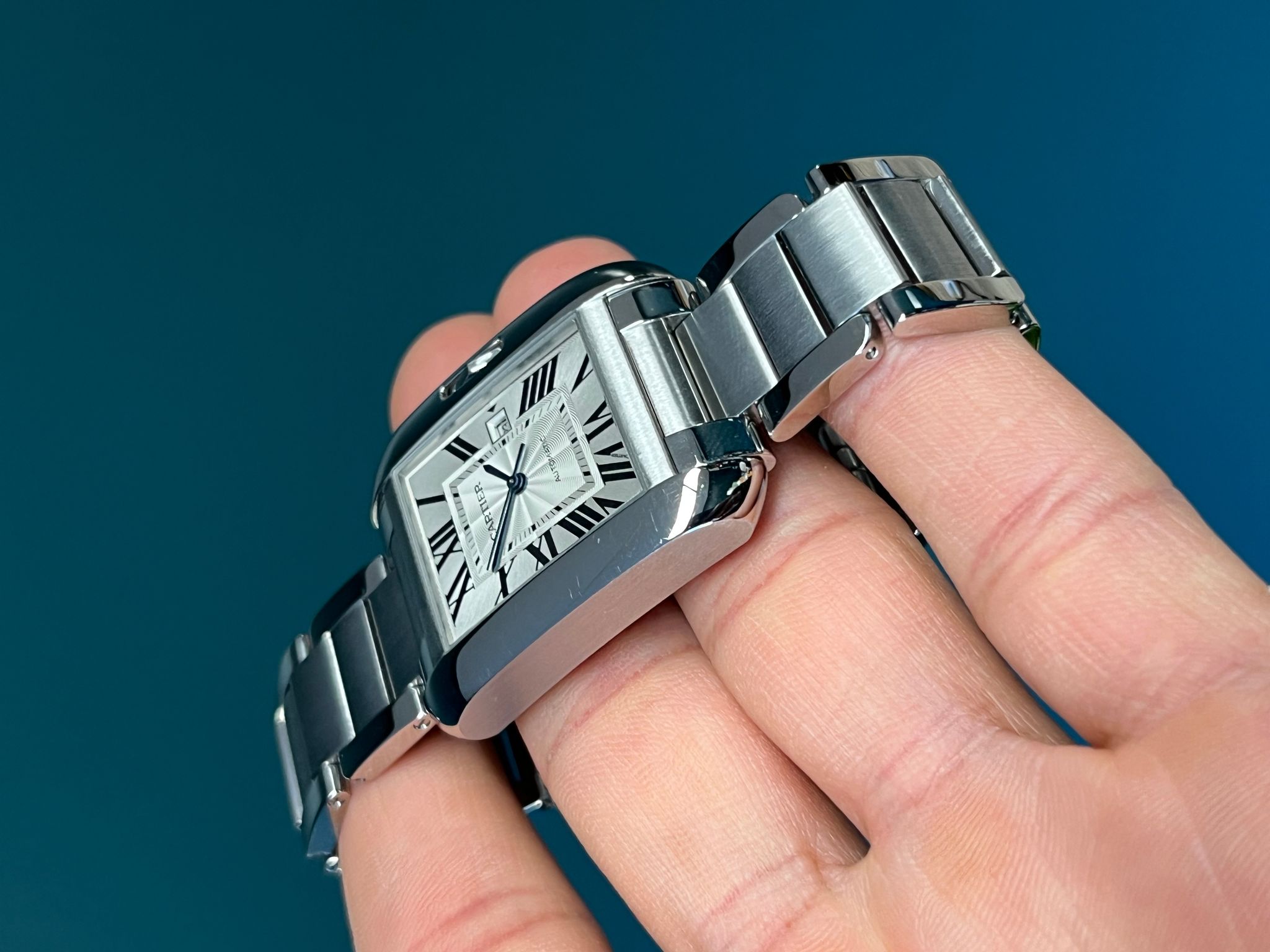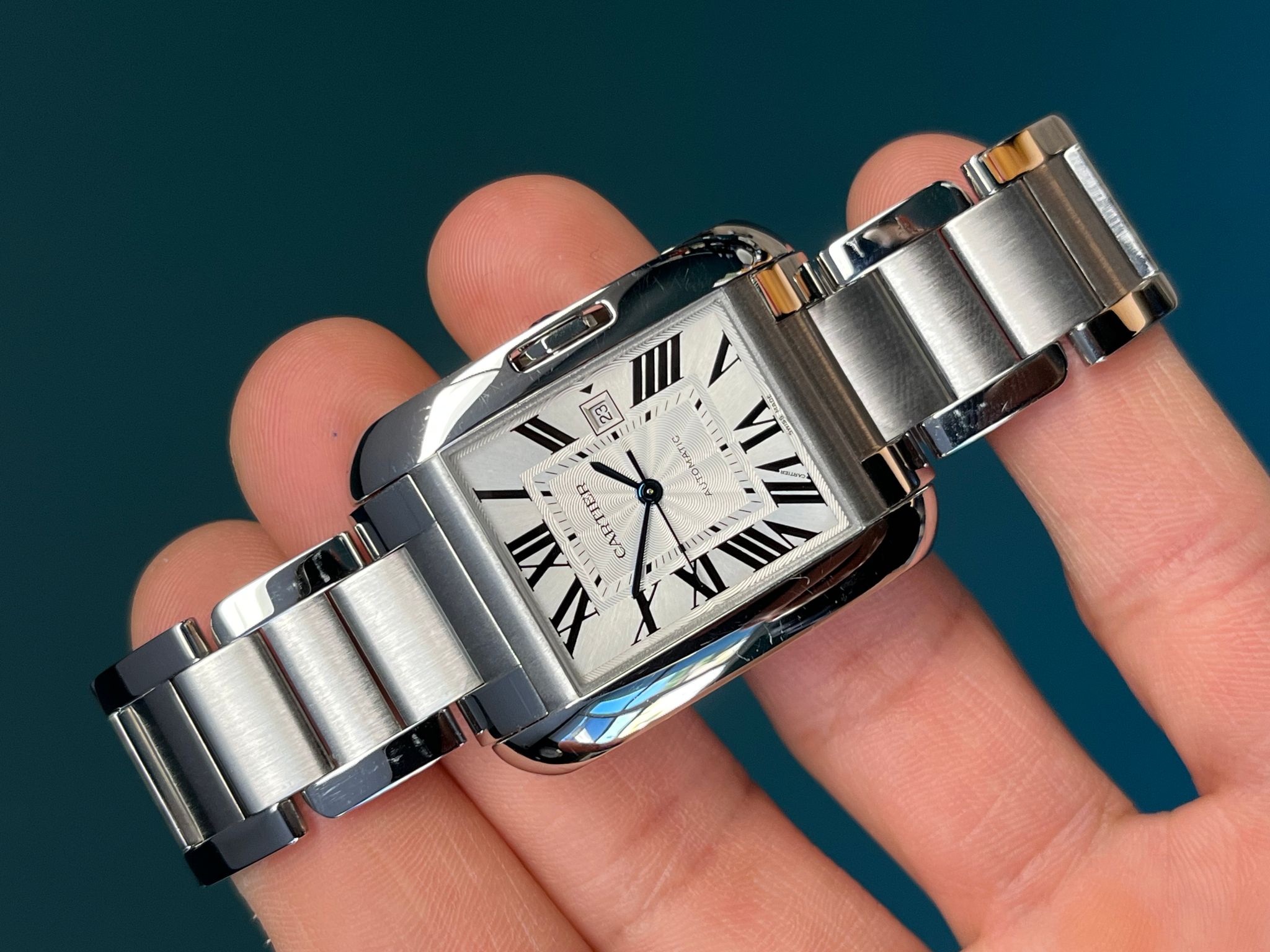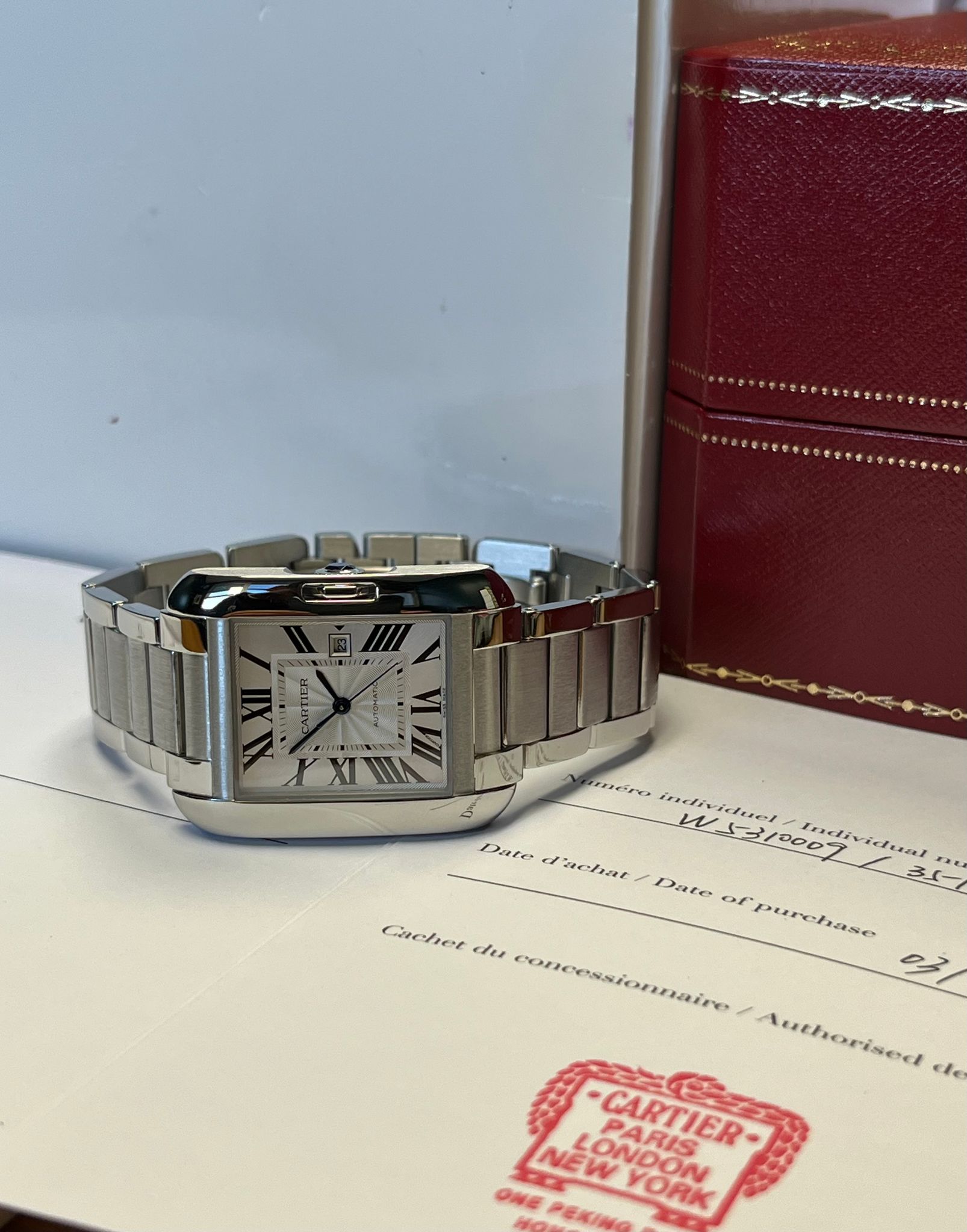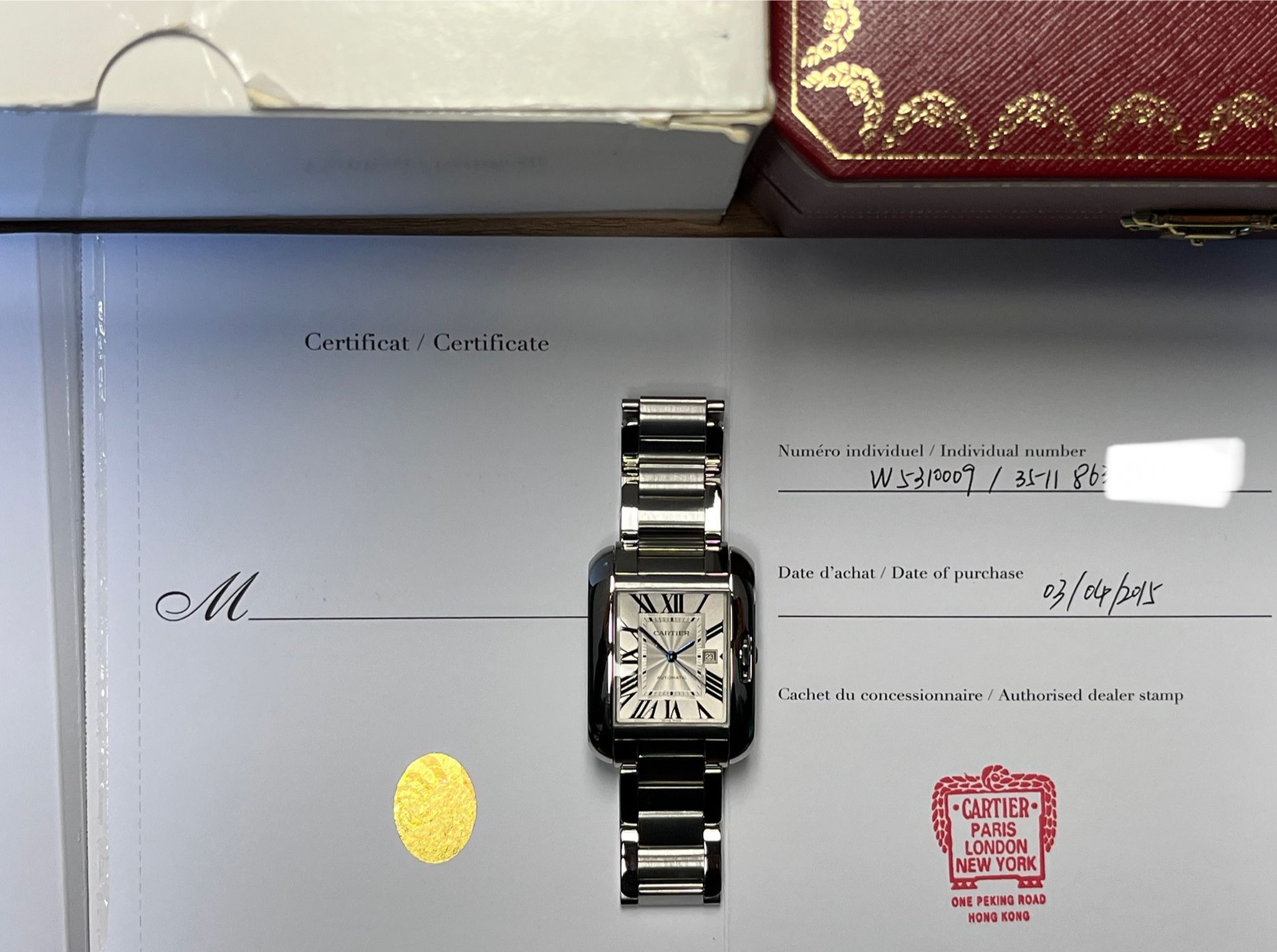 Today's example comes to us in like new condition and as a full complete set dated 3/4/15. Accompanied by its full complete set, this example comes to us in mint condition, unpolished and fully linked and can pass as new unworn. Here is your chance to own a very minty example of the Tank Anglaise line.