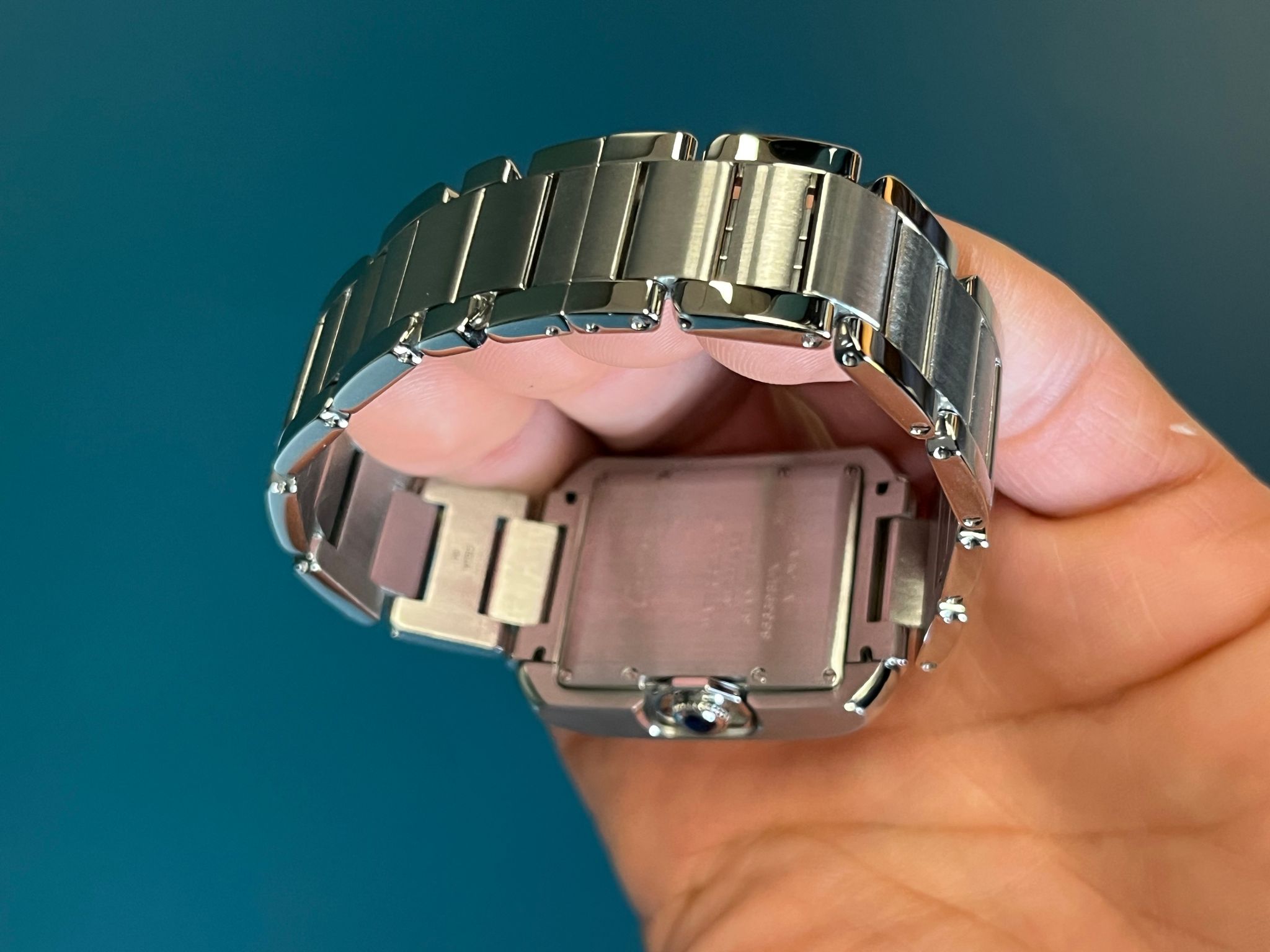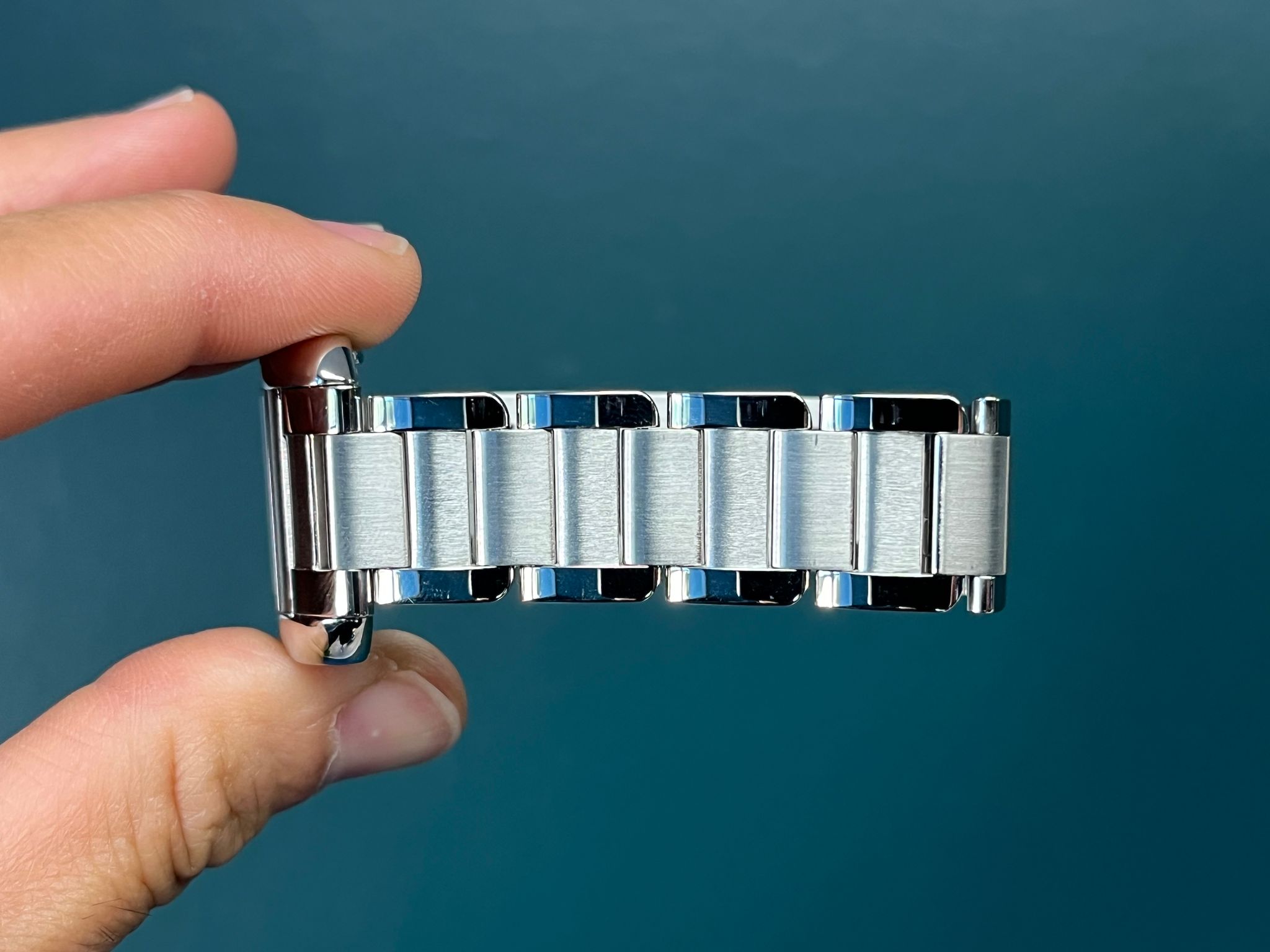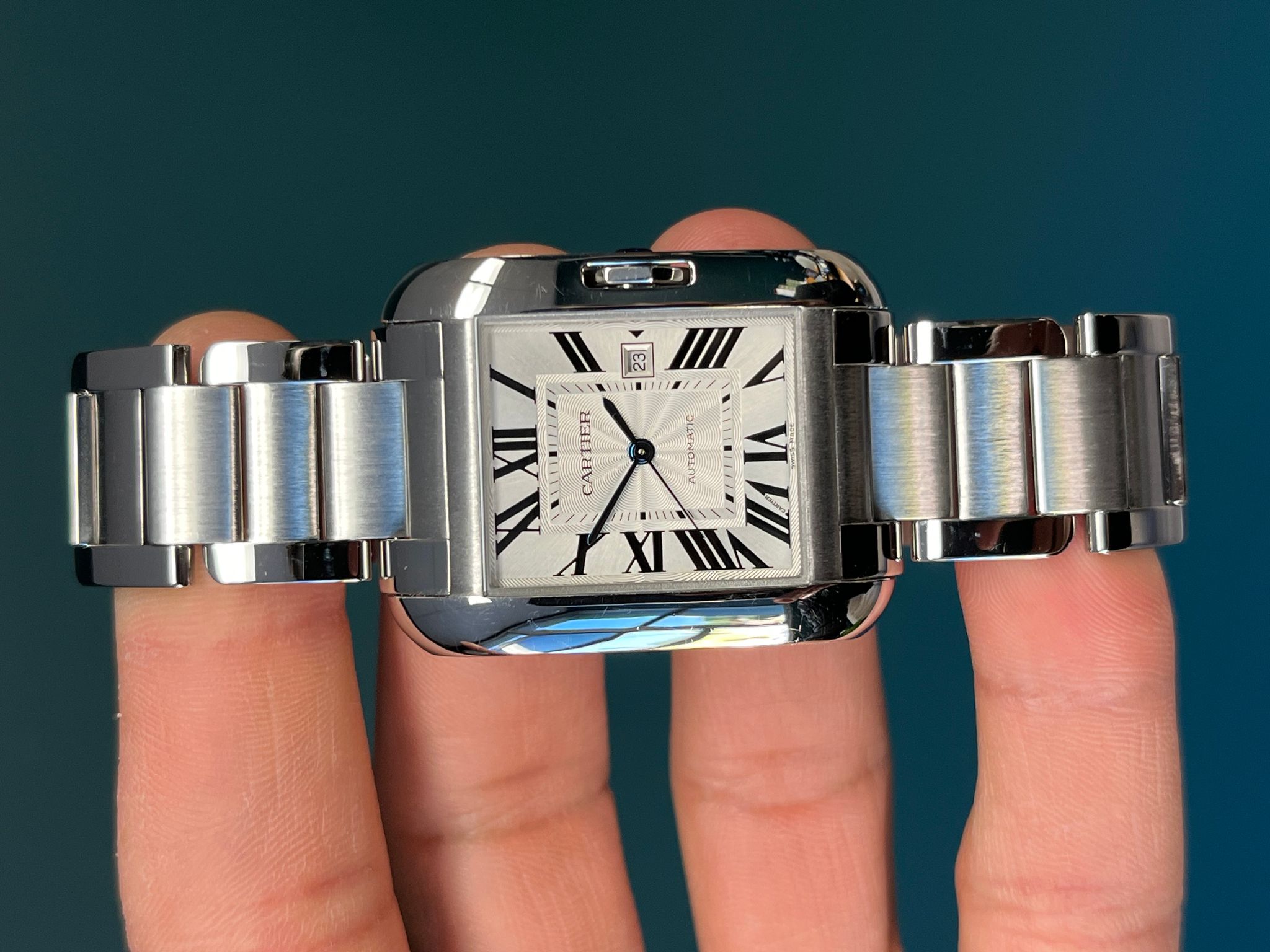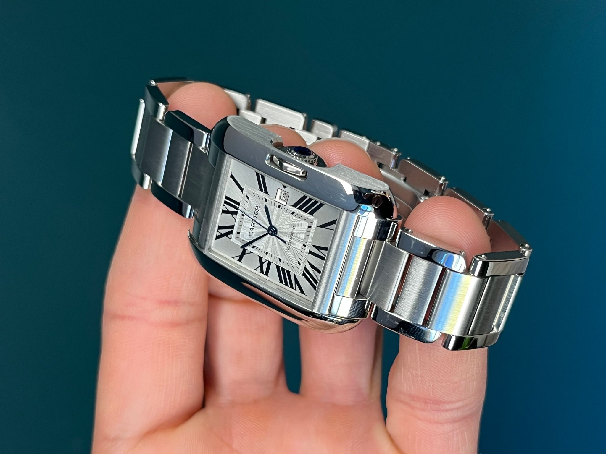 Today's example comes to us in like new condition and as a full complete set dated 3/4/15. Accompanied by its full complete set, this example comes to us in mint condition, unpolished and fully linked and can pass as new unworn. Here is your chance to own a very minty example of the Tank Anglaise line.