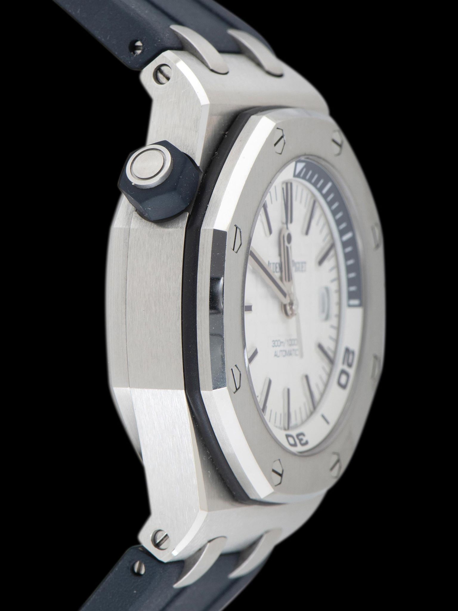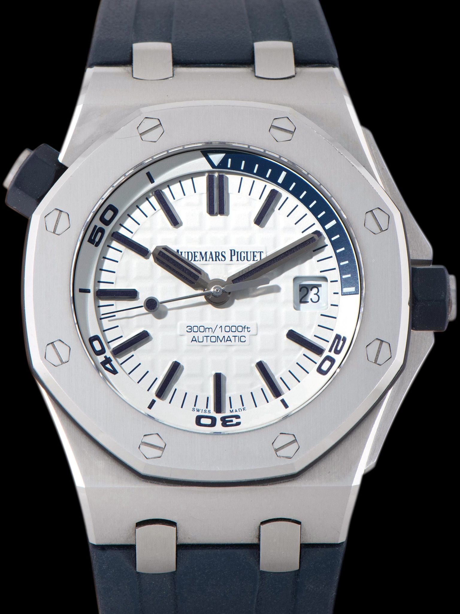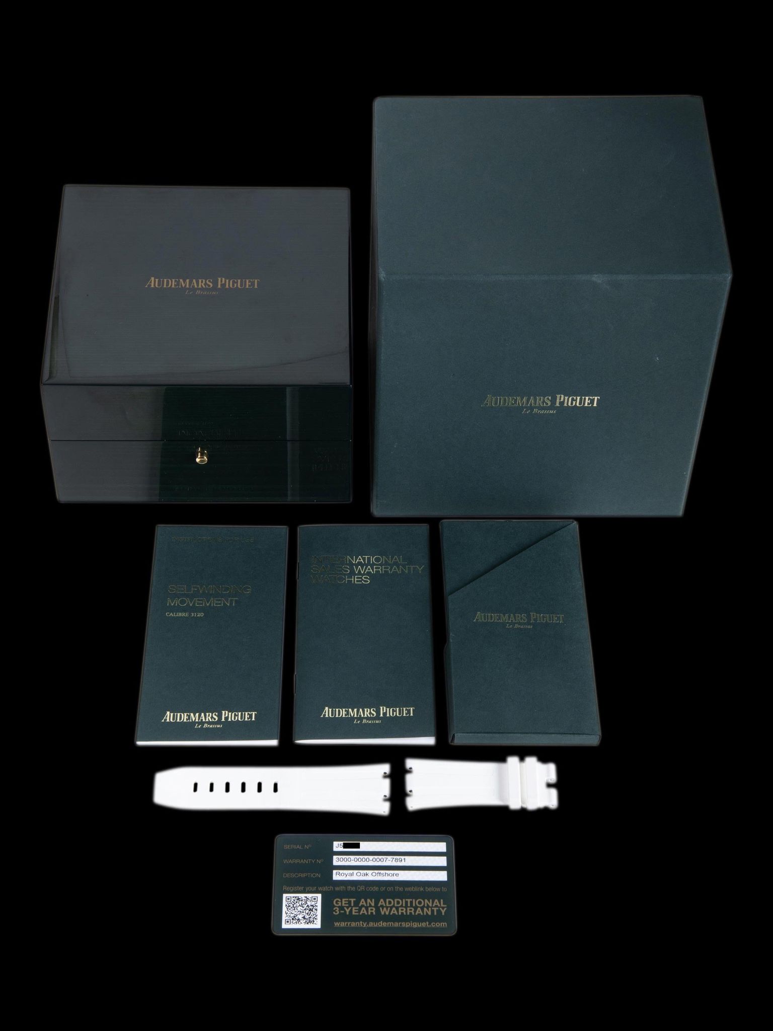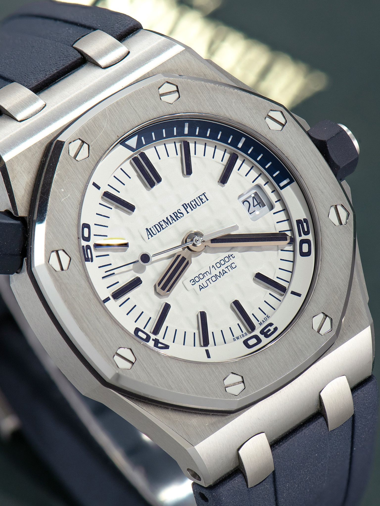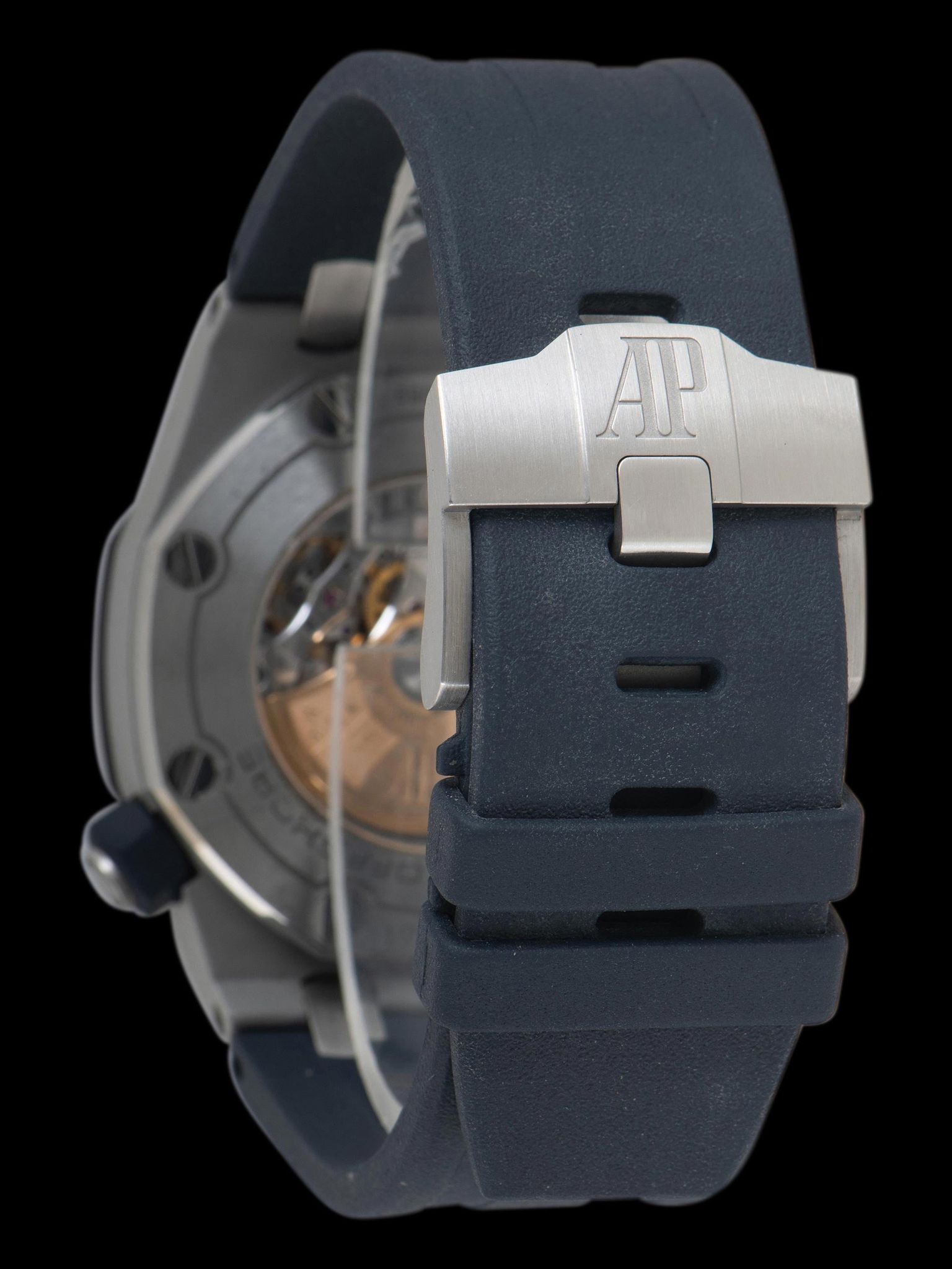 The noble and robust stainless steel case is in unpolished condition with the factory finishing and bevels on full display throughout the case and bracelet while showing only very minimal signs of use. The navy blue rubber-capped crown and bezel adjuster remain original and fully intact. The sapphire display case back exhibits no notable wear, with all of the factory engravings remaining in unpolished condition. The watch comes on its original 2pc navy blue rubber strap with the original stainless steel Audemars Piguet tang buckle. The watch also comes with an original white rubber Audemars Piguet strap.