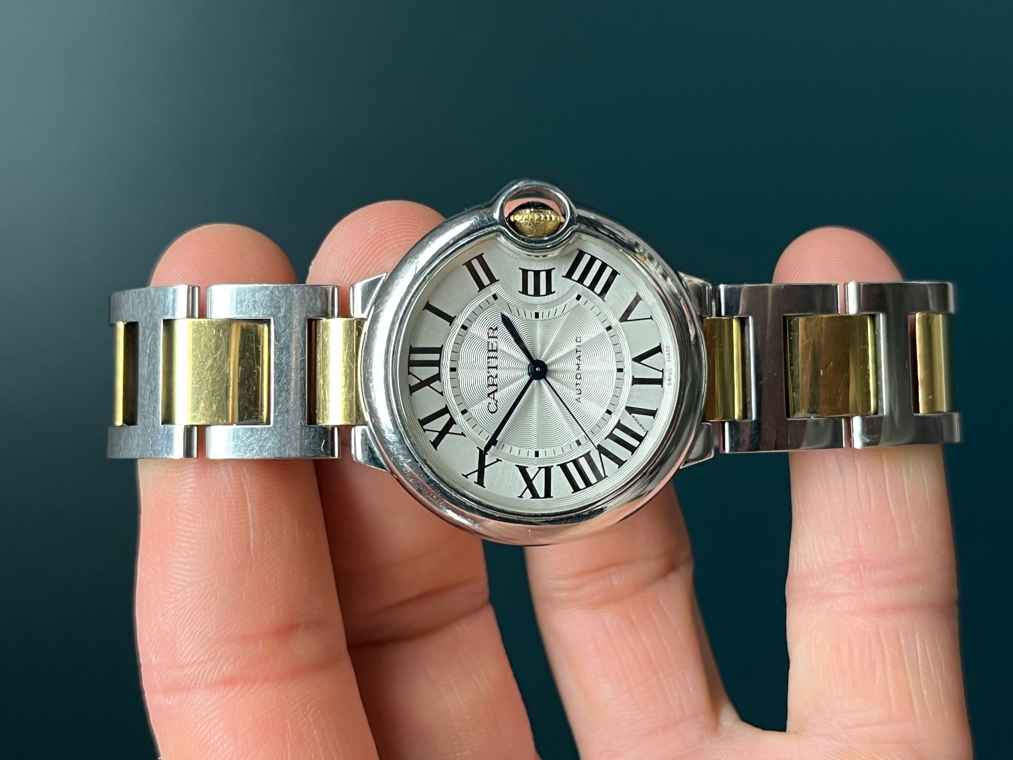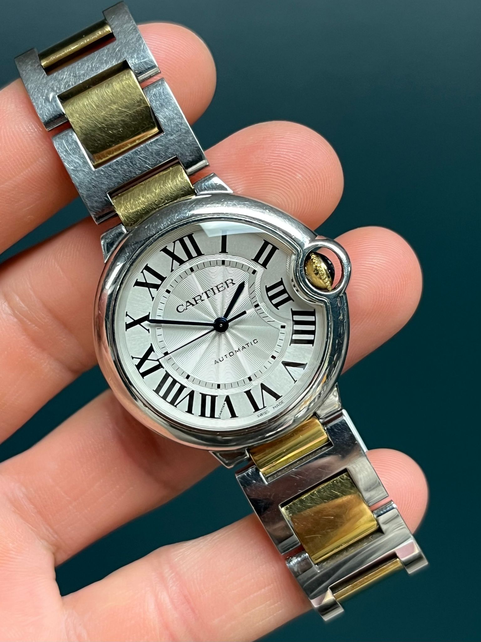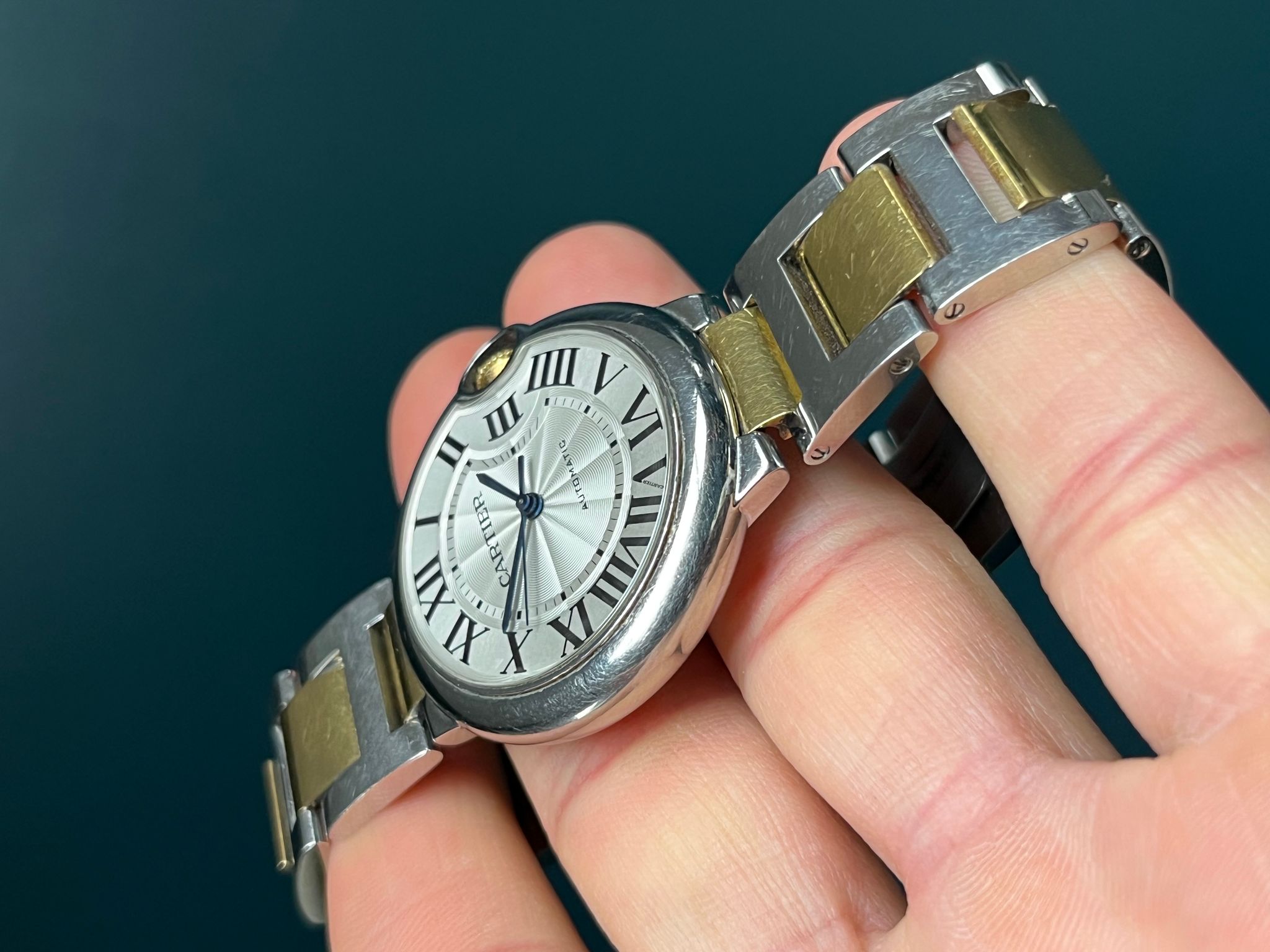 The Cartier Ballon Bleu Reference 3284 (W2BB0012) is a stunning fusion of elegance and contemporary craftsmanship accompanied by its original warranty papers dated 2017. This exquisite timepiece showcases a luxurious two-tone design, combining 18k yellow gold and stainless steel for a refined aesthetic. The signature rounded case, is accentuated by Cartier’s signature fluted crown set with a blue cabochon spinel. What truly sets this model apart is its original papers, which elevates the watch’s sophistication. The dial is an excellent silvered guilloché dial. Blued steel hands glide effortlessly over the dial, enhancing its timeless allure. Powered by a precise automatic movement, this watch is as reliable as it is stylish. Perfect for those who appreciate classic Cartier charm with a touch of luxury, the Ballon Bleu 3284 is an exquisite statement piece. The bracelet on this example is fully linked and shows no stretch.