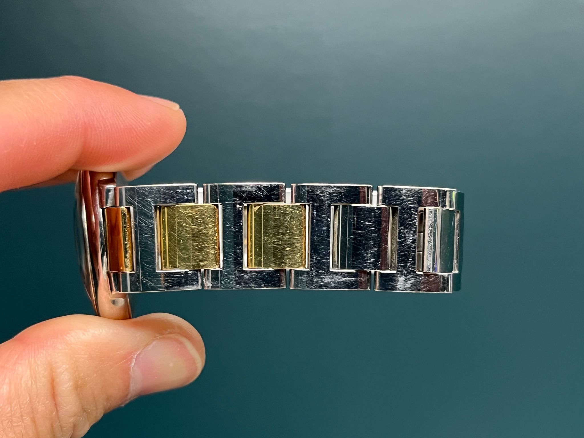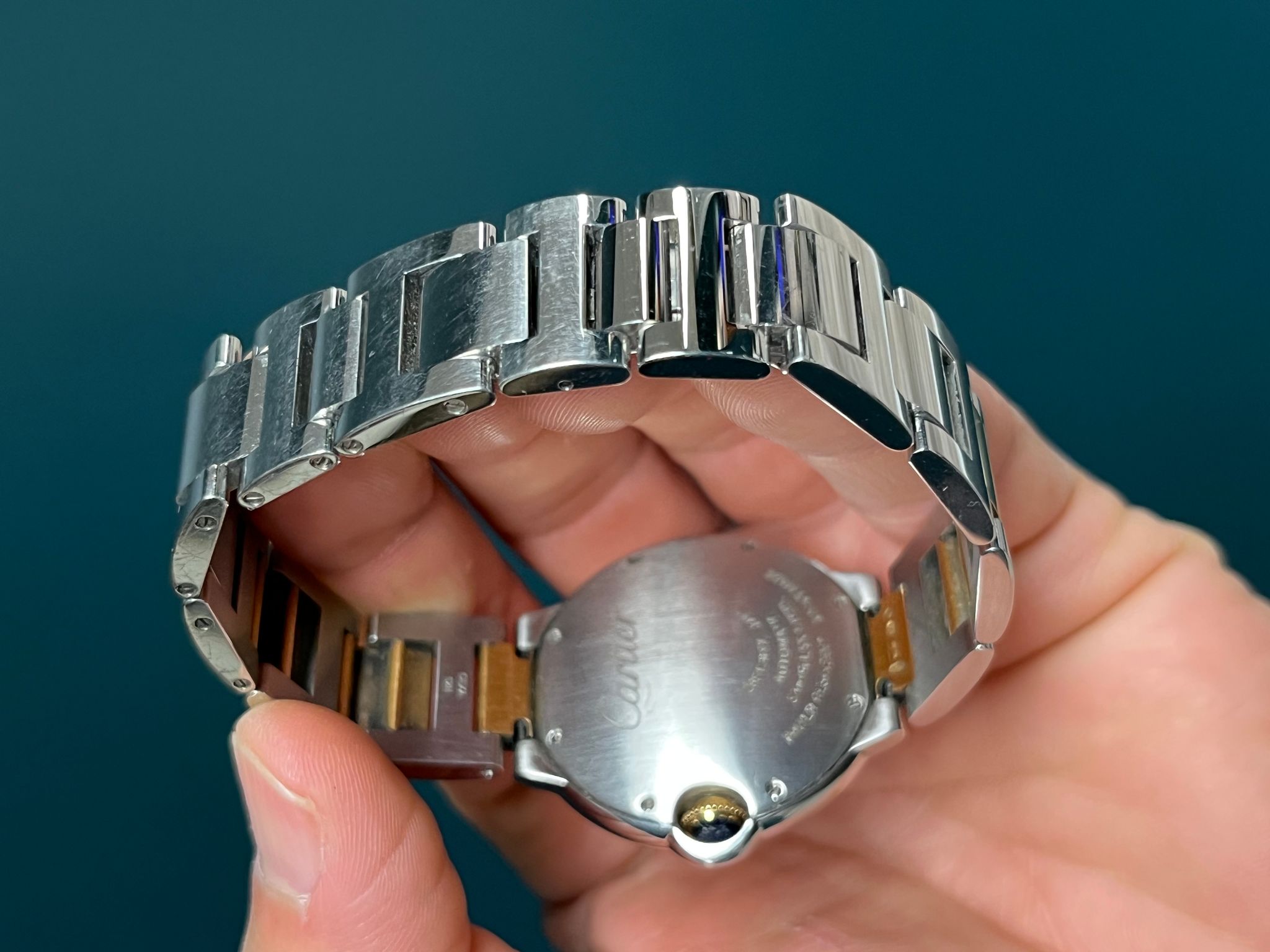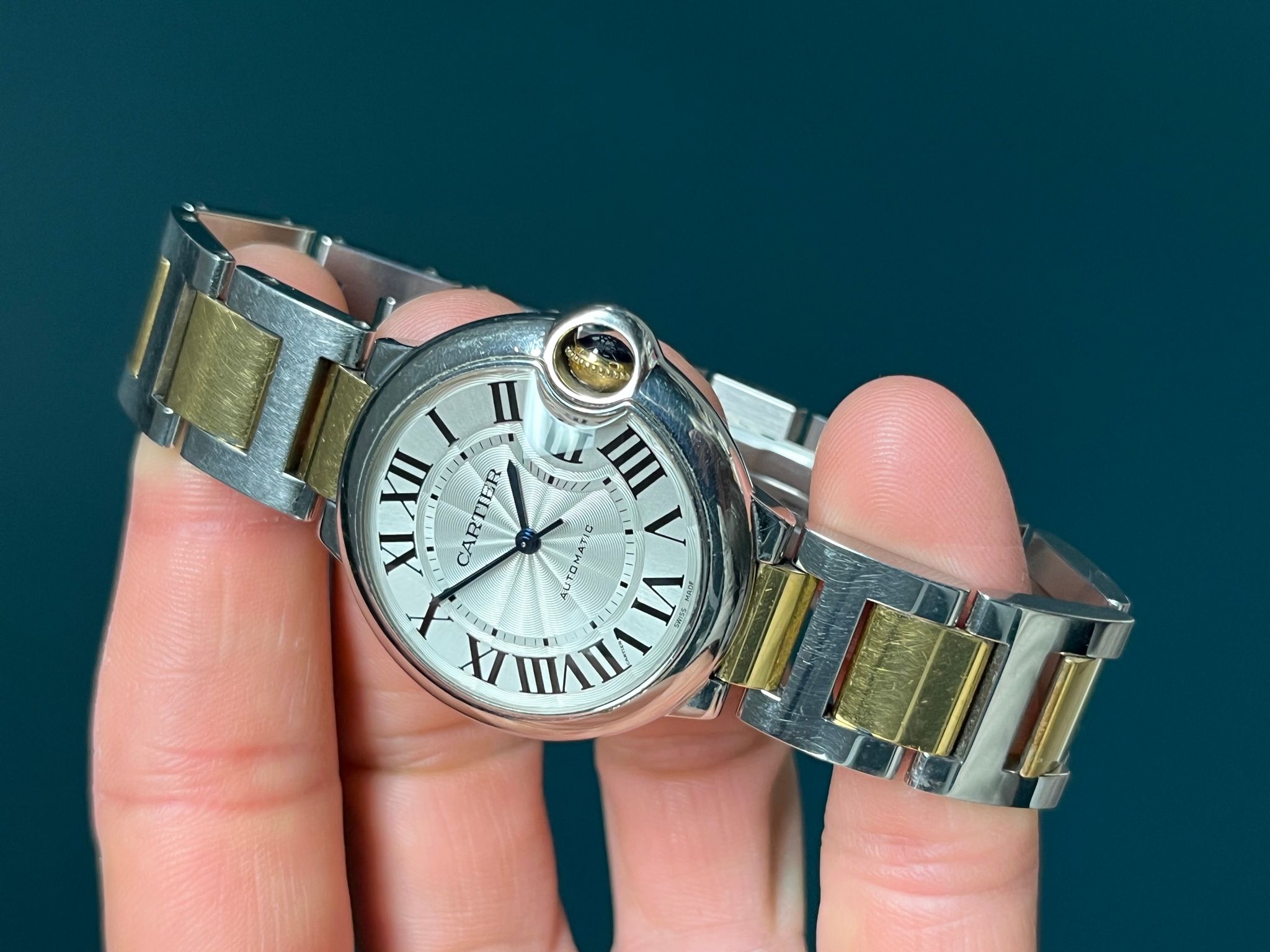 The Cartier Ballon Bleu Reference 3284 (W2BB0012) is a stunning fusion of elegance and contemporary craftsmanship accompanied by its original warranty papers dated 2017. This exquisite timepiece showcases a luxurious two-tone design, combining 18k yellow gold and stainless steel for a refined aesthetic. The signature rounded case, is accentuated by Cartier’s signature fluted crown set with a blue cabochon spinel. What truly sets this model apart is its original papers, which elevates the watch’s sophistication. The dial is an excellent silvered guilloché dial. Blued steel hands glide effortlessly over the dial, enhancing its timeless allure. Powered by a precise automatic movement, this watch is as reliable as it is stylish. Perfect for those who appreciate classic Cartier charm with a touch of luxury, the Ballon Bleu 3284 is an exquisite statement piece. The bracelet on this example is fully linked and shows no stretch.