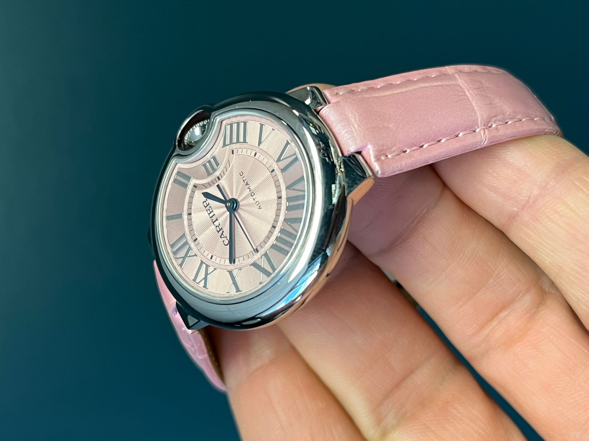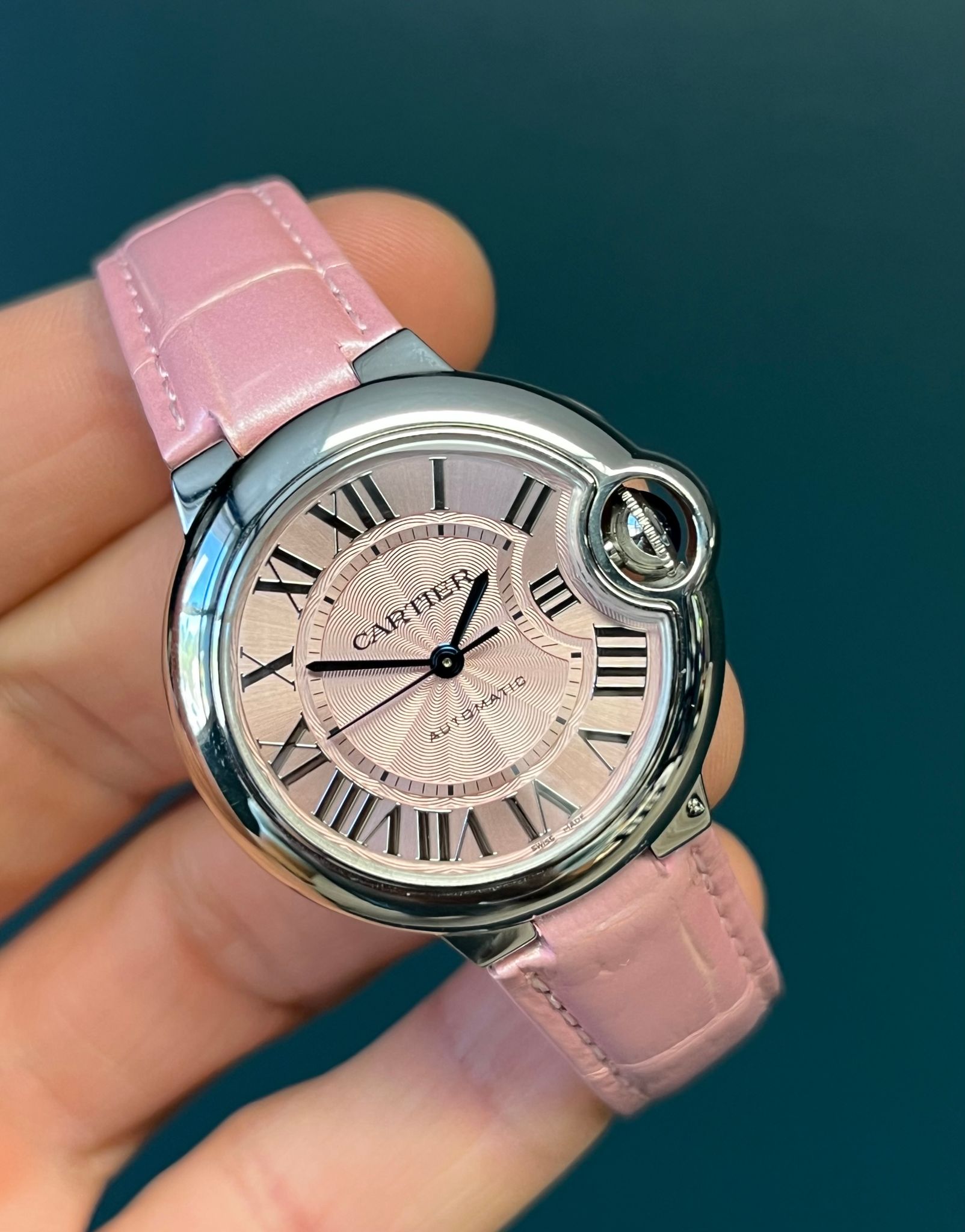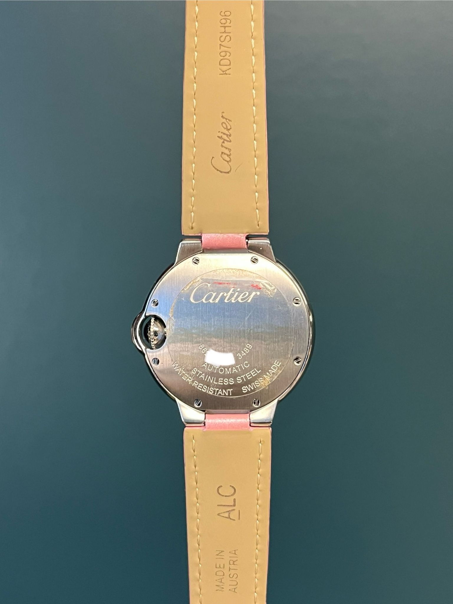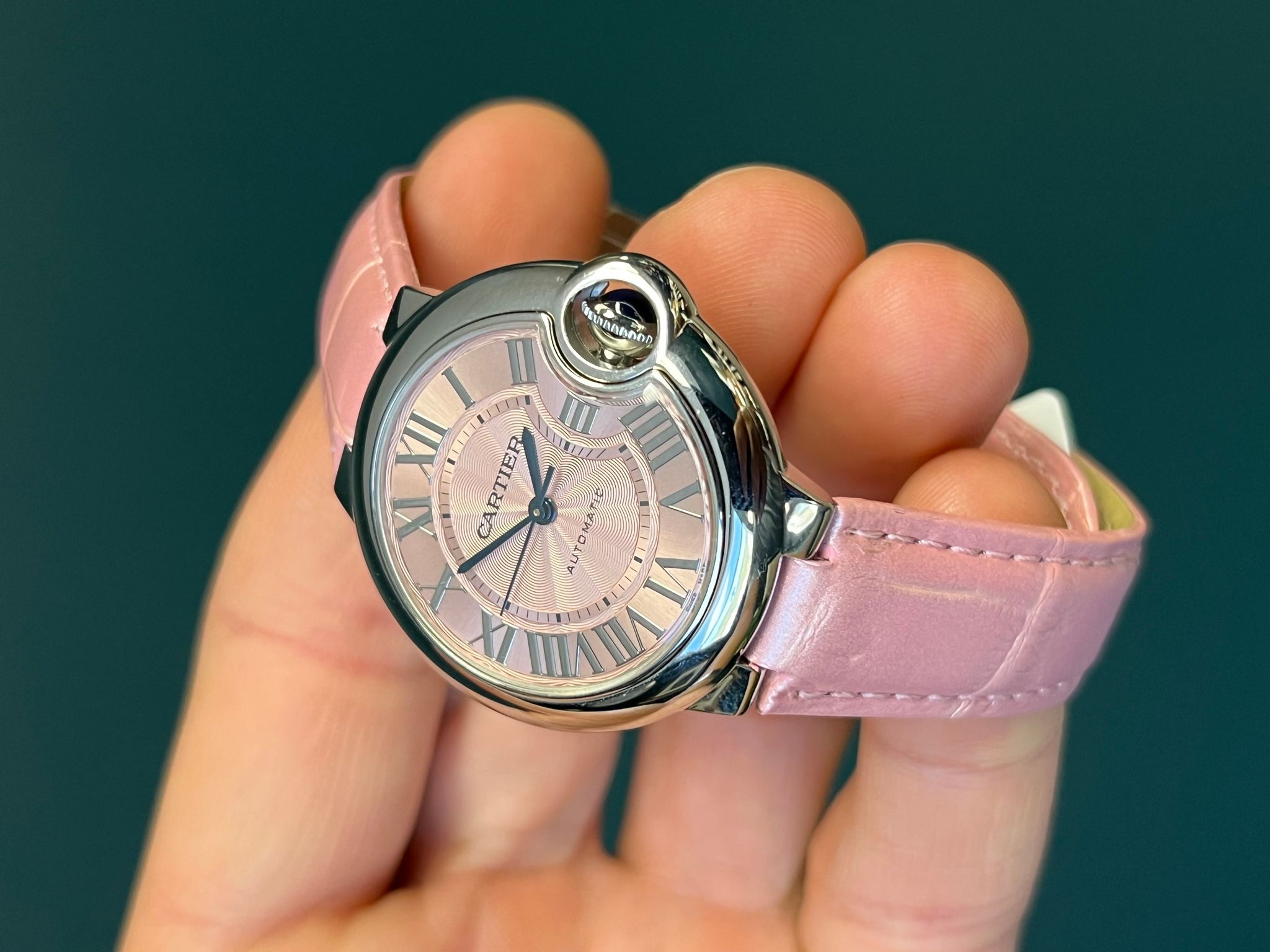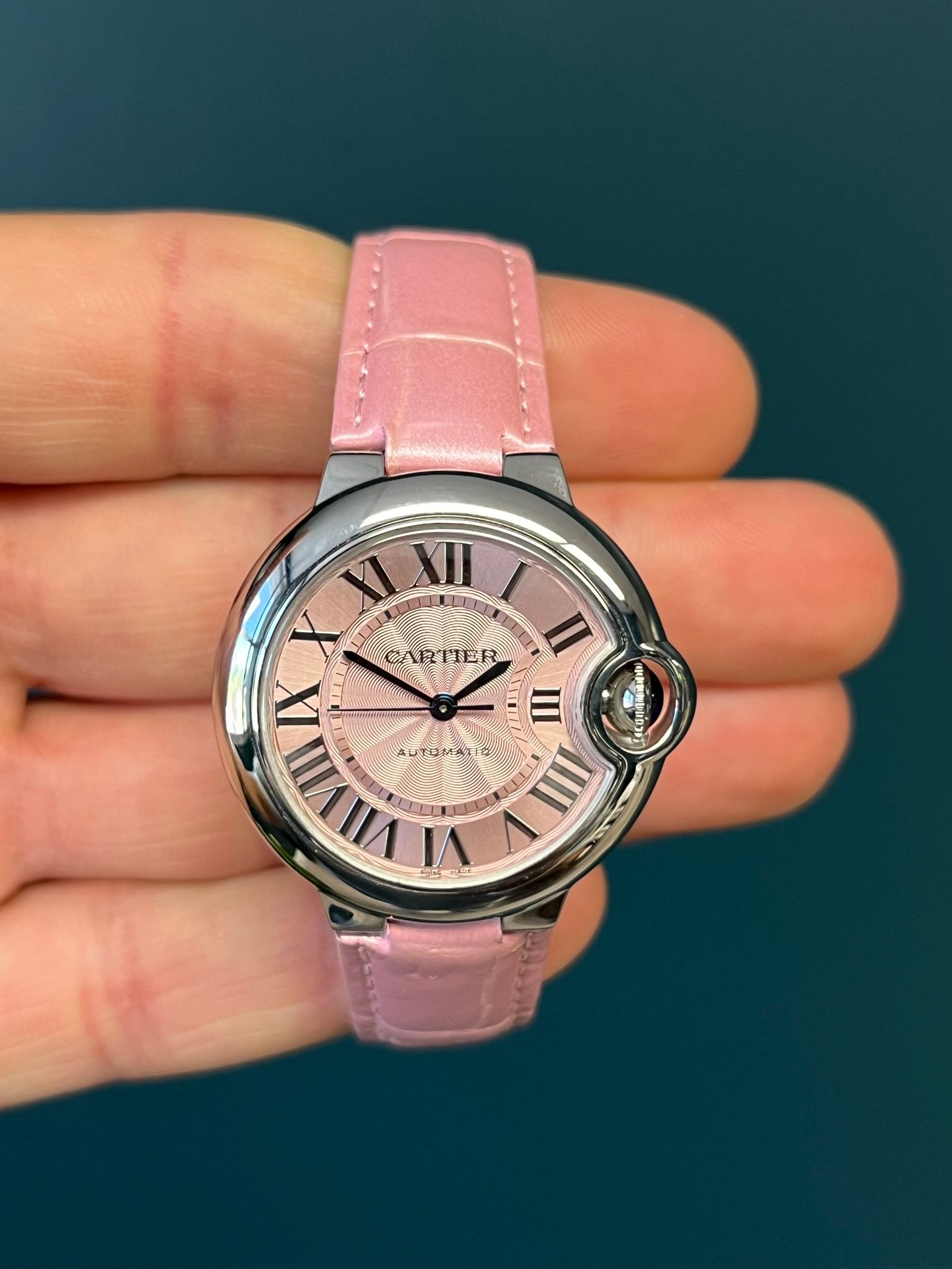 The Cartier Ballon Bleu reference 3489 (WSBB0002) is a captivating union of classic design and subtle flair. Housed in a 33 mm stainless steel case with the signature rounded profile and fluted crown topped with a blue cabochon, it’s perfectly balanced for daily elegance. The soft pink sunray dial, adorned with blued-steel sword hands and Roman numerals, offers a feminine yet refined touch, beautifully complemented by its matching pink alligator leather strap. Powered by Cartier’s in‑house Calibre 076 automatic movement with a 38‑hour power reserve, it combines timeless aesthetics with reliable performance. Presented with original papers dated 8/18/2018, and a purchase receipt, this unworn gem is a rare find that embodies Cartier’s legacy of craftsmanship and understated luxury. This example is in retail ready condition, with a brand new strap and deployment buckle.