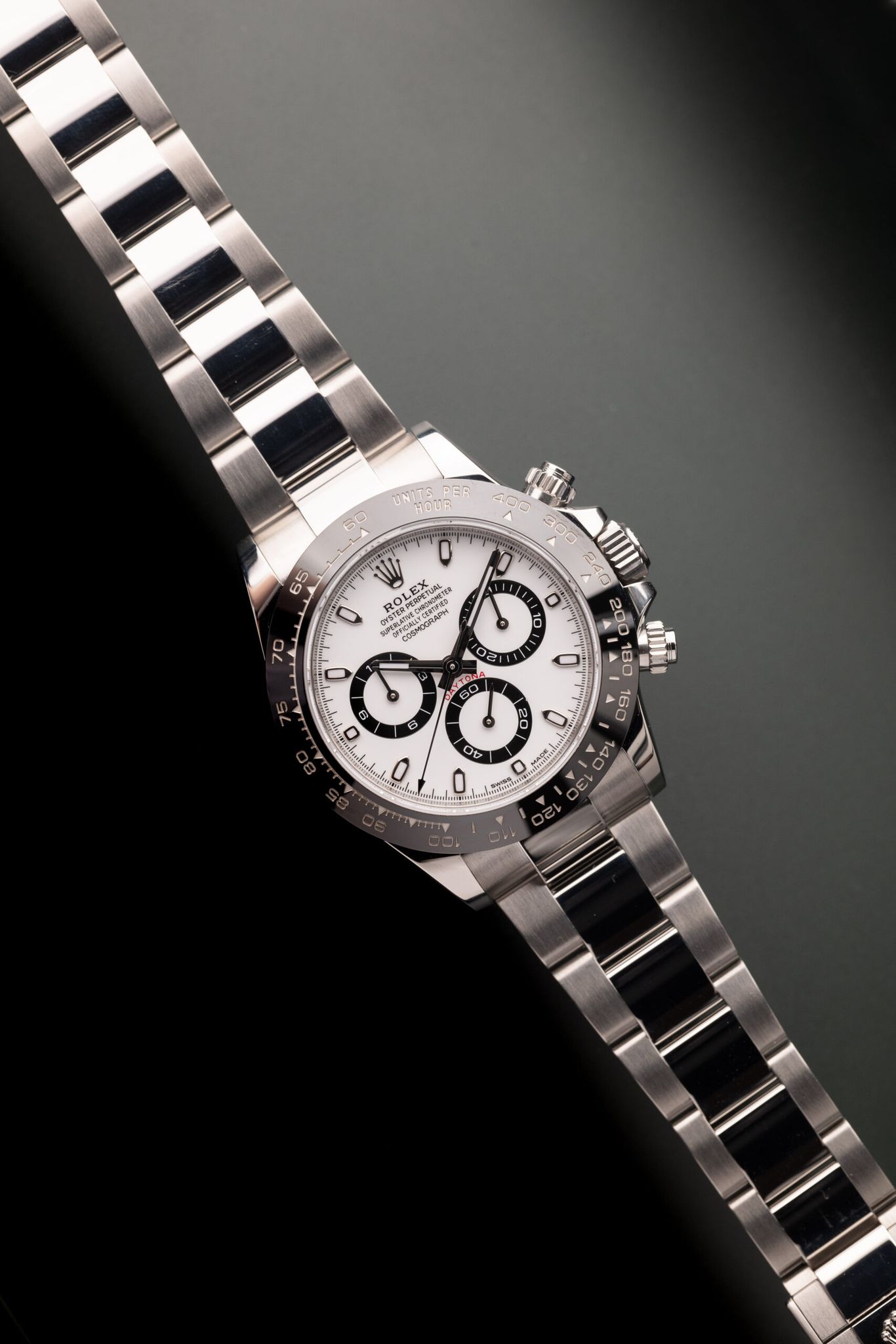 The hardest full production watch to source from the Rolex AD is unquestionably a steel Panda Daytona. The market price for a panda has gotten super attractive and we feel that these Panda’s are a spiritual successor to the 6263 4-digit Daytonas. This watch comes with a guarantee card and matching tag.