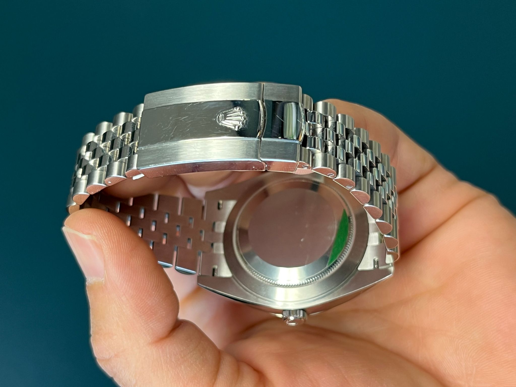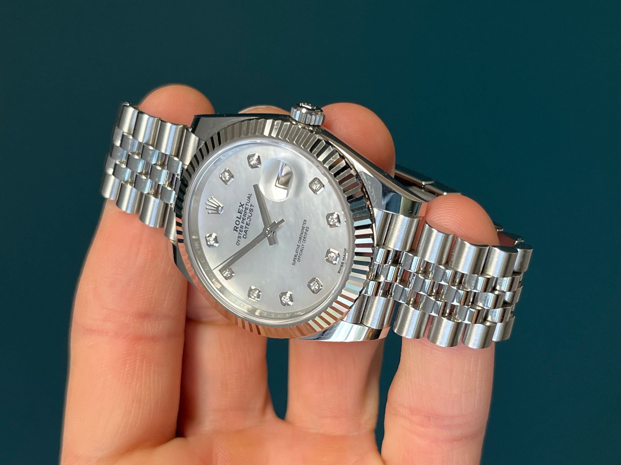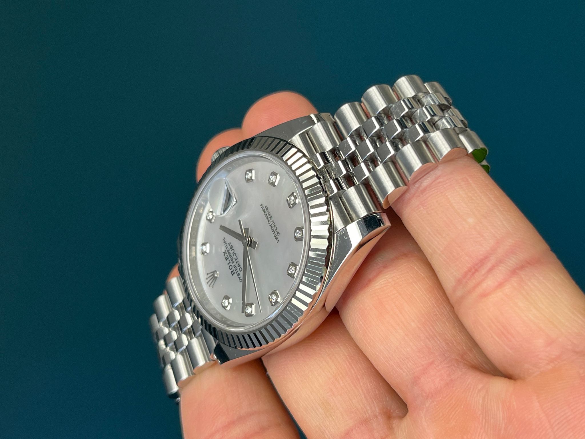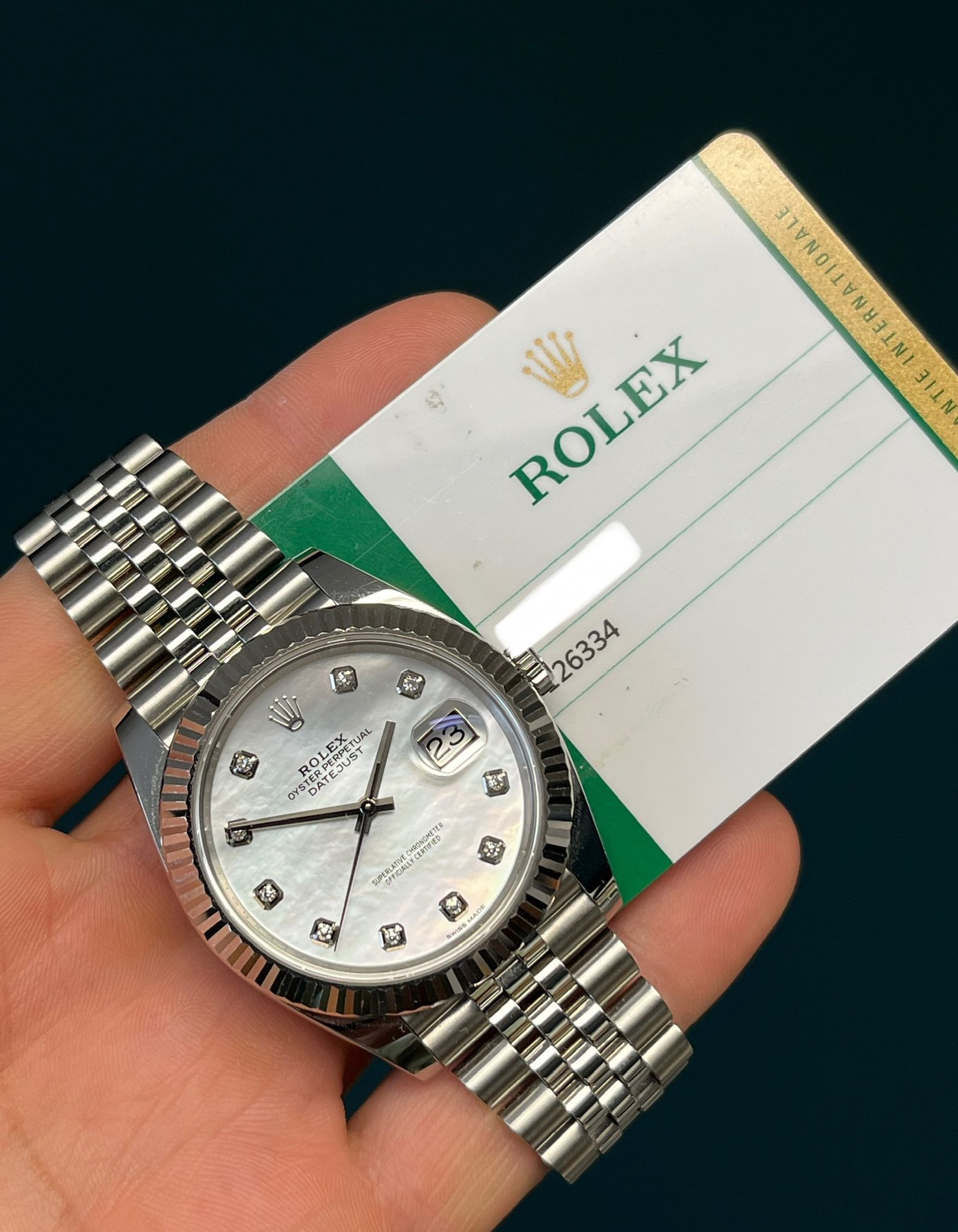 The Rolex Datejust 41mm, Reference 126334, exemplifies refined luxury and timeless design. Crafted in stainless steel with an 18k white gold fluted bezel, this model features a stunning and rare factory Mother-of-Pearl diamond dial, where each diamond is hand-set by Rolex for exceptional brilliance. Powered by the automatic Caliber 3235 movement, it offers superior precision and a 70-hour power reserve.