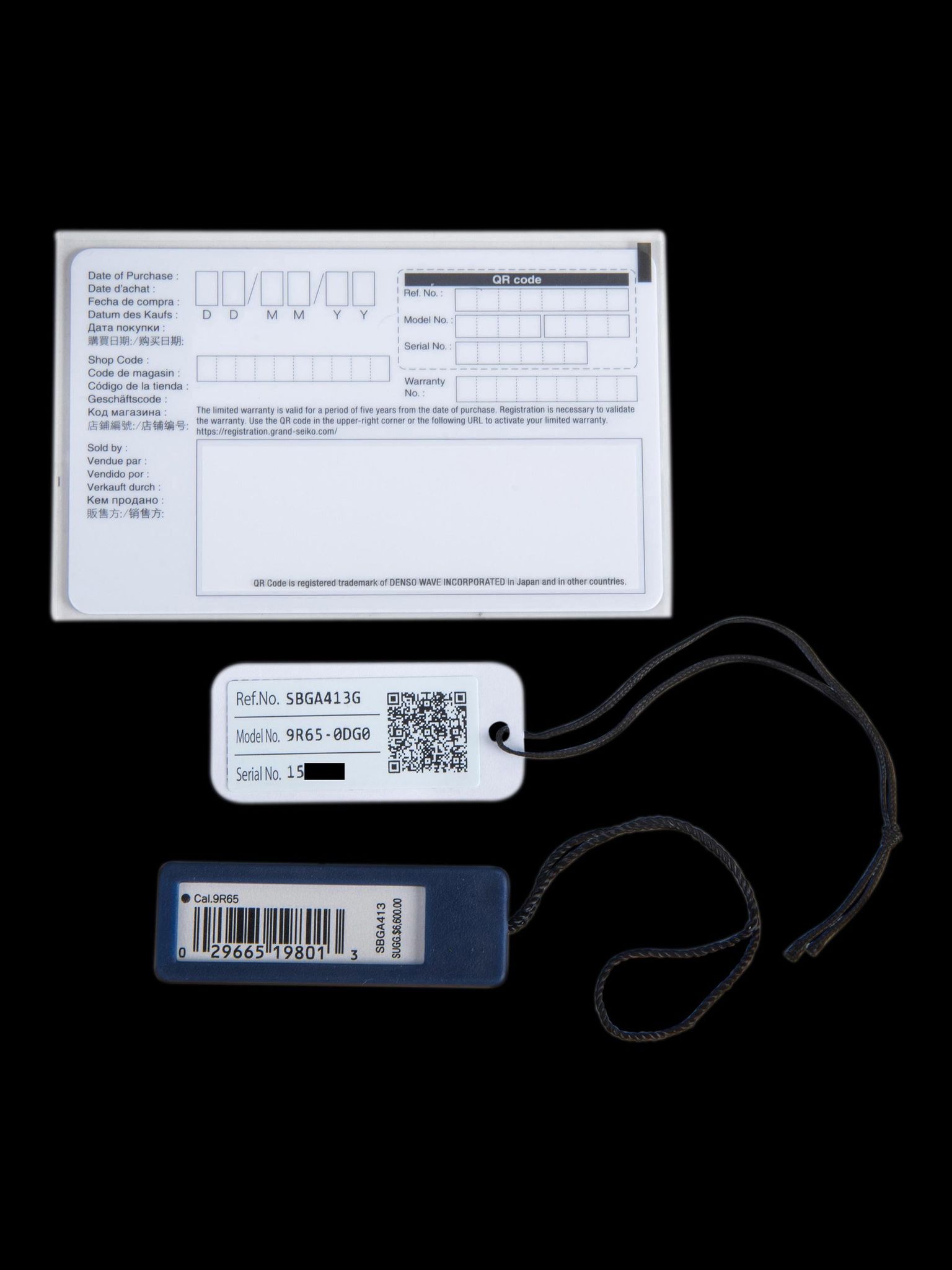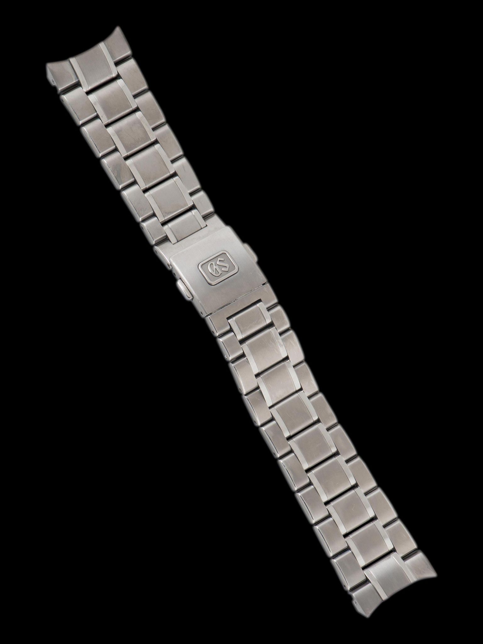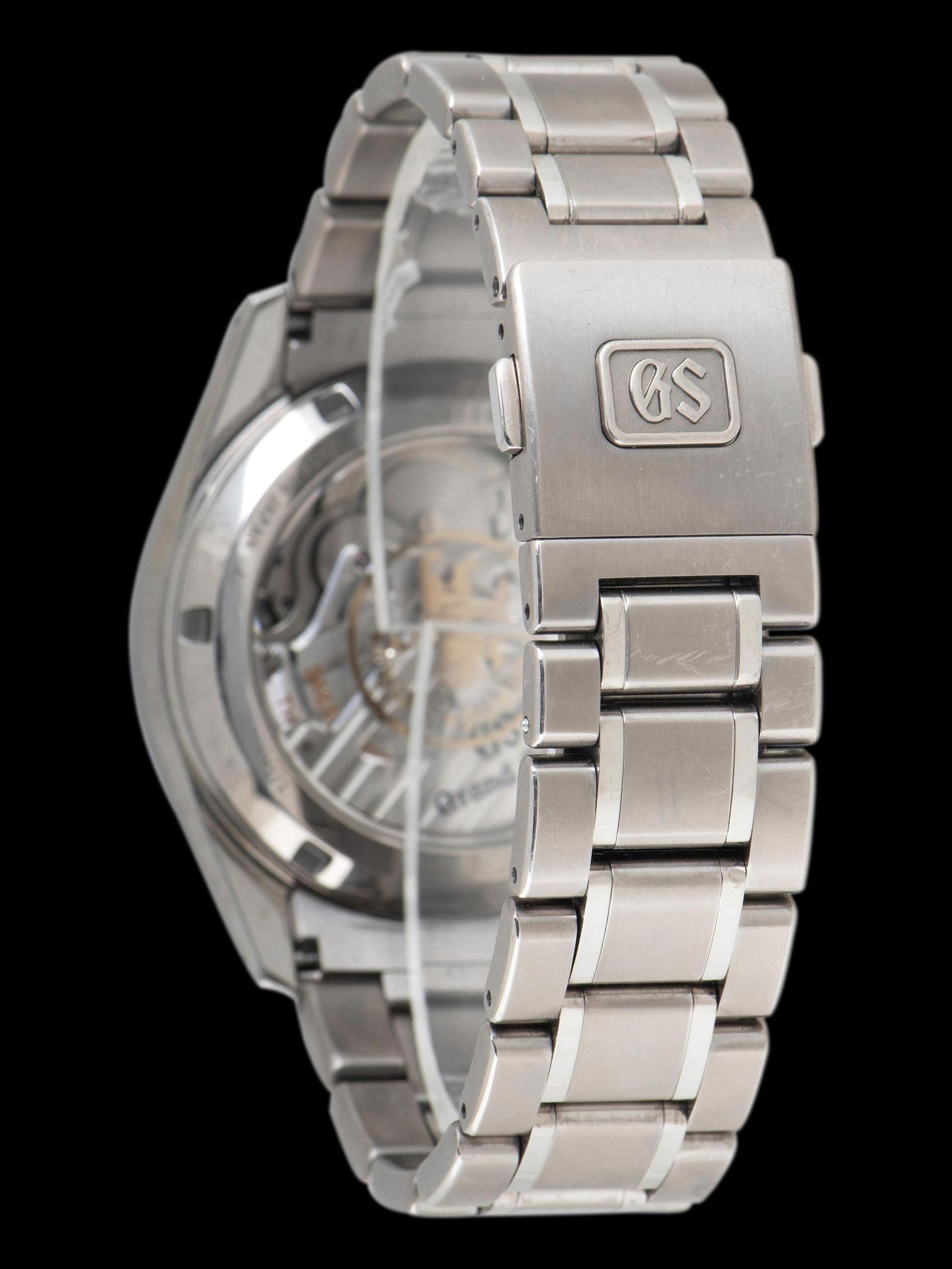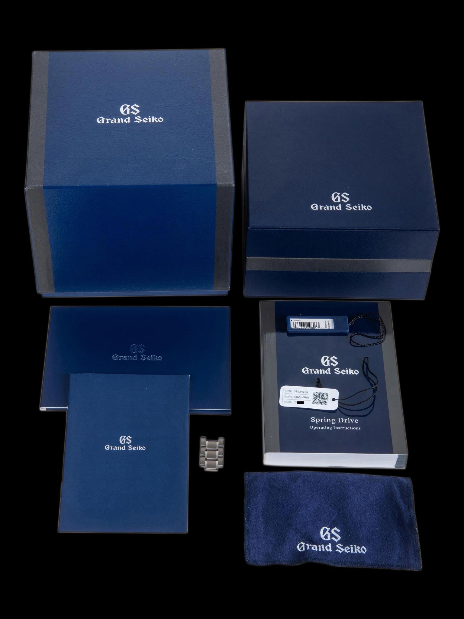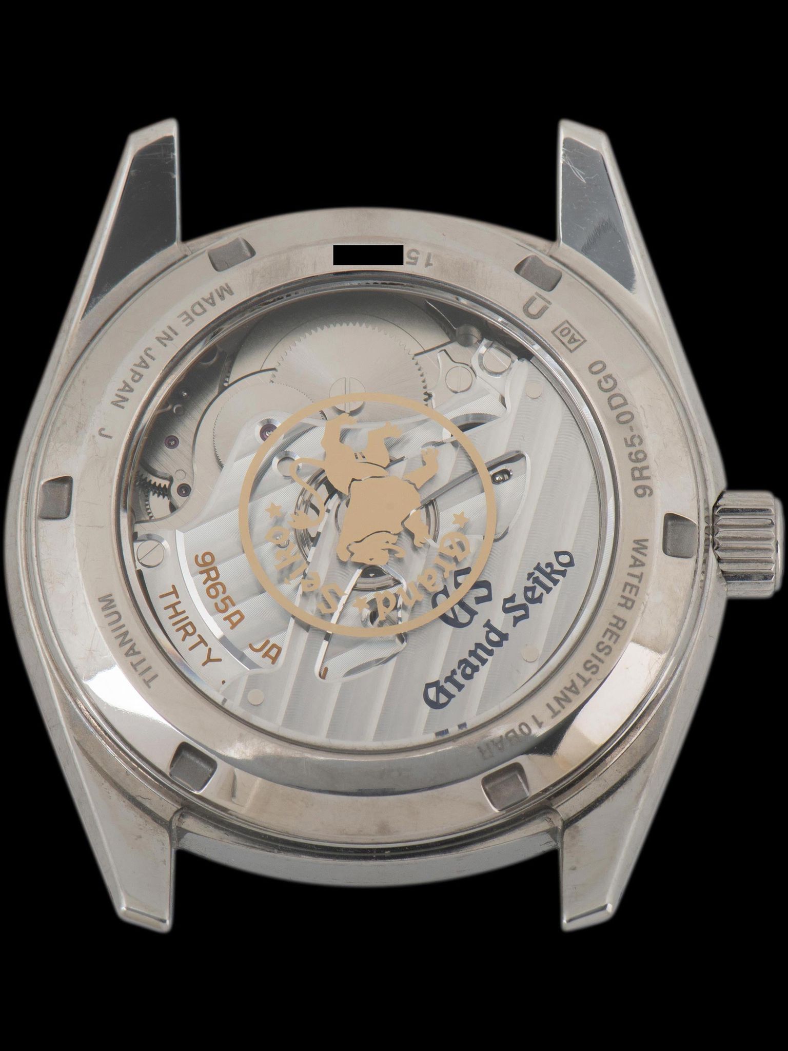 The extraordinarily crisp titanium case remains unpolished, displaying the painstakingly accurate finishing throughout, with only nominal signs of use present. The case retains its original signed screw-down crown. The sapphire display case back showcases the beautiful cal 9R65 movement with all of its original factory markings in fully present condition on the case back edges. The original Grand Seiko titanium bracelet will fit up to a 7-inch wrist. The watch comes with 3 more separate links in its set to make for a fully linked bracelet