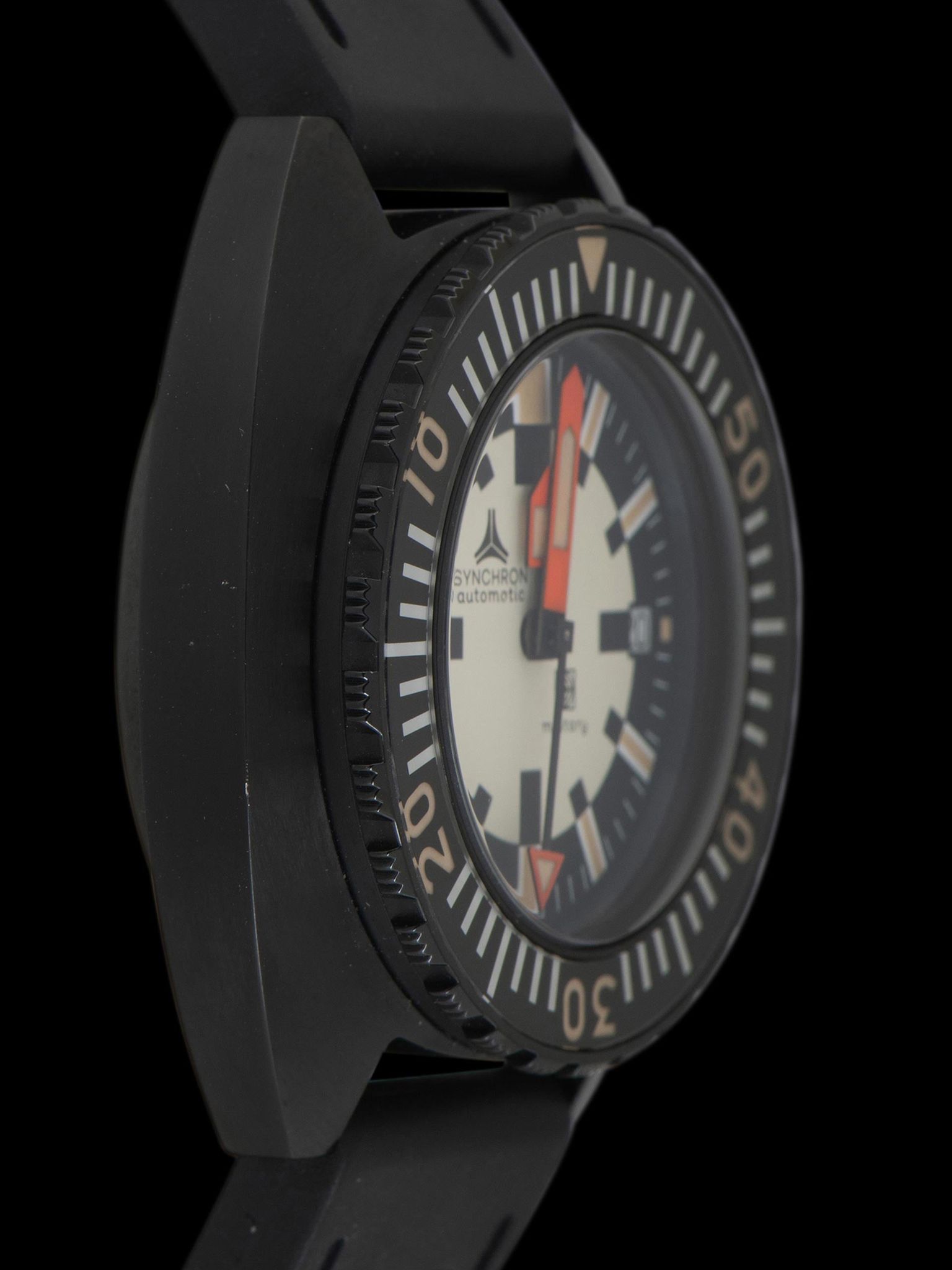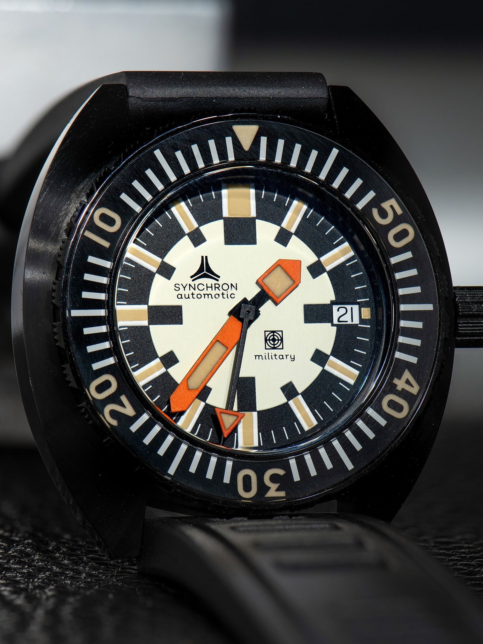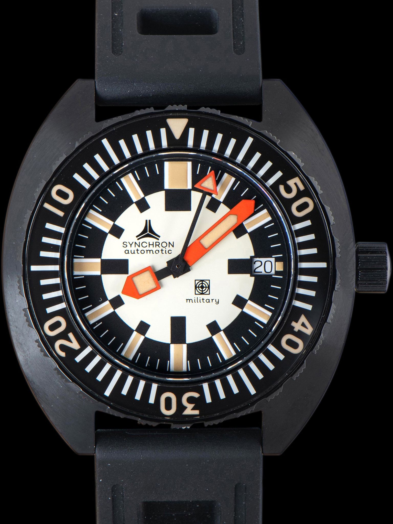 Introduced in 2021, the Synchron Military PVD case is a faithful modern revival of the iconic Doxa Army, a professional dive watch originally developed in the early 1970s. Synchron, the Swiss watch group that once owned Doxa alongside brands like Cyma and Ernest Borel, drew directly from this heritage design, preserving the bold dial layout, distinctive handset, and rugged tool-watch aesthetic of the original. With its matte PVD-coated case, robust build, and upgraded modern materials, the Synchron Military captures the spirit of the vintage Doxa Army almost perfectly, bringing a legendary dive watch into the modern era without losing its soul. A total of 500 examples of the Military were created, with a split production between the stainless steel and PVD variants.