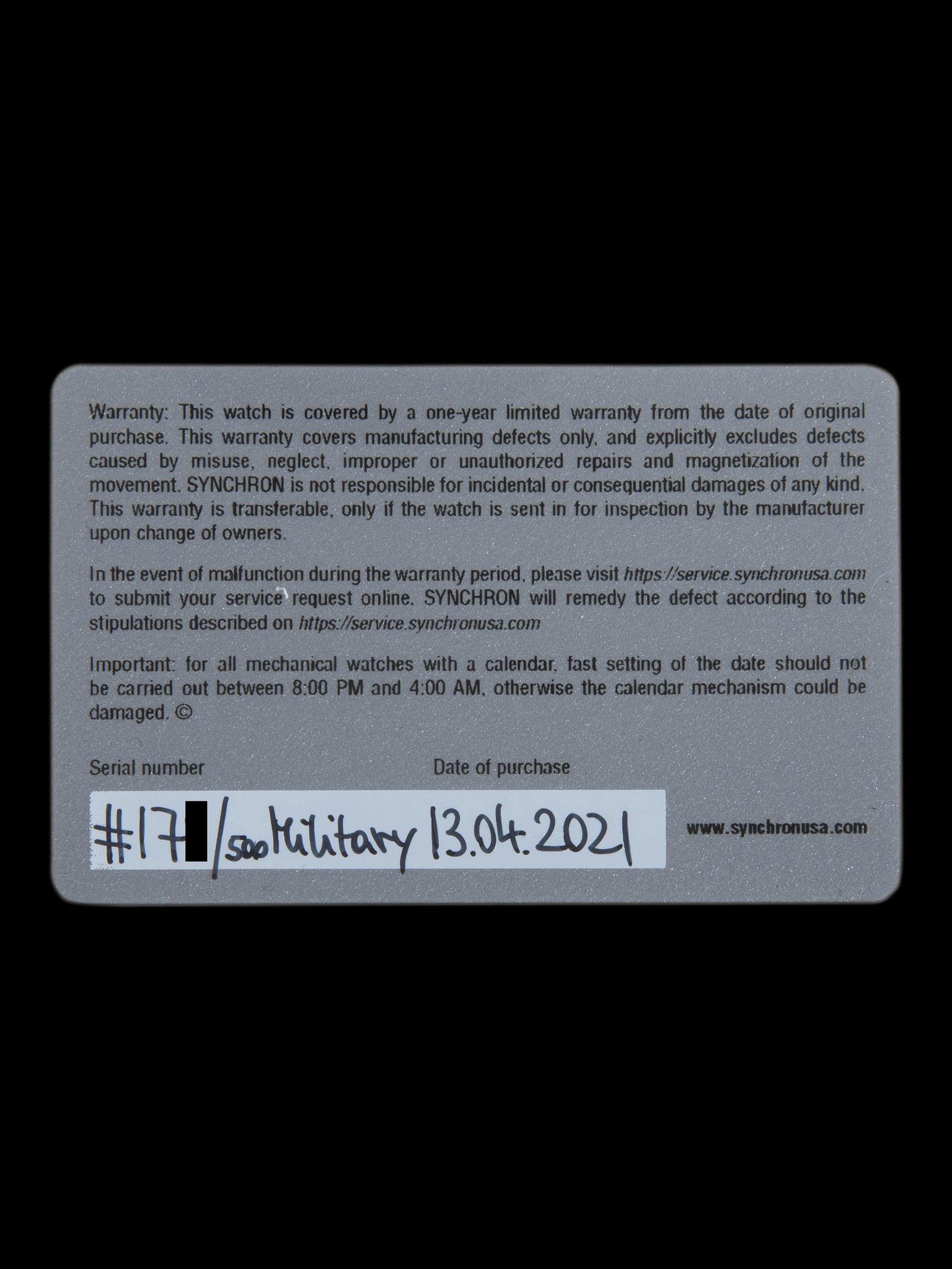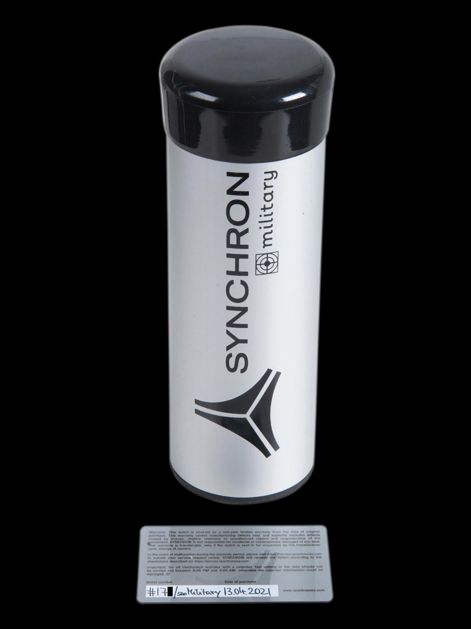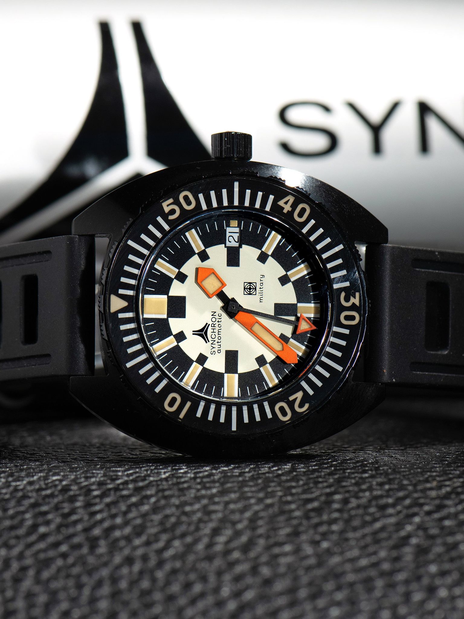 Introduced in 2021, the Synchron Military PVD case is a faithful modern revival of the iconic Doxa Army, a professional dive watch originally developed in the early 1970s. Synchron, the Swiss watch group that once owned Doxa alongside brands like Cyma and Ernest Borel, drew directly from this heritage design, preserving the bold dial layout, distinctive handset, and rugged tool-watch aesthetic of the original. With its matte PVD-coated case, robust build, and upgraded modern materials, the Synchron Military captures the spirit of the vintage Doxa Army almost perfectly, bringing a legendary dive watch into the modern era without losing its soul. A total of 500 examples of the Military were created, with a split production between the stainless steel and PVD variants.
