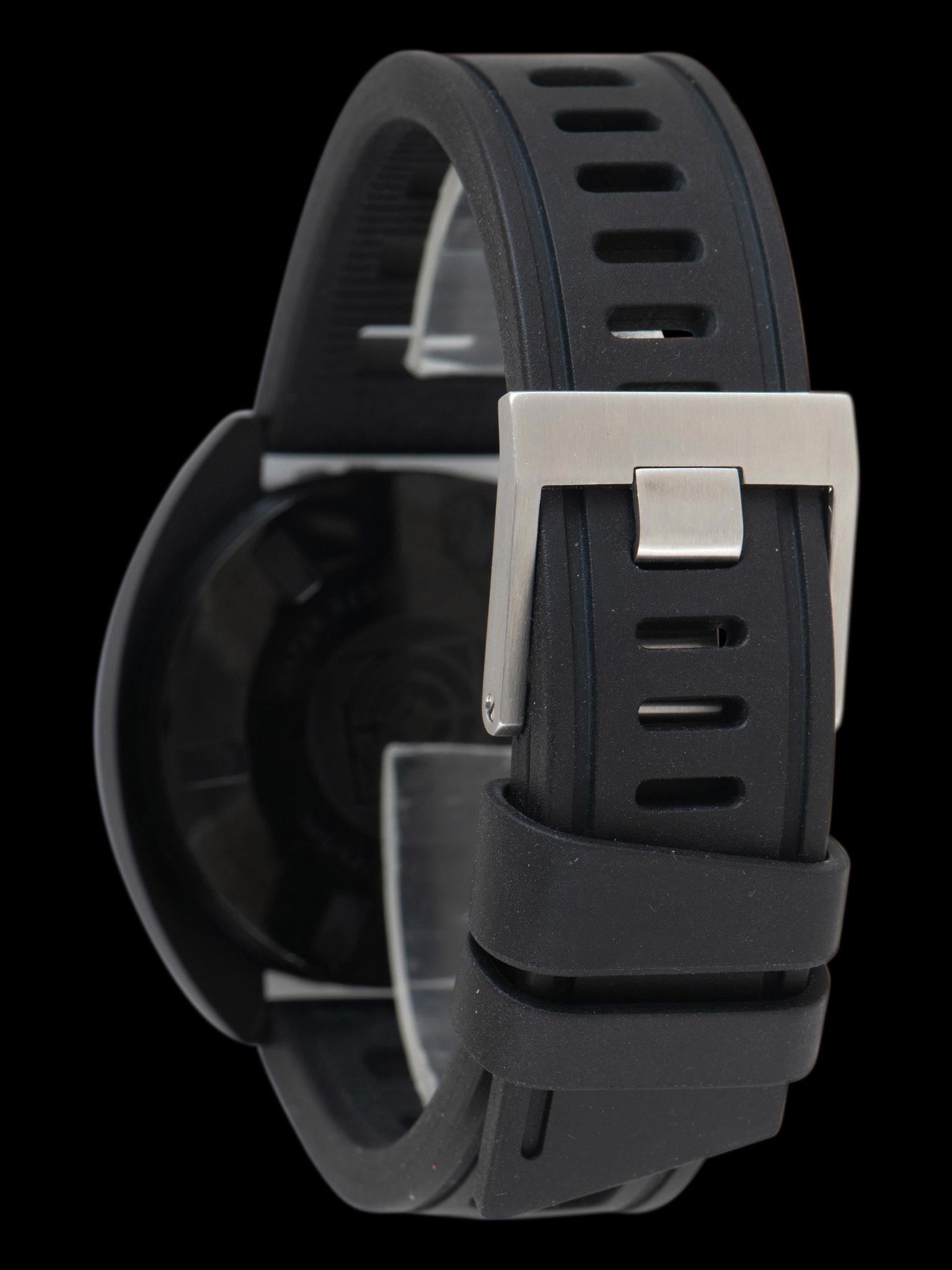 The robust and crisp PVD finished stainless steel case is in excellent condition, showing only minor signs of previous use. The sapphire bezel and crystal are in perfect condition, showing no scratches or damage. The case back exhibits almost no signs of previous wear. The watch comes supplied on its original 2pc black Isoframe rubber strap with the original stainless steel tang buckle.