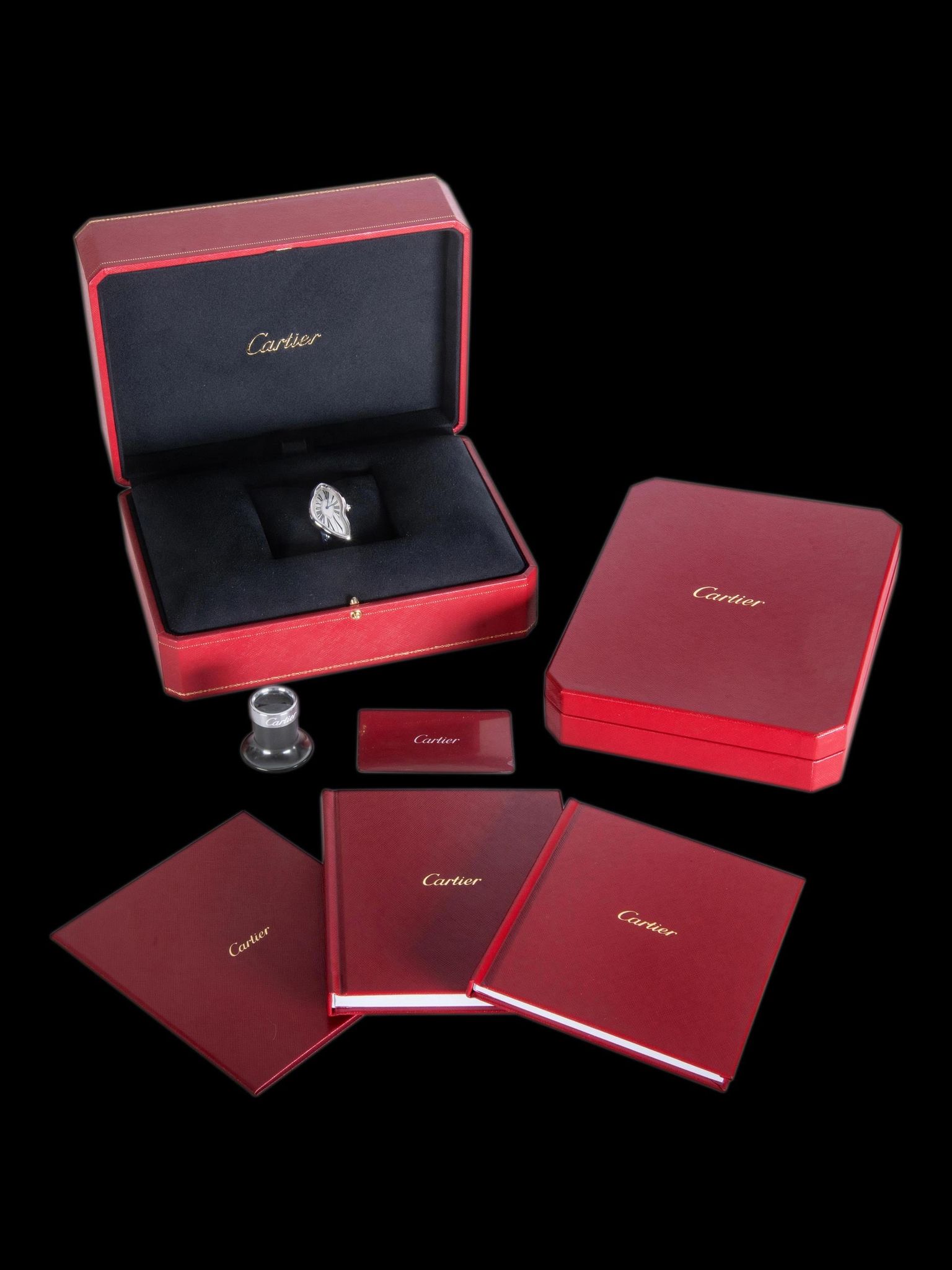 The watch comes as a complete set with the original inner and outer boxes, Cartier loupe, Cartier document holder, booklets, and Cartier warranty card.