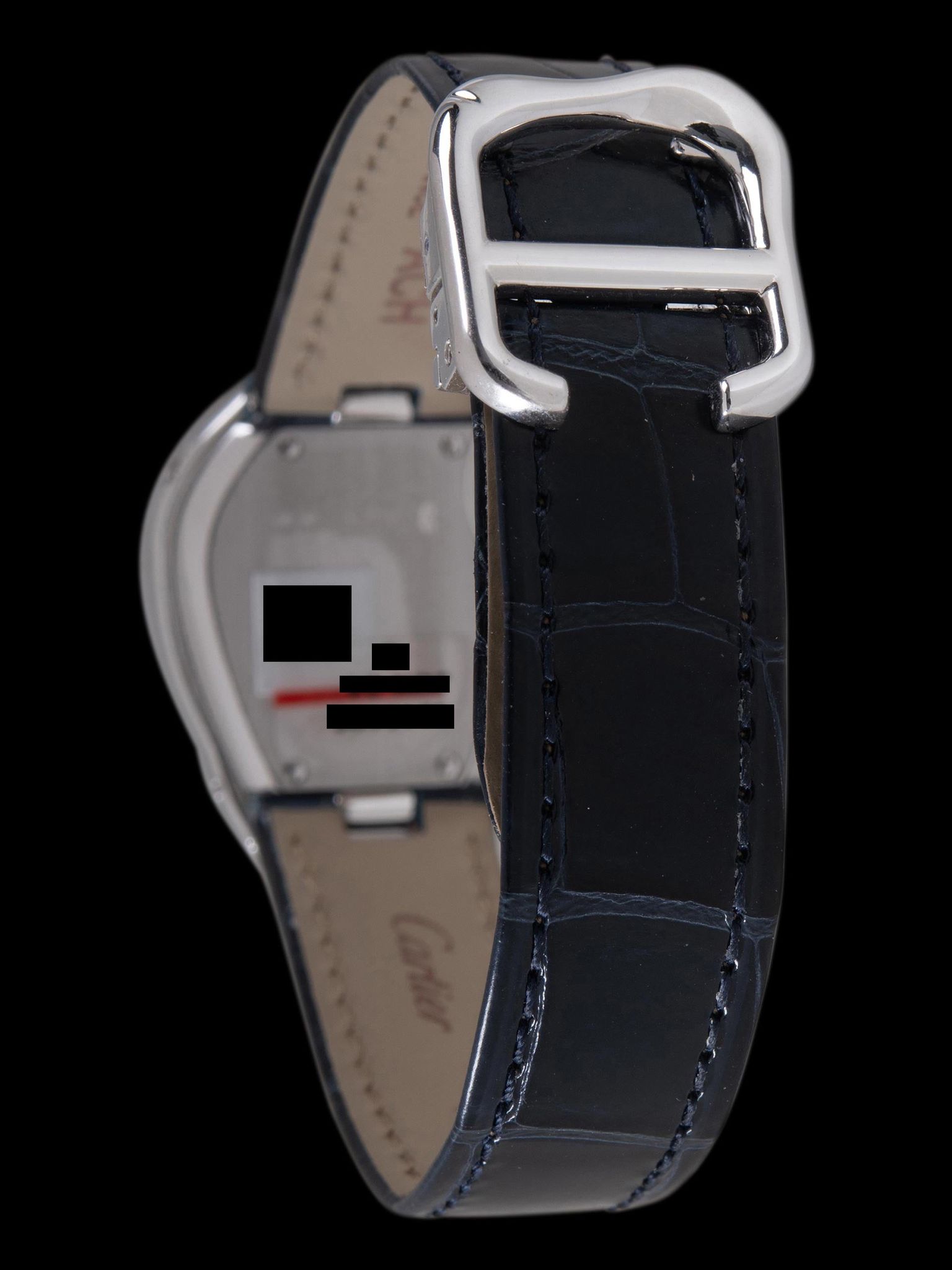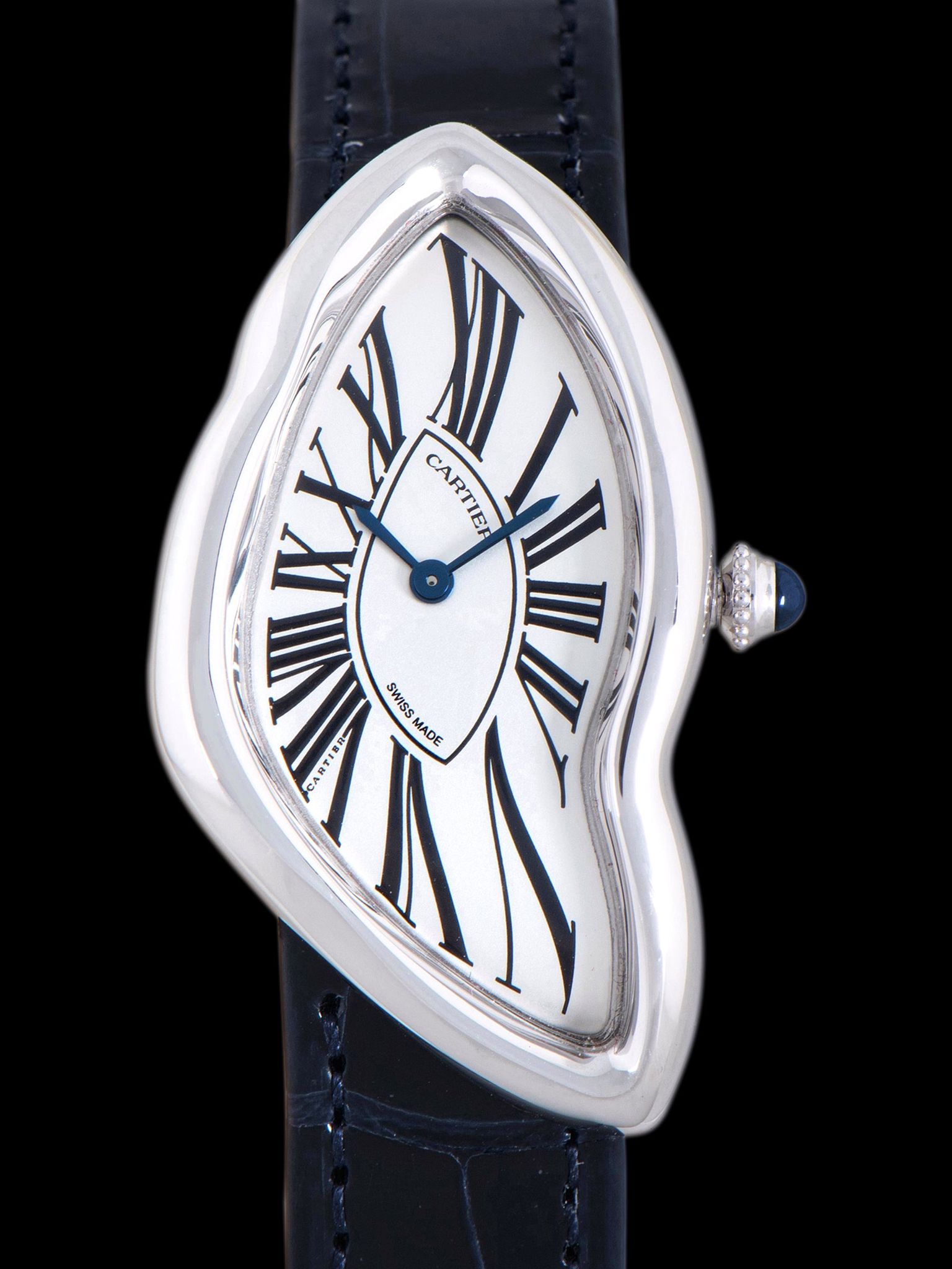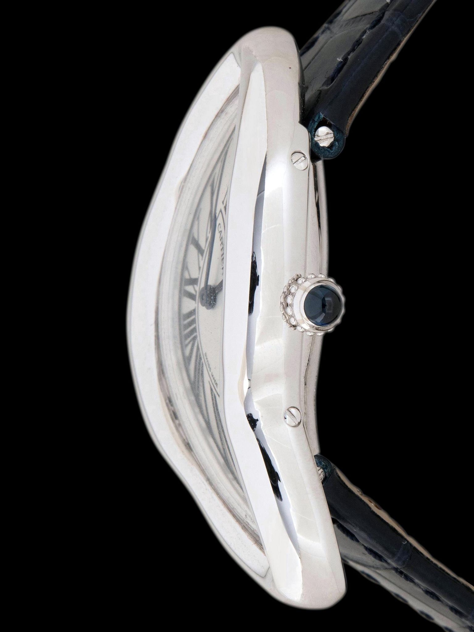 The 18K white gold case is in impressive, 'like new' condition, appearing to have only been worn a handful of times with only nominal elements of previous use present. The crystal displays no signs of use. The blue sapphire cabochon crown is in perfect condition. The case back retains its original factory stickers and shows no signs of use. The 2pc dark blue patent alligator leather Cartier strap is unworn and accents the timepiece perfectly. The watch comes with its original, and unique to the Crash, 18K white gold deployant buckle which is in perfect condition as well.