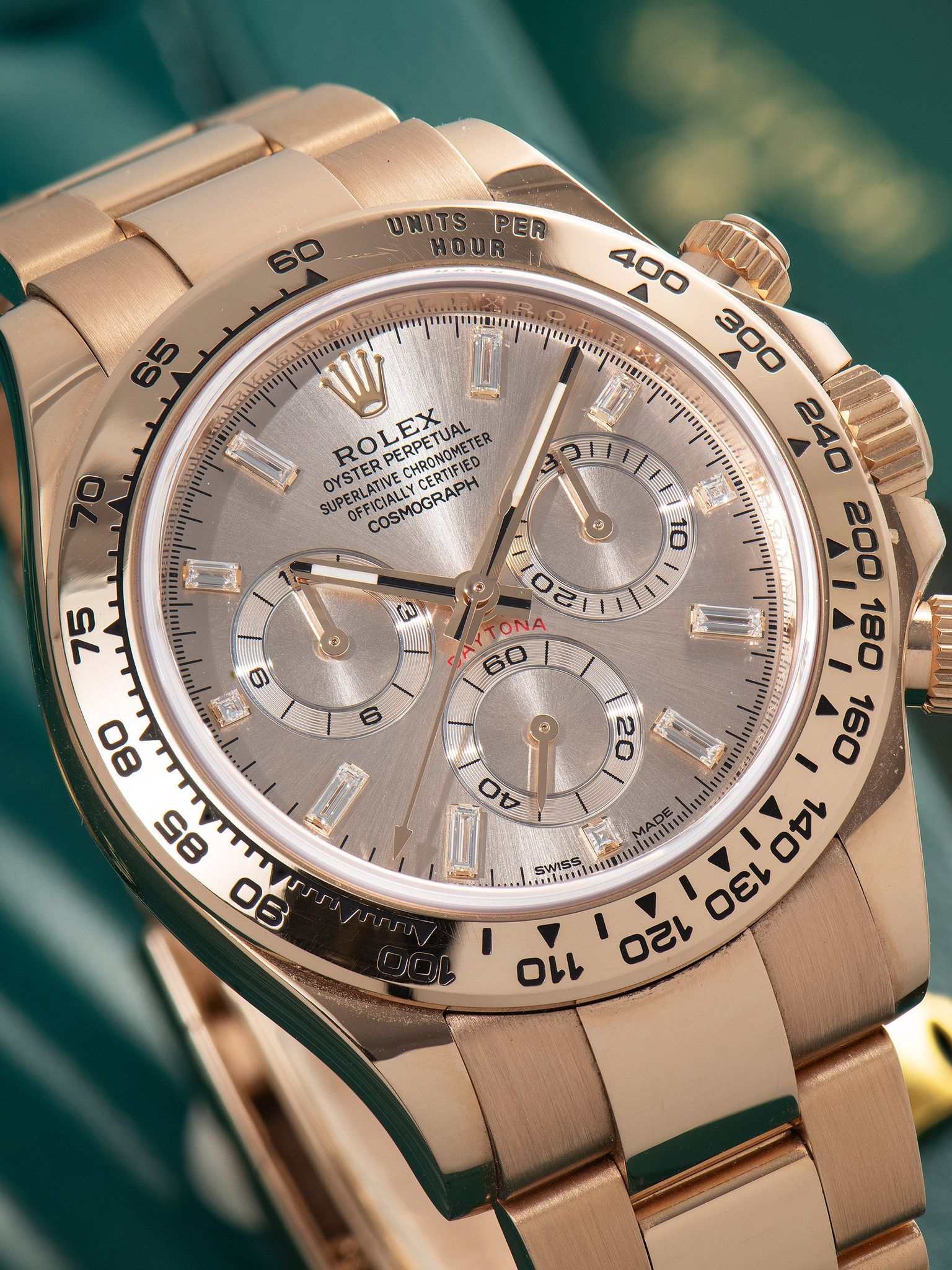 Introduced in 2008, the Rolex Daytona ref. 116505 marked the debut of the model crafted entirely in 18K Everose gold—Rolex’s proprietary alloy engineered to preserve its rich rose hue. This example features the desirable factory dial set with baguette-cut diamond hour markers, a configuration reserved for precious metal variants and produced in far smaller quantities than standard executions. Powered by the in-house caliber 4130, the ref. 116505 blends technical excellence with elevated luxury, standing as one of the most refined and collectible expressions of the modern Daytona lineage.