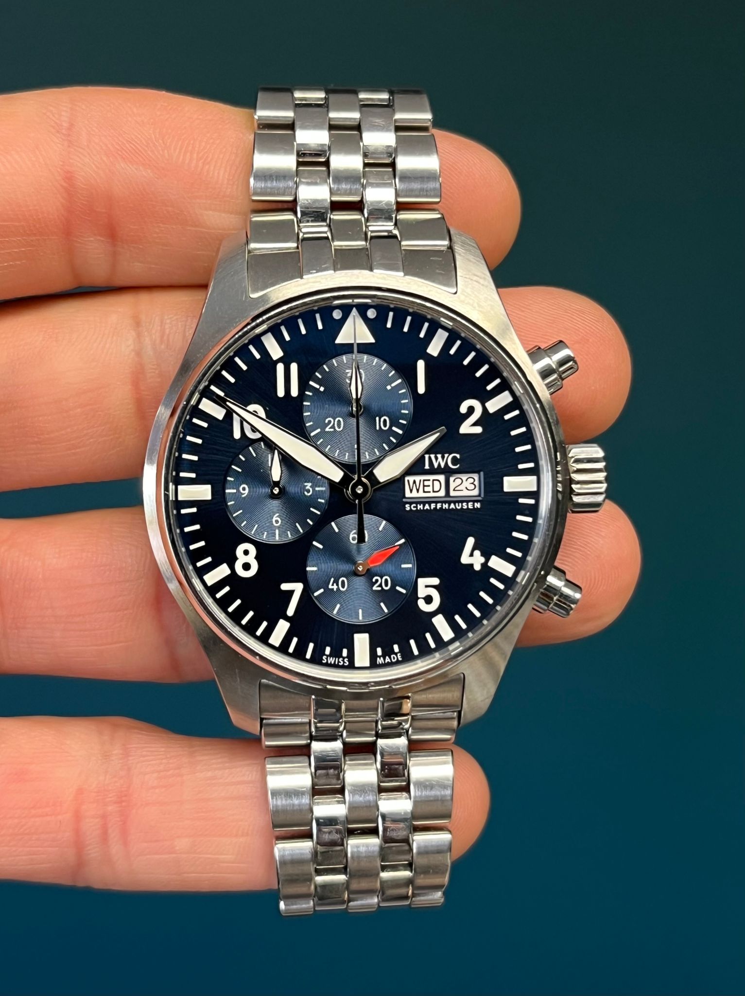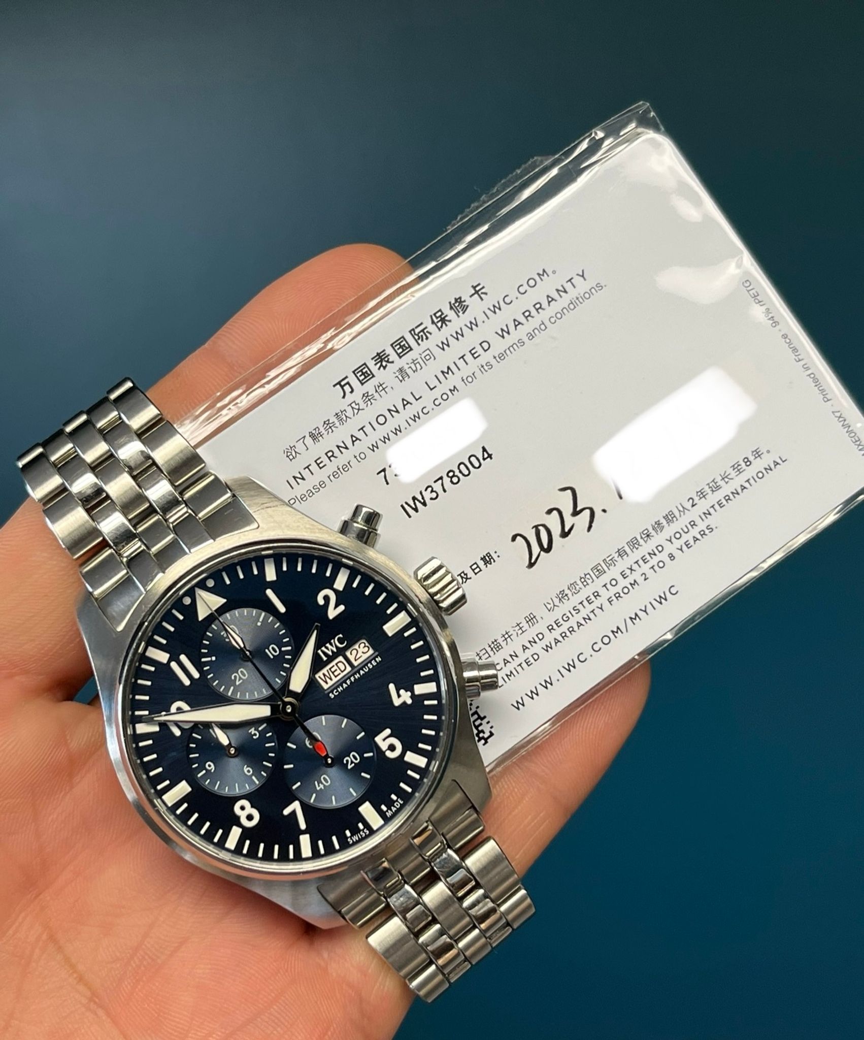 Accompanied by its papers dated 2023, this example remains in superb condition—showcasing IWC’s mastery of craftsmanship and timeless design. A modern classic, the blue-dial Pilot’s Chronograph IW378004 is the perfect balance of utility, heritage, and understated sophistication.