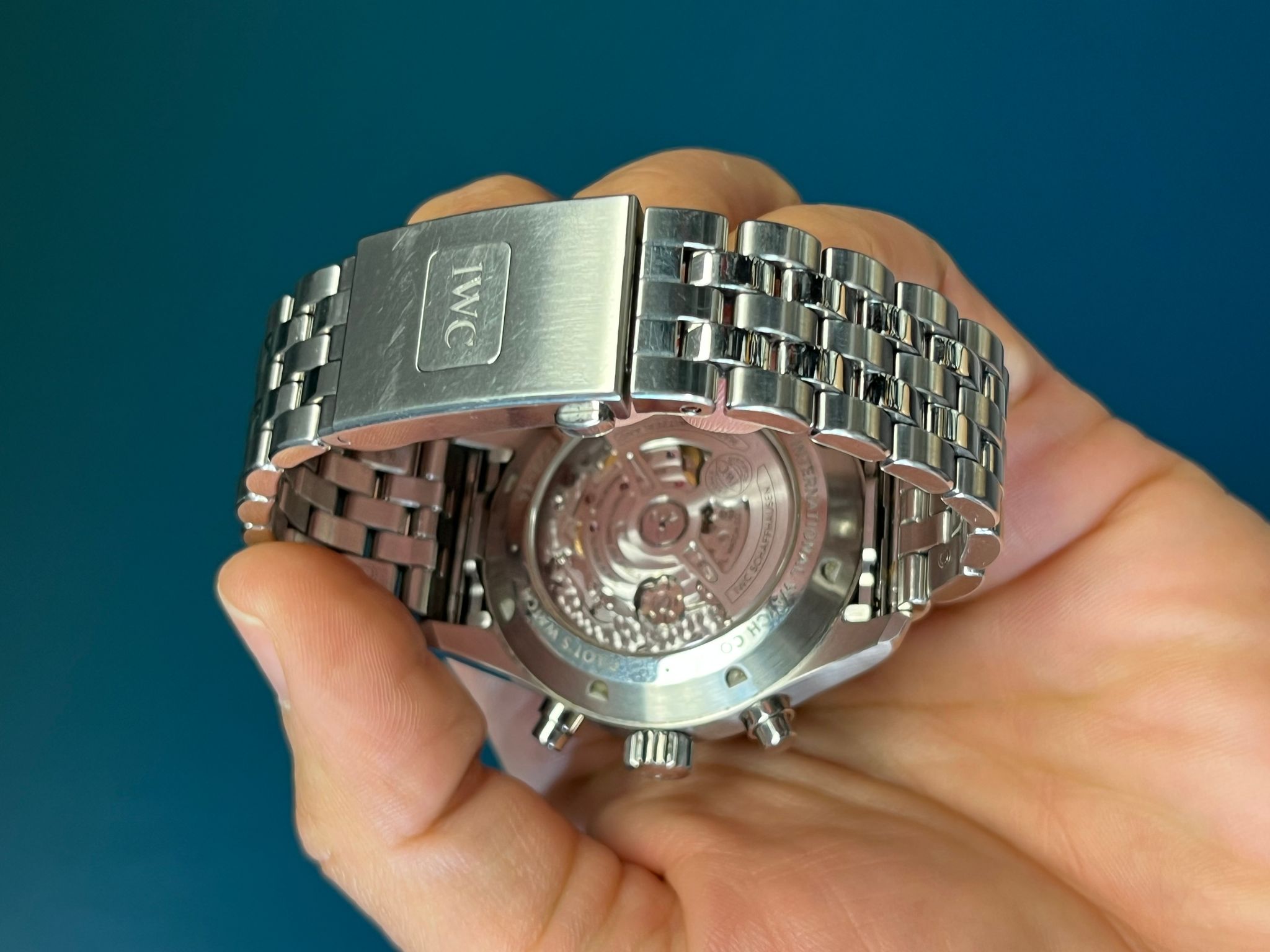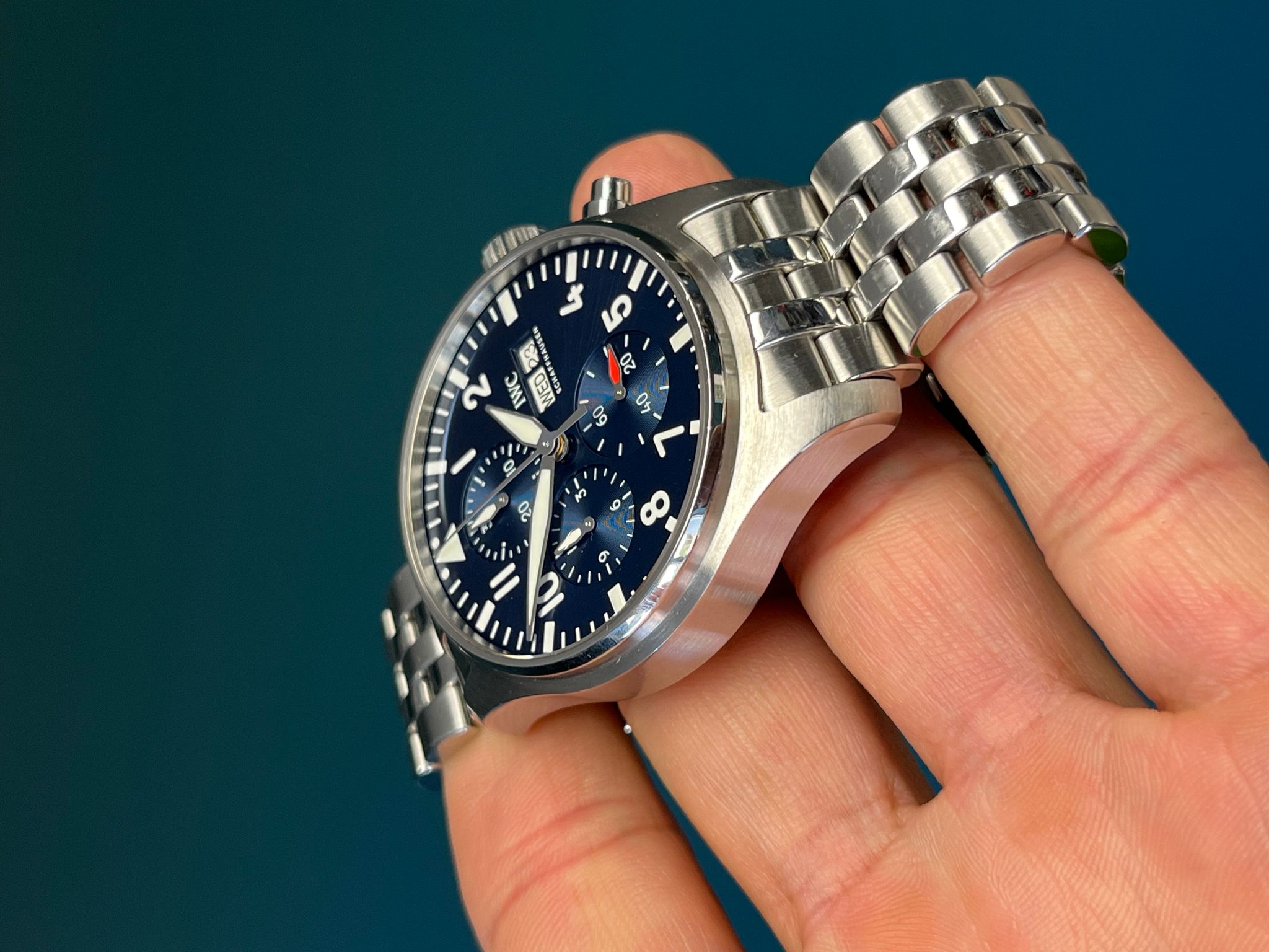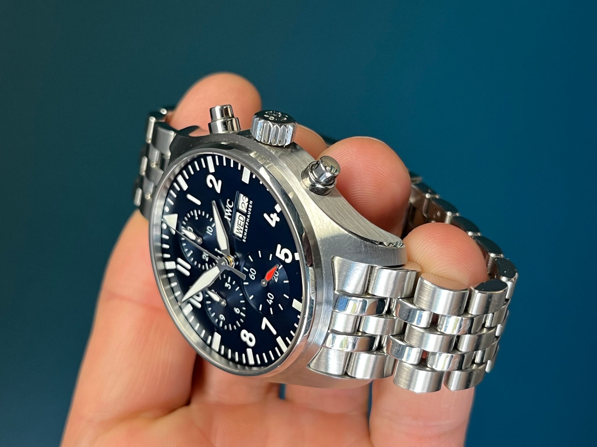 Powered by the reliable IWC automatic chronograph movement, the watch delivers robust performance and precision timekeeping, true to the brand’s aviation heritage. The day-date display at 3 o’clock enhances functionality, while the screw-down crown and sapphire crystal ensure resistance to the elements.
