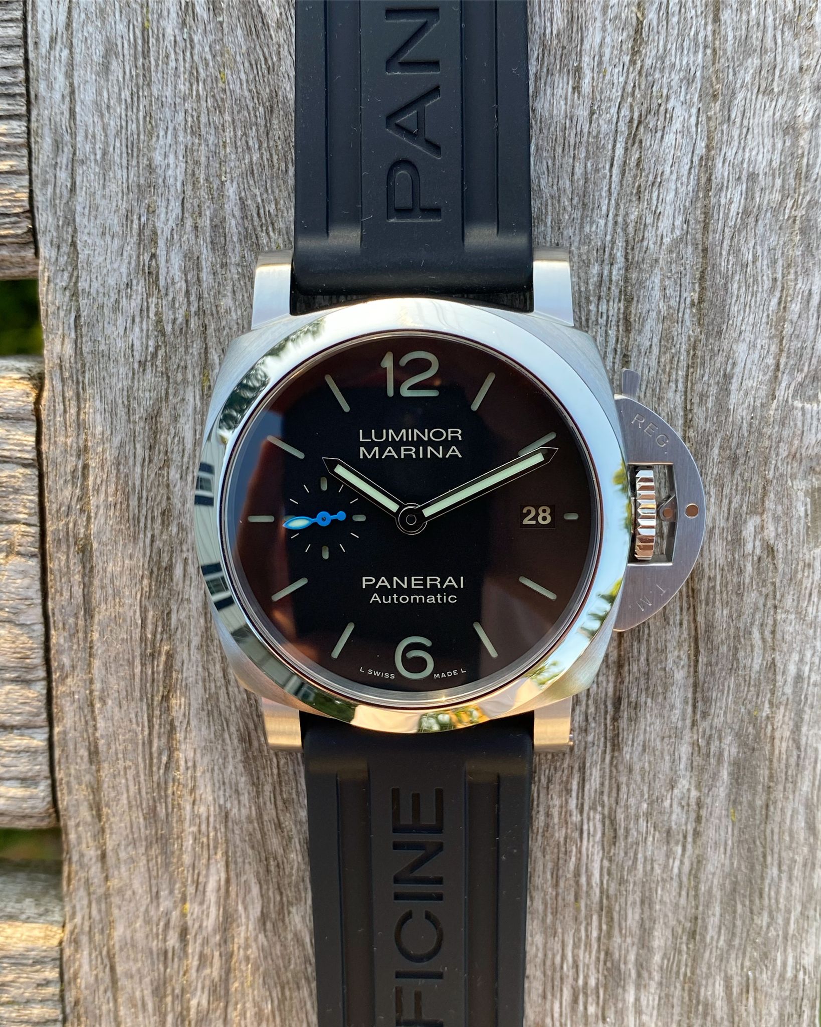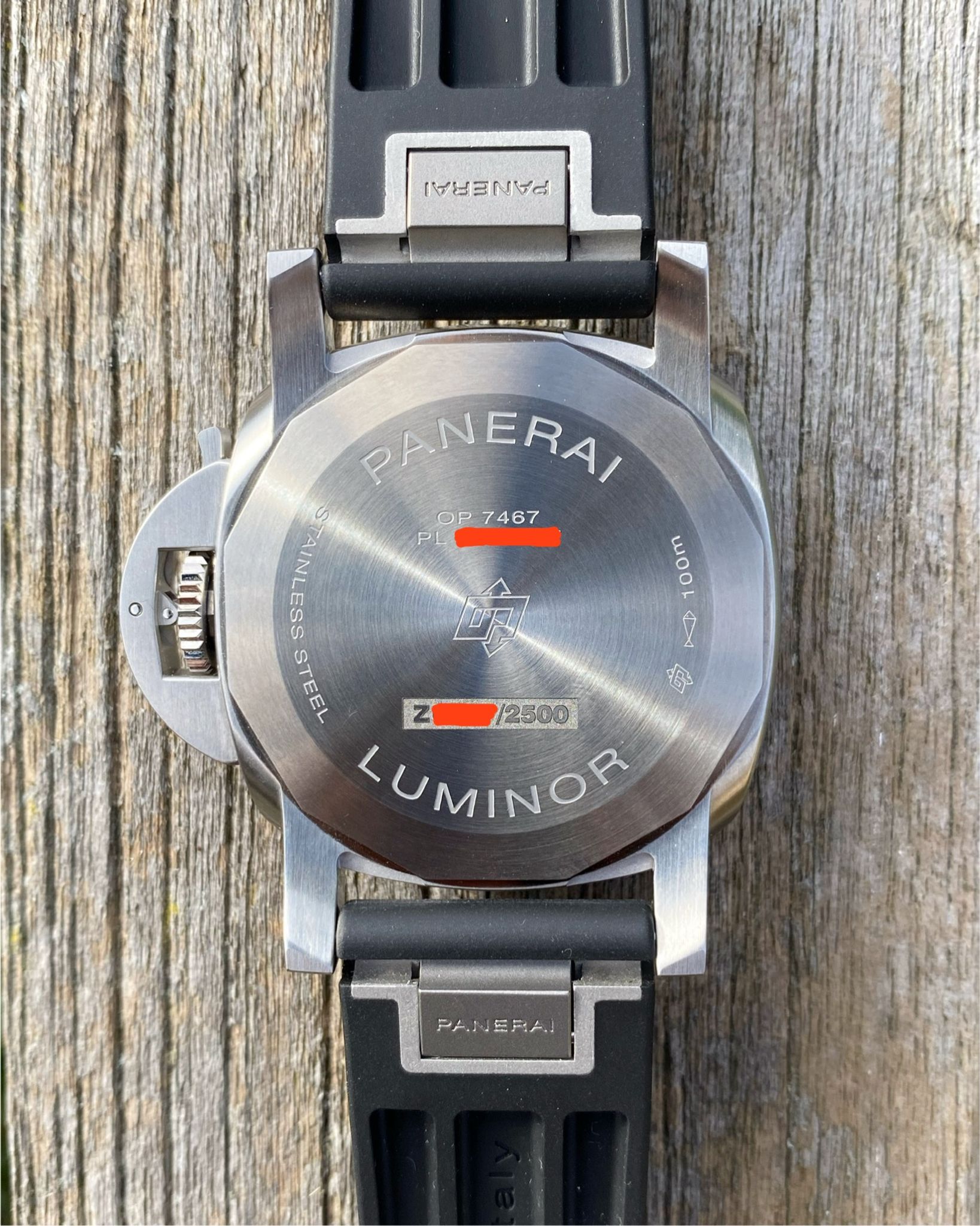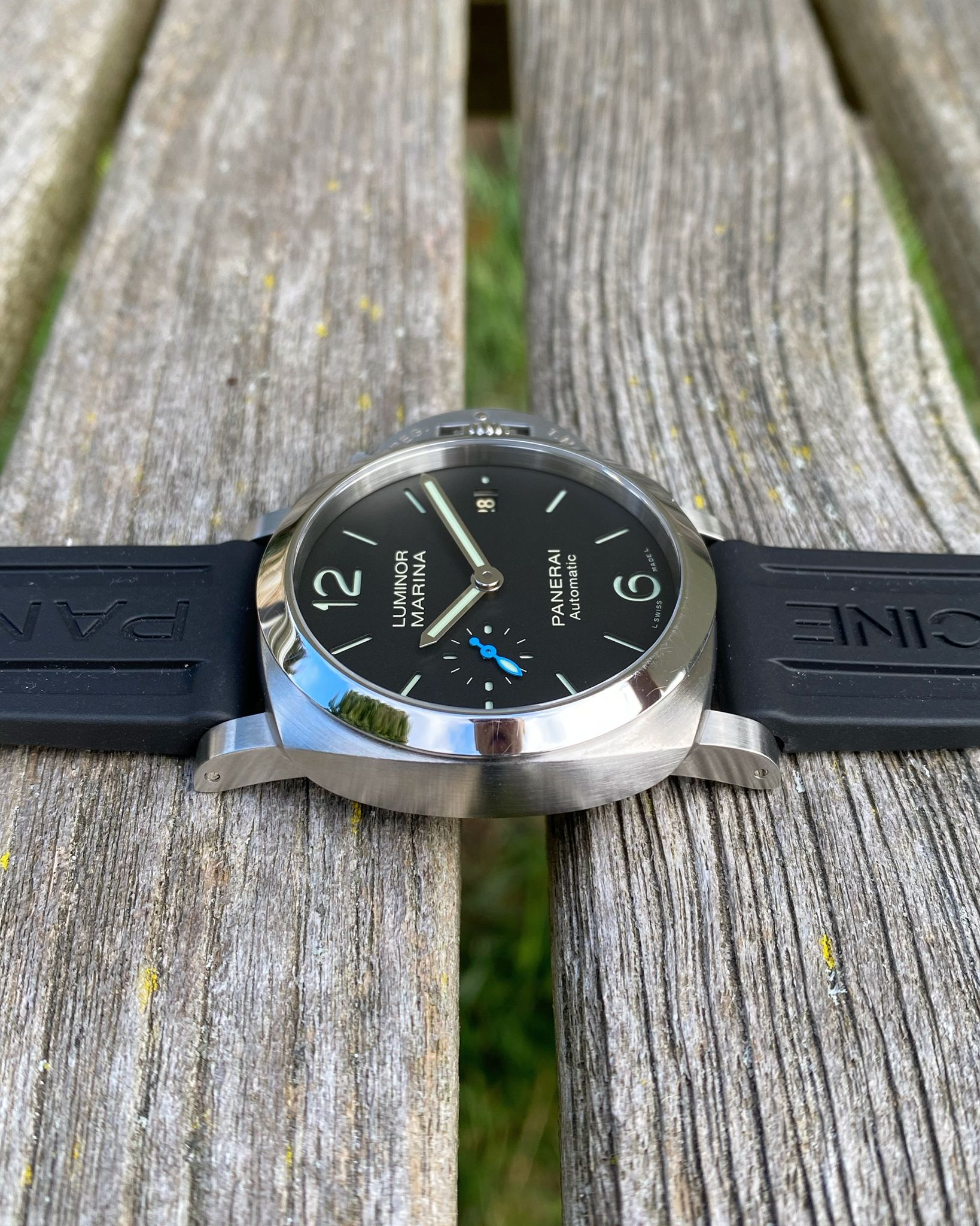 The case has been well preserved, showing only faint surface-level hairline scratches on the high-polish bezel, while the OEM tang buckle exhibits a few light hairlines. The OEM calfskin strap displays light creasing from storage and light previous wear but retains the majority of its use life, while the rubber strap appears to have seen little to no wrist time. Overall the Panerai is near mint condition, having been worn sparingly by its previous owner, and is under factory warranty until October 2031.