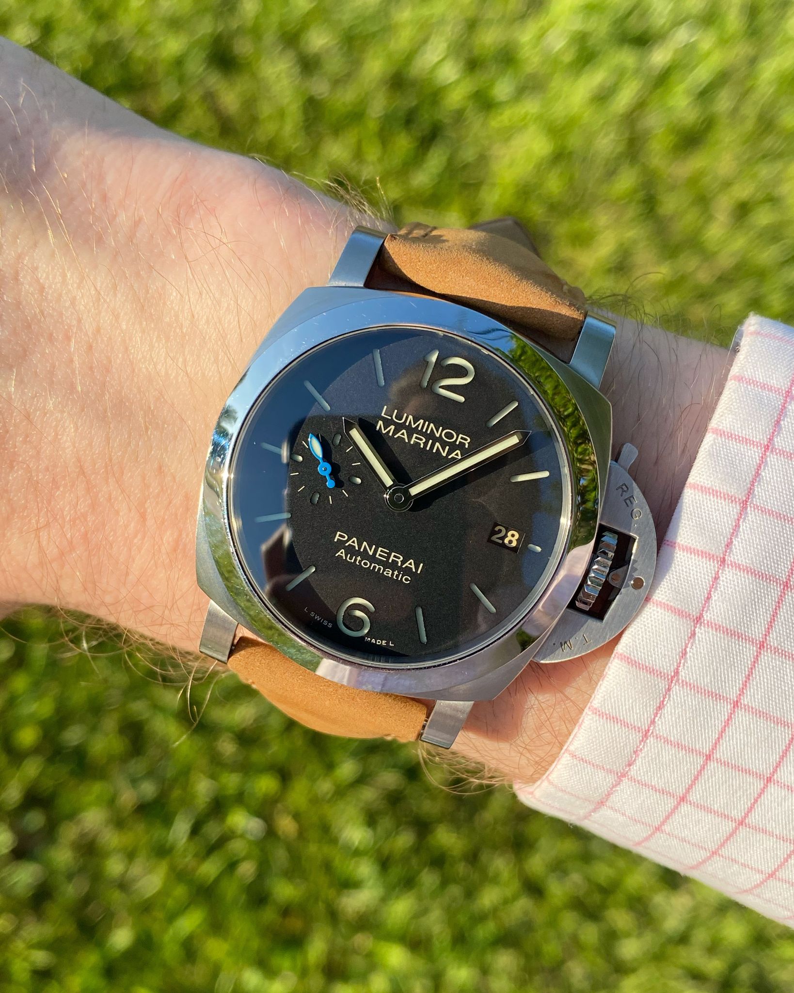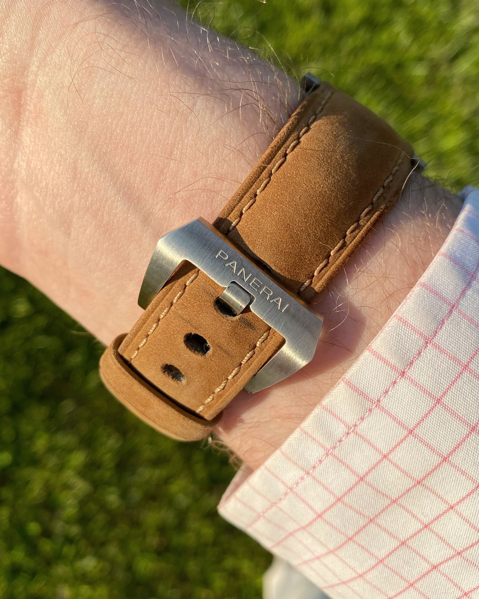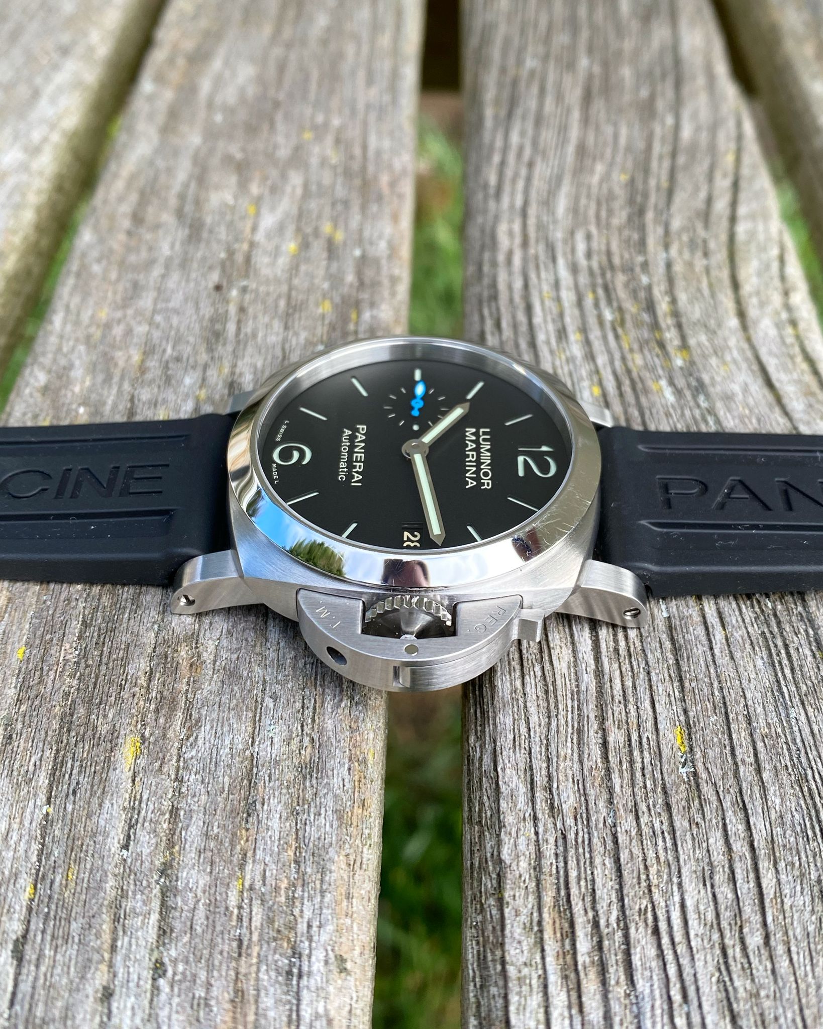 The case has been well preserved, showing only faint surface-level hairline scratches on the high-polish bezel, while the OEM tang buckle exhibits a few light hairlines. The OEM calfskin strap displays light creasing from storage and light previous wear but retains the majority of its use life, while the rubber strap appears to have seen little to no wrist time. Overall the Panerai is near mint condition, having been worn sparingly by its previous owner, and is under factory warranty until October 2031.
