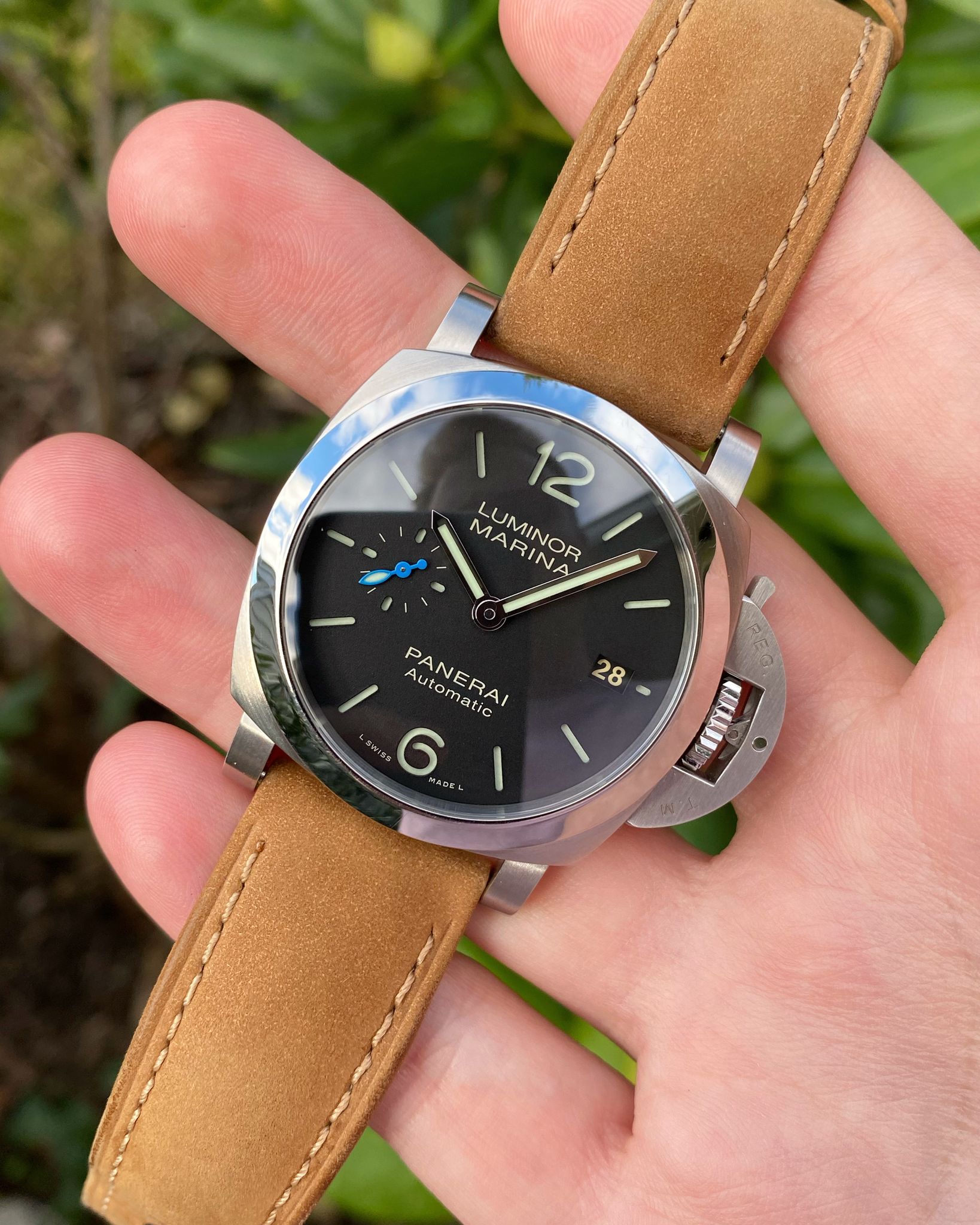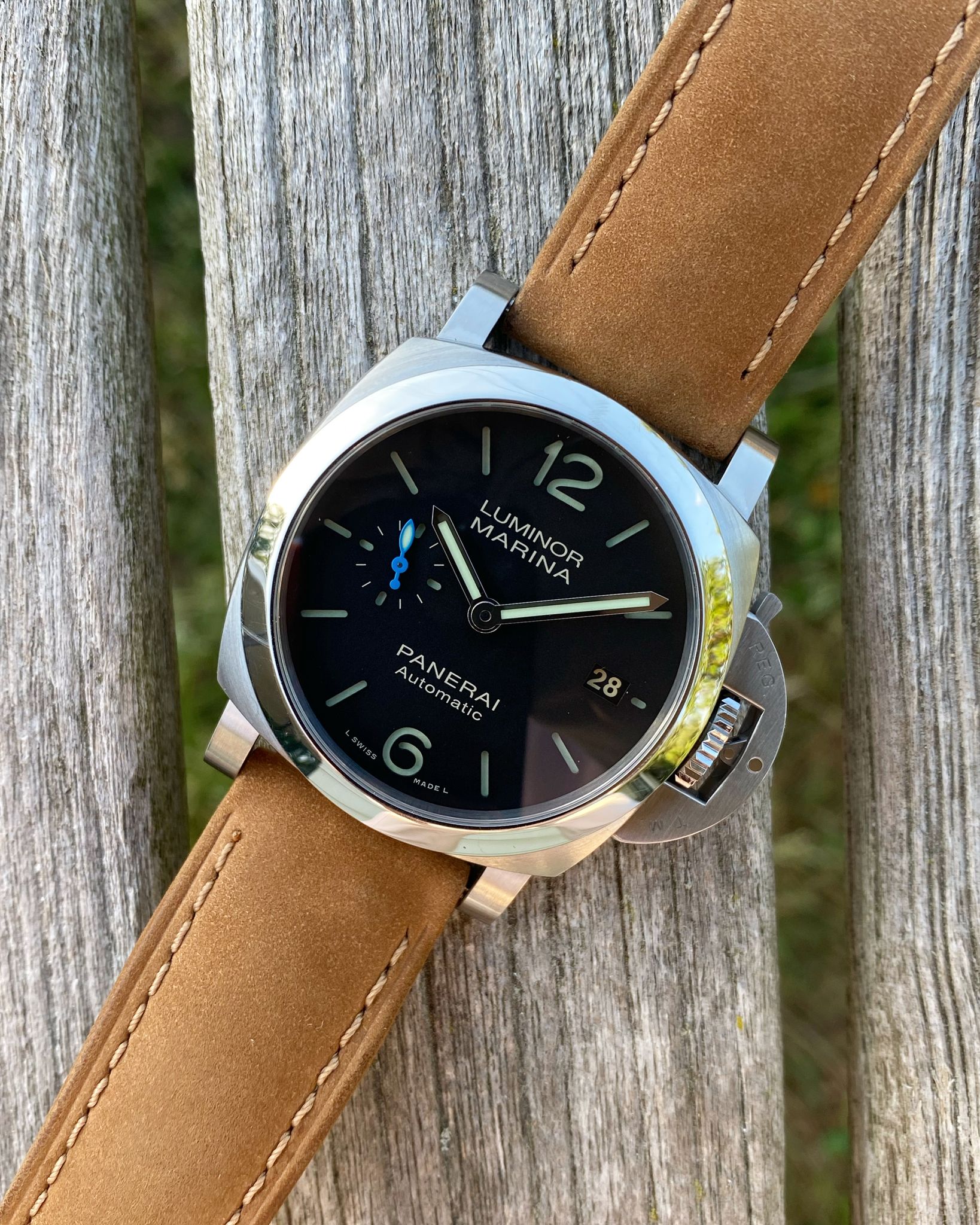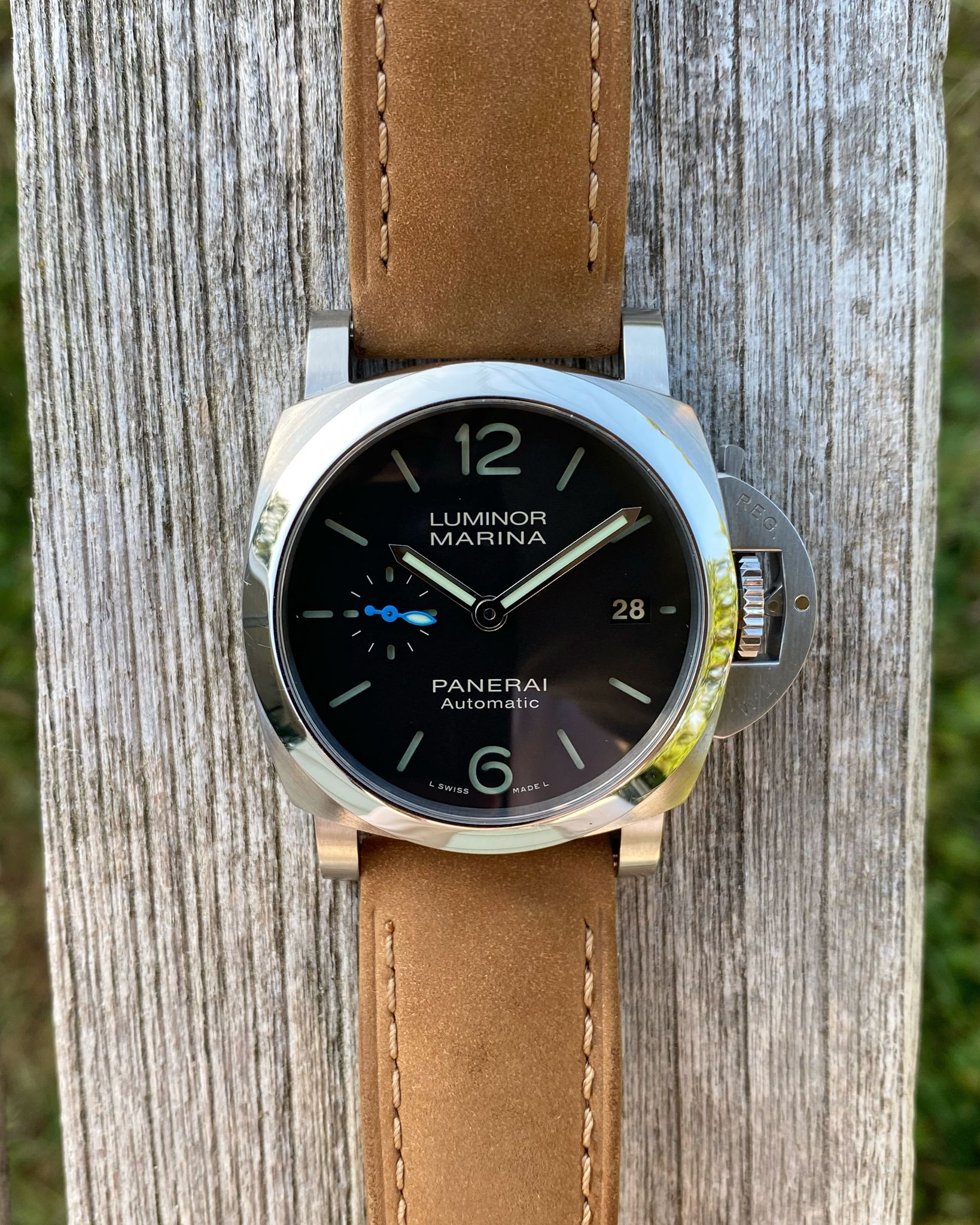 The Panerai features a brushed steel case, which is accented by a smooth polished steel bezel. The Luminor is currently mounted on an OEM click release brown Scamosciato (suede) calfskin strap, which is secured by an OEM brushed steel tang buckle. The Luminor Quaranta features a black sandwich dial with recessed luminous index and Arabic numeral hour markers, polished luminous hands, a date window aperture at 3 o'clock, and sub seconds register at 9 o’clock. The movement used in the PAM01372 is the Panerai in-house Caliber P.900, which features approximately 72 hours of power reserve, and is under factory warranty.