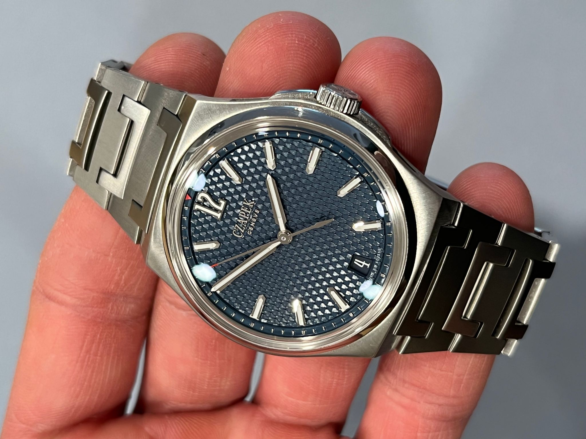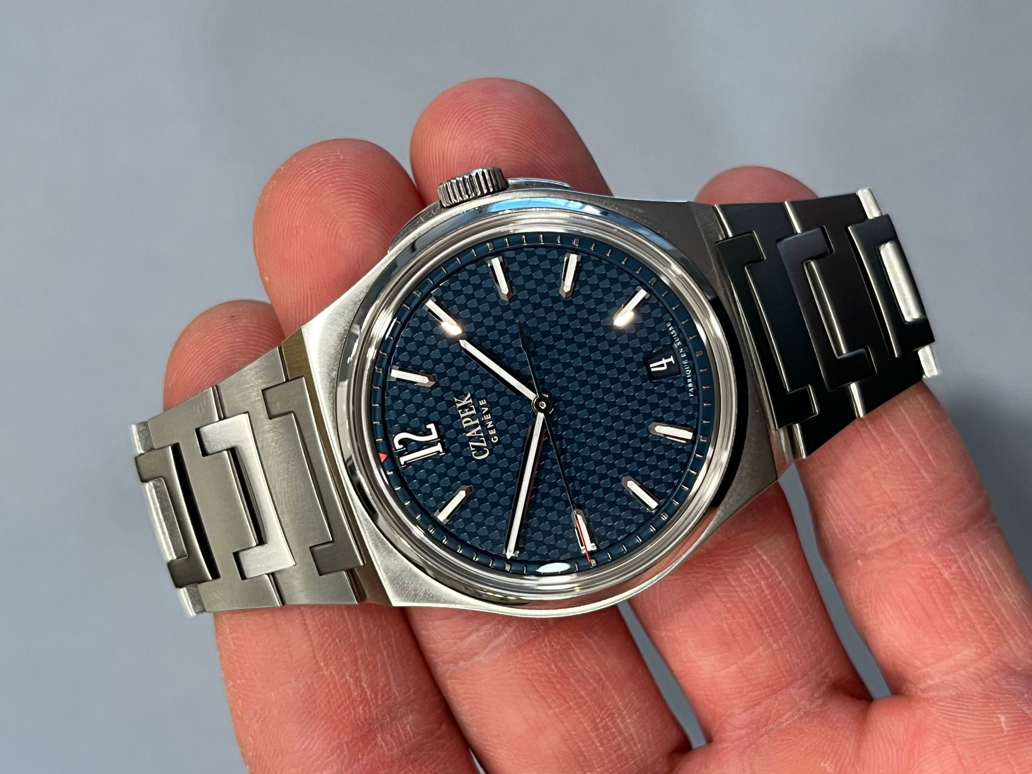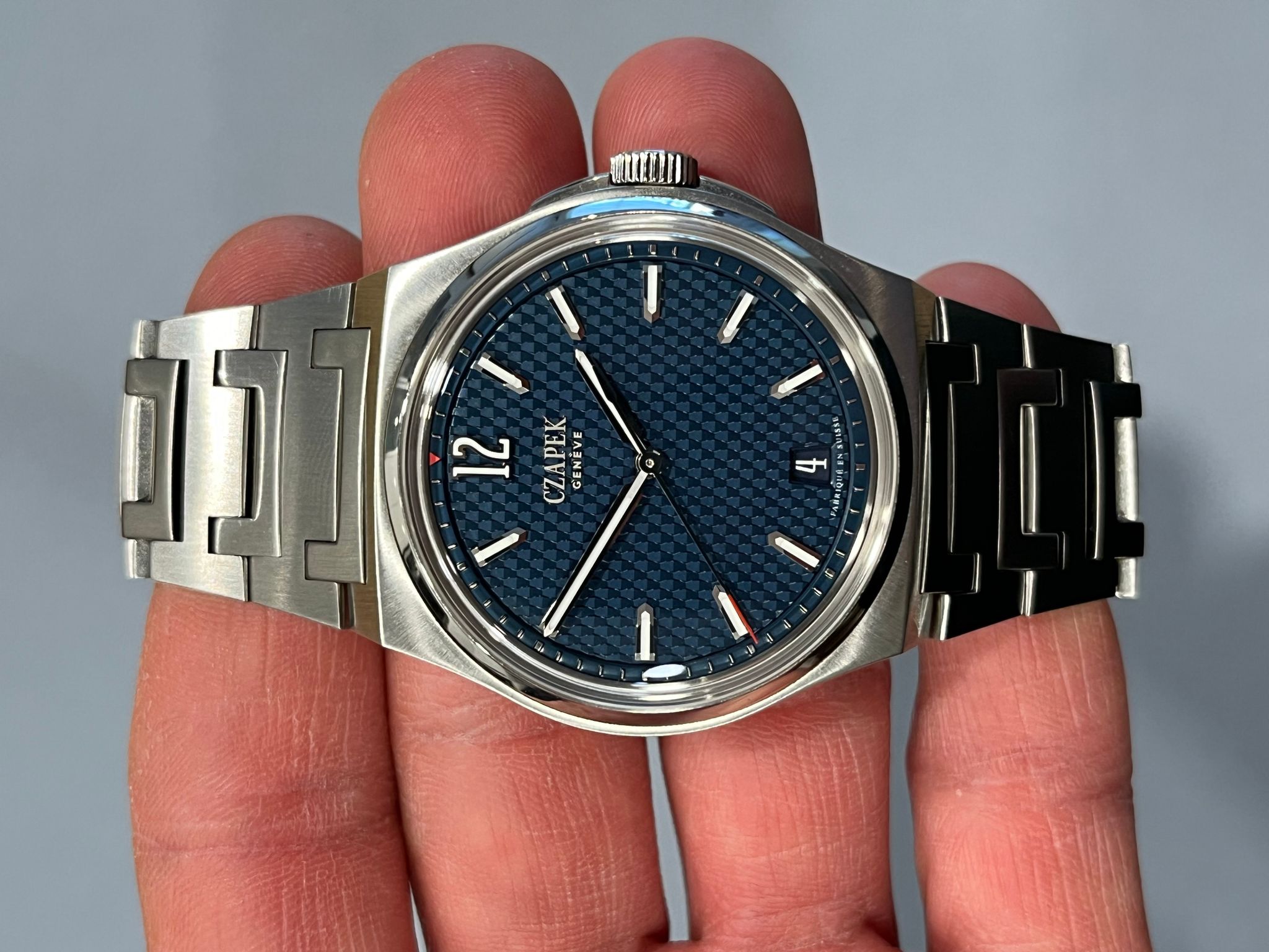 The Czapek Passage de Drake Antarctique Blue is a masterful blend of cutting-edge design and haute horology, capturing the essence of modern elegance. This full complete set, in like-new condition, is a testament to Czapek’s dedication to precision and artistry. Its 40.5mm stainless steel case features a sleek, integrated bracelet that flows seamlessly, embodying a contemporary yet timeless aesthetic. The striking Antarctique Blue dial is a showstopper, with its unique “Stairway to Eternity” motif—a pattern of delicate trapezoidal lines that play beautifully with light, creating a dynamic visual effect.