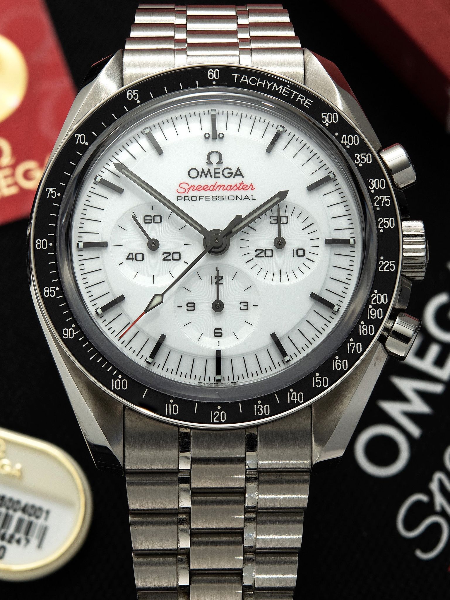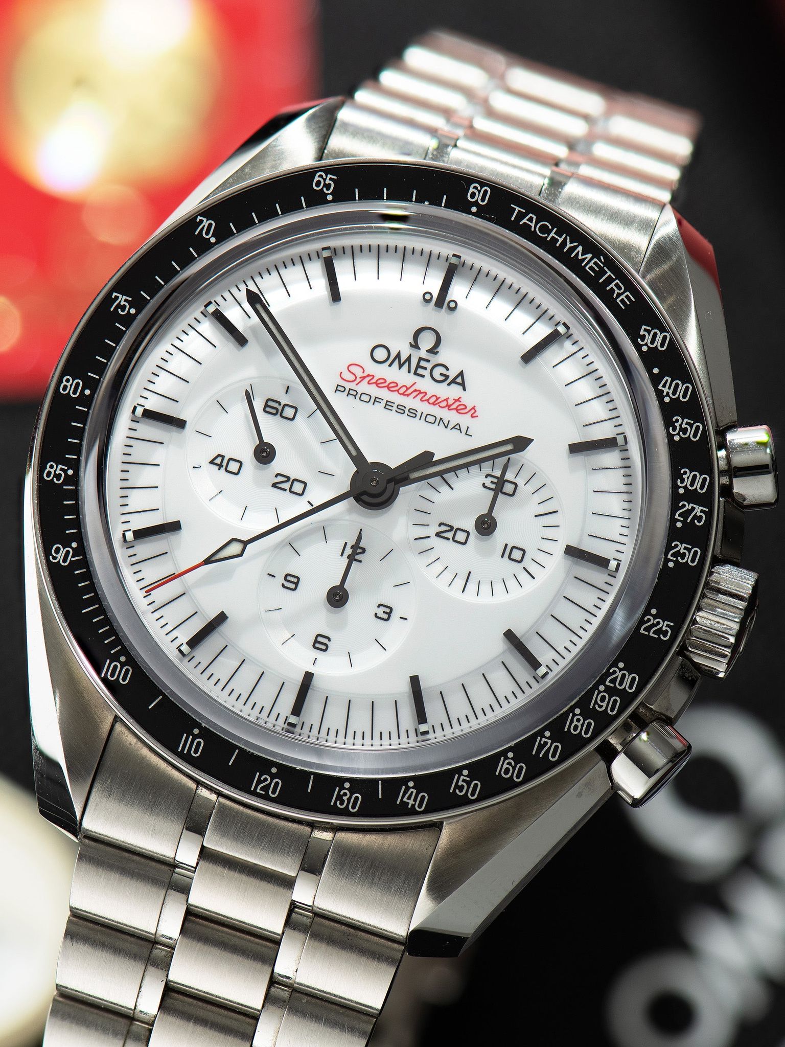 released in 2024, the Omega Speedmaster Professional ref. 310.30.42.50.04.001 is an ode to Omega's history and pursuit of innovation and evolution. The Alaska Project-inspired white dial is gorgeous and features black and red accents for optimum legibility, the master-chronometer movement achieved by the co-axial Cal. 3861 ensures precise timekeeping, and the "dot over 90" bezel and tapered bracelet are a nod to the storied legacy of past Omega Speedmasters.