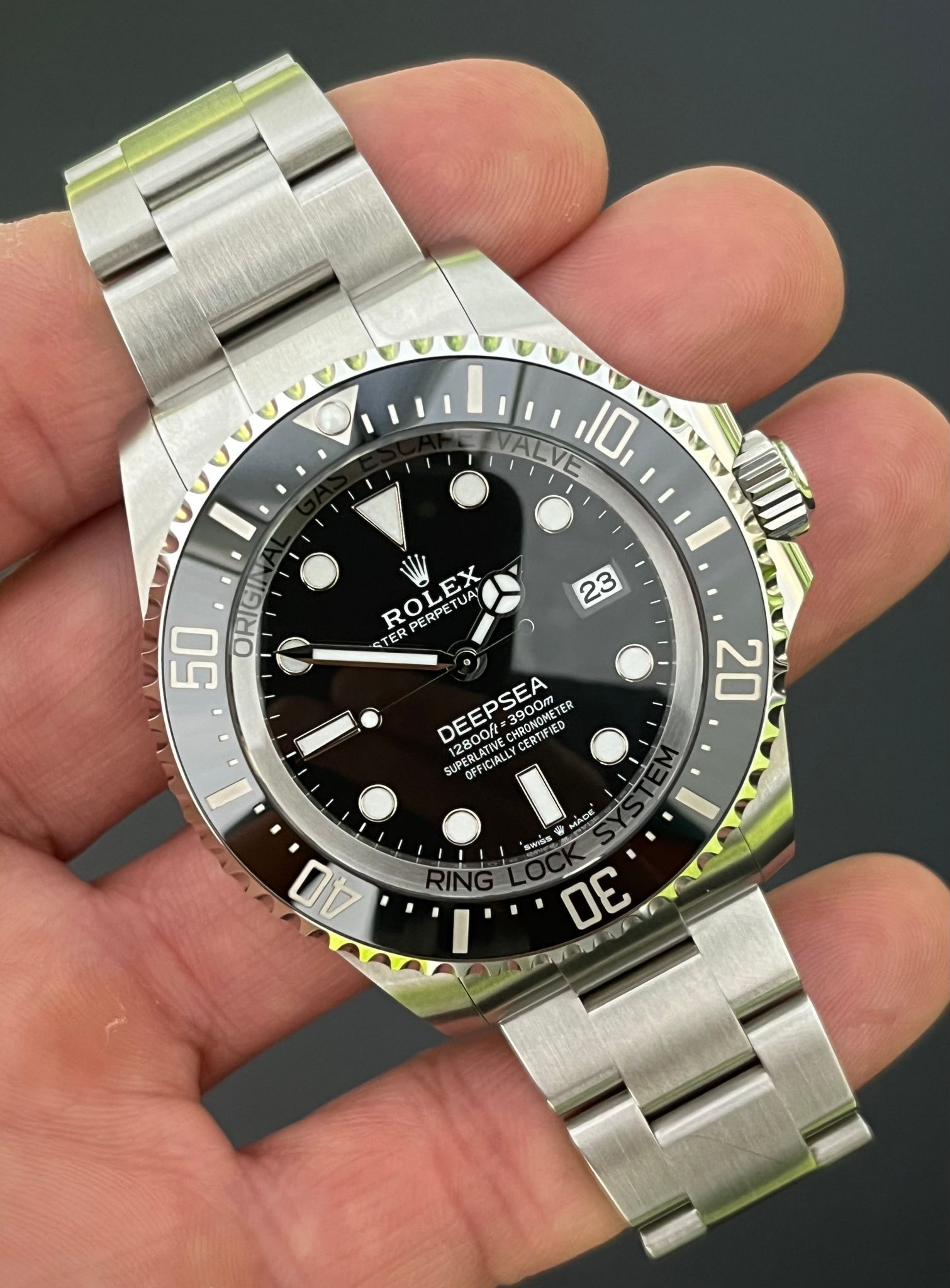 Powered by the Rolex Caliber 3235 automatic movement, this Deepsea boasts a 70-hour power reserve, exceptional accuracy, and resistance to shocks and magnetic fields. Its sleek black dial, highlighted by bold white hour markers and hands, is complemented by the classic Oyster bracelet with a Glidelock clasp for precise adjustment and comfort. Perfect for professional divers and enthusiasts alike, this reference epitomizes Rolex's dedication to performance, reliability, and style.