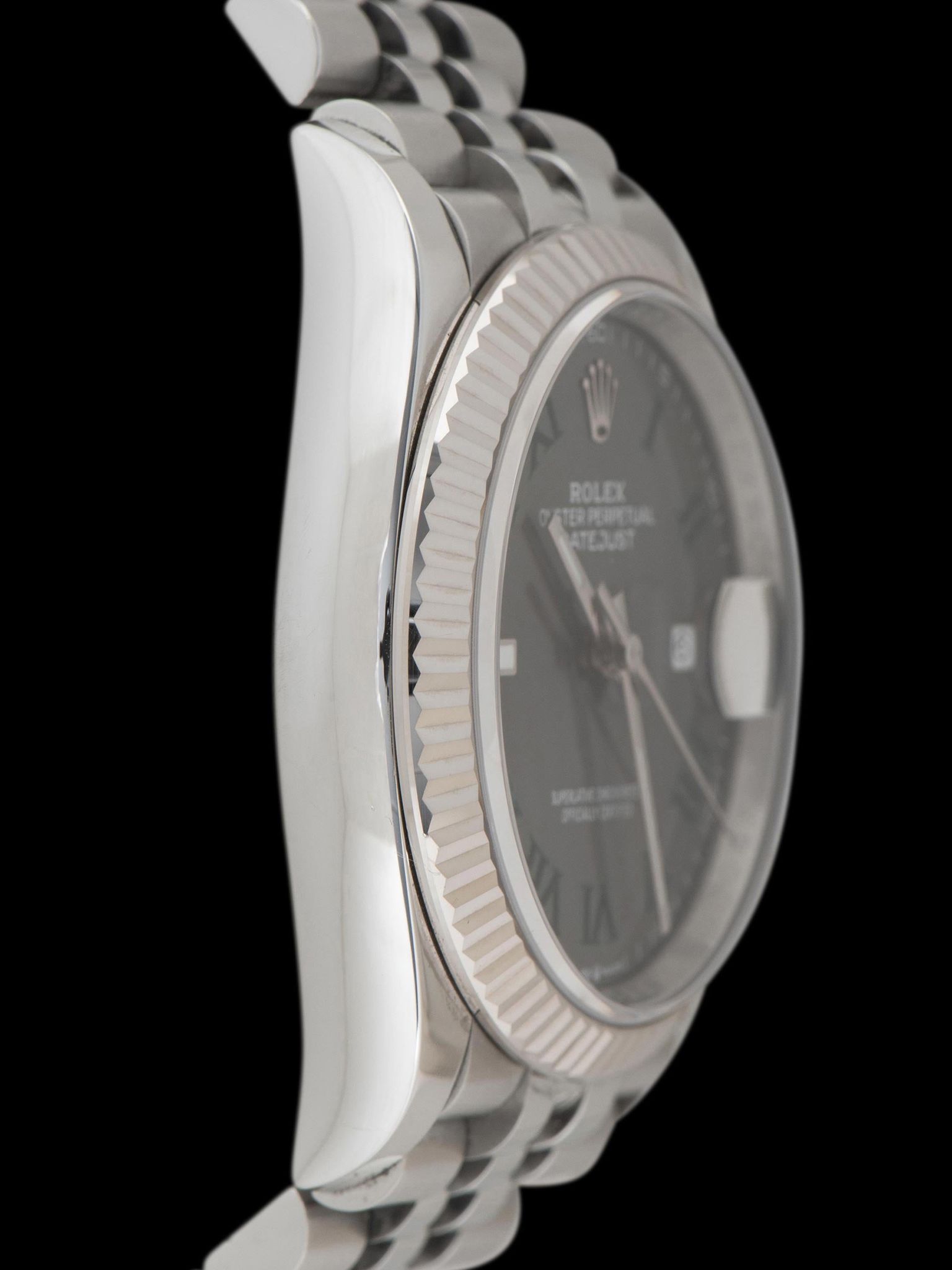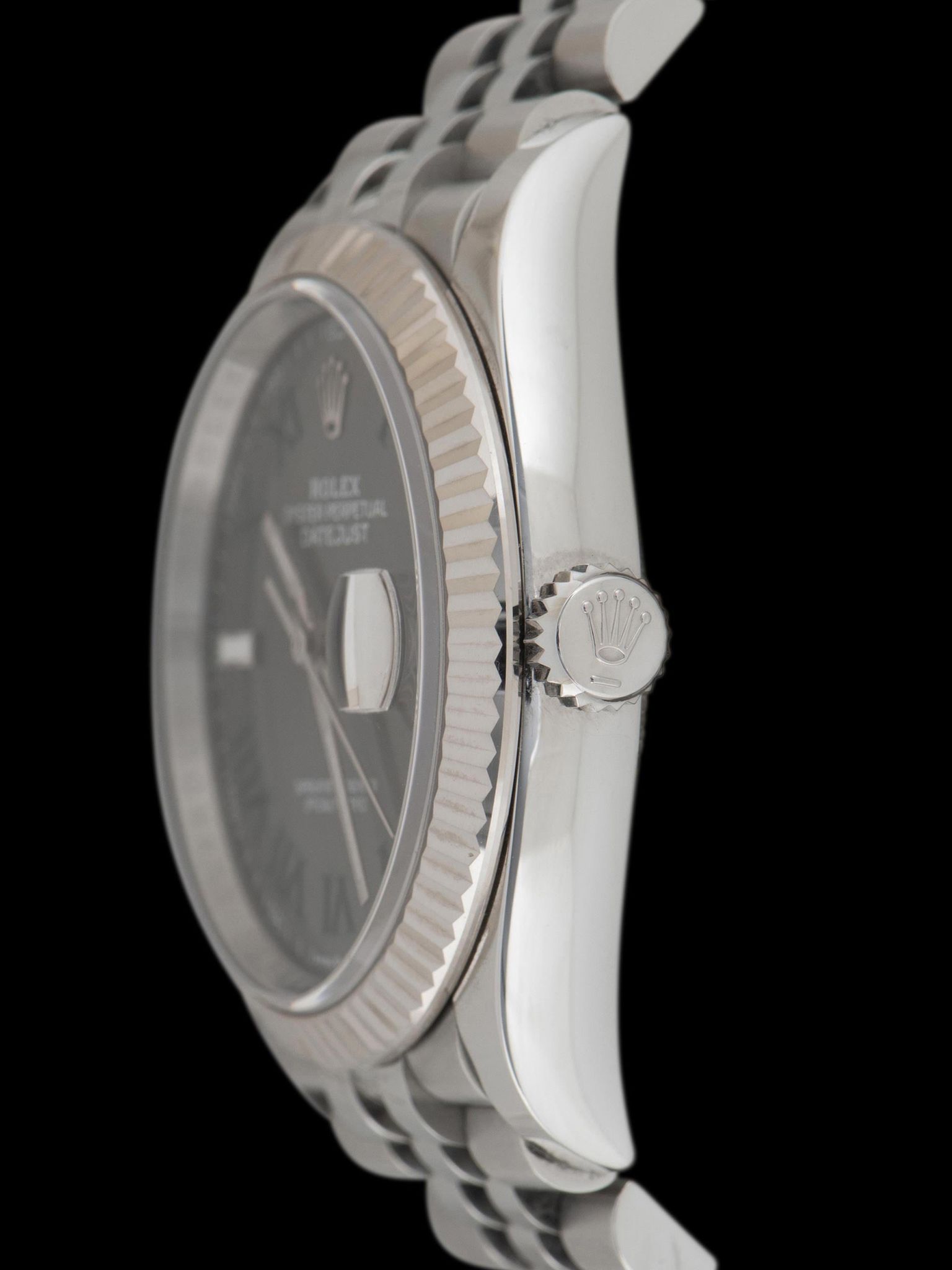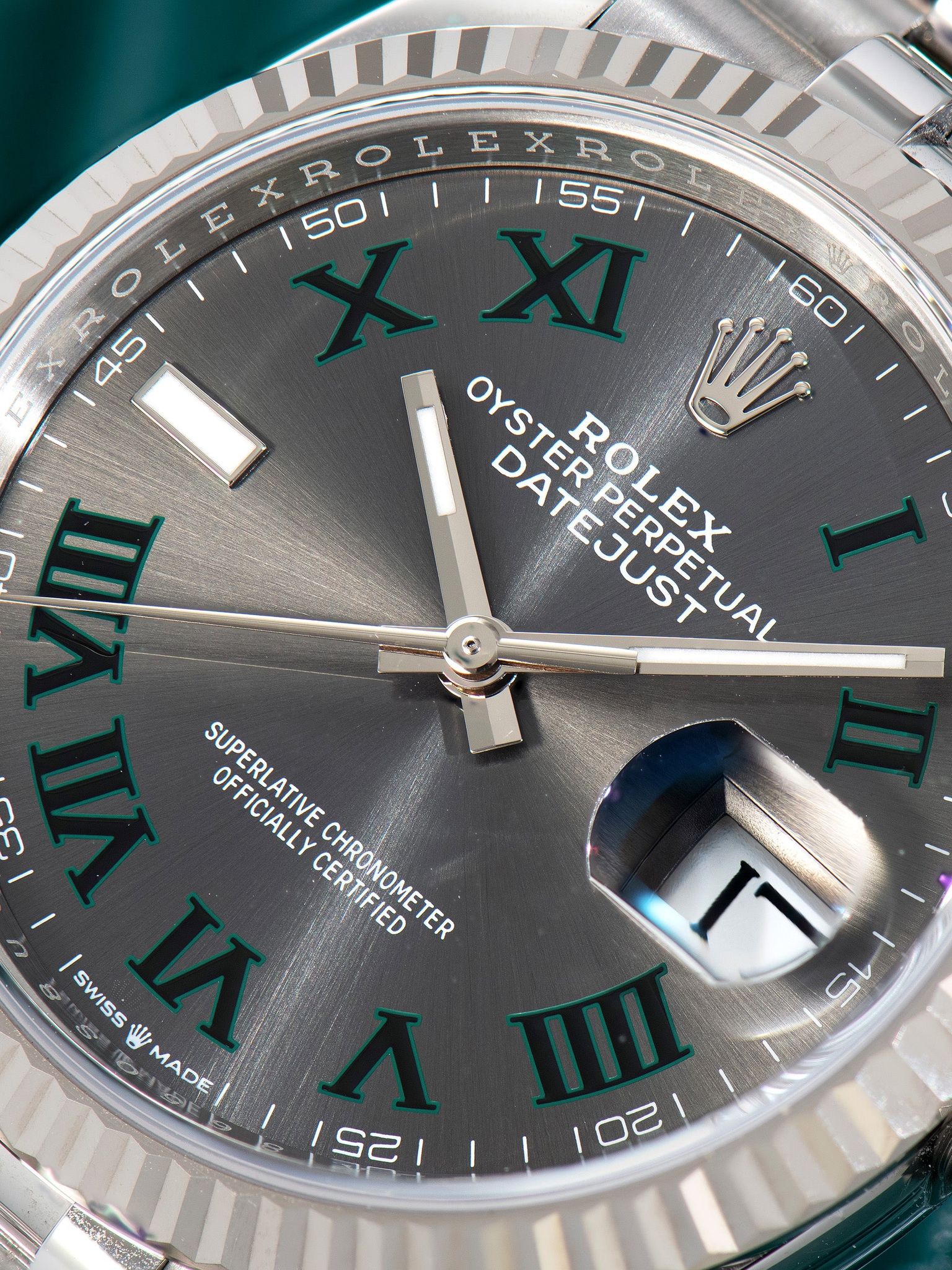 Presented in a classic 36mm Oyster case, this modern Datejust features one of the most desirable dials from Rolex in recent years, the "Wimbledon" dial. Featuring a crisp slate grey sunburst dial, a single lumed marker, and black roman numeral makers highlighted by a green outline. While not the official name, the "Wimbledon" nickname is inspired by Rolex and the famed tennis tournament's longstanding partnership and seemingly inspired color scheme.