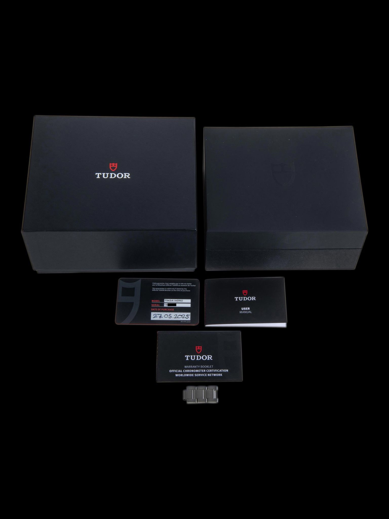 The watch is a complete set, with its original inner and outer boxes, Tudor warranty card, and booklets.