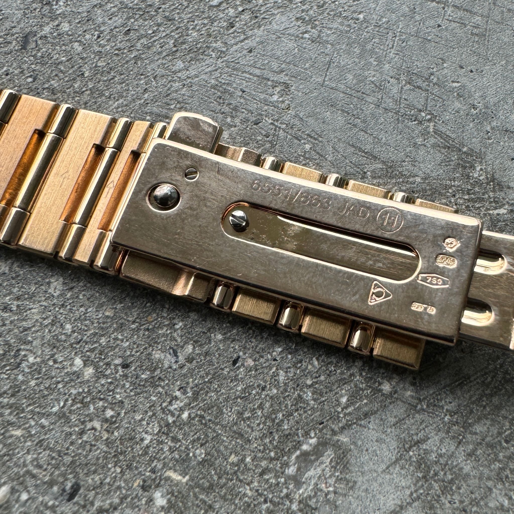 Case: 27.5 mm 18 karat solid rose gold case is in stunning condition including nice sharp case and bracelet.