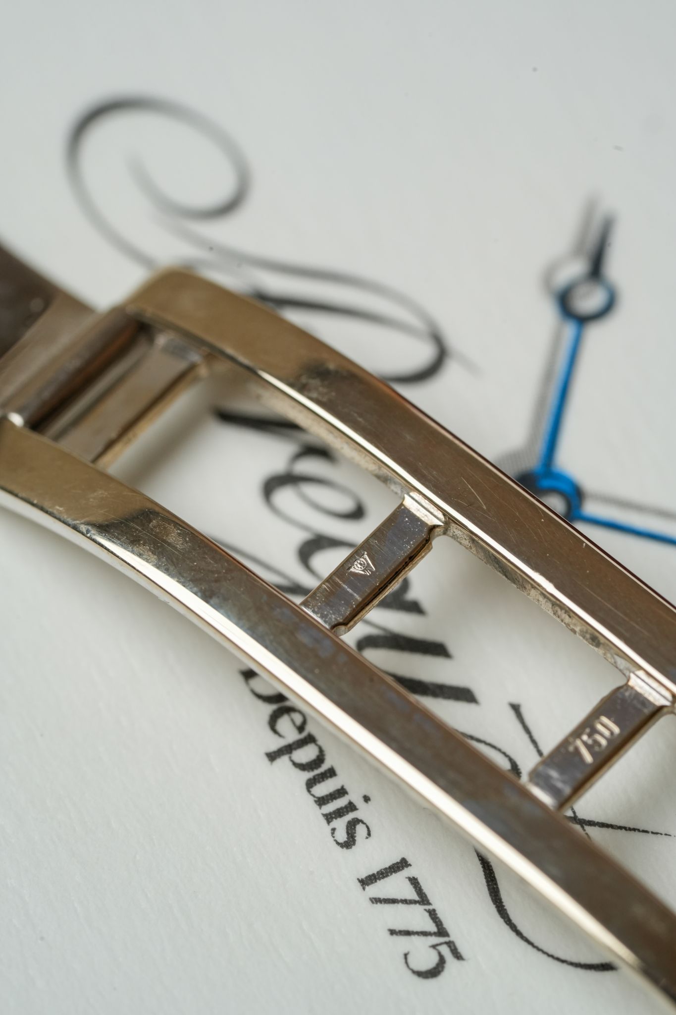 A Breguet ref. 3130 in solid 18k white gold, fitted with a magical Breguet-signed bracelet crafted by the renowned German jewelry house Wellendorff. Founded in 1893, Wellendorff has long been celebrated for its high jewelry, occasionally dipping its toes into the watch market. Their watch bracelets are legendary among collectors, most often associated with early A. Lange & Söhne models, where they can nearly double the value of the watch they accompany. This example unites that masterful bracelet with the elegant proportions of the 3130, resulting in a rare marriage of refinement and restraint.