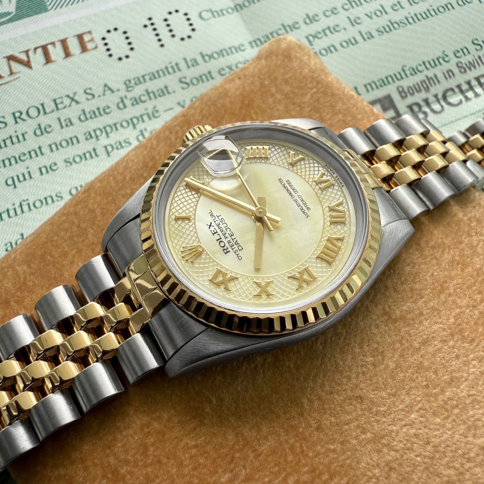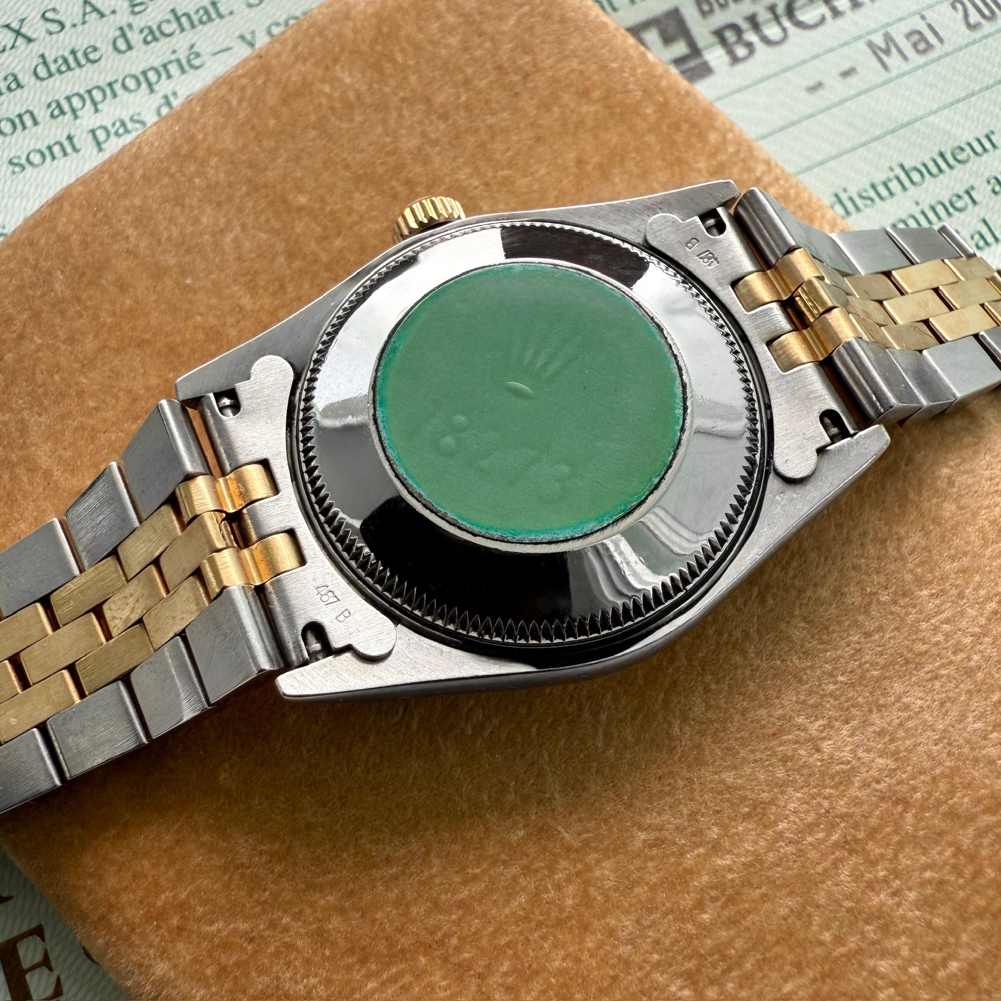 Complementing the radiant dial is the sharp, solid 18k gold fluted bezel, a hallmark of Rolex’s commitment to superior craftsmanship. Paired with the iconic two-tone Jubilee bracelet—crafted with stainless steel outer links and 18k gold center links—this watch delivers unparalleled comfort and an undeniably elegant style.