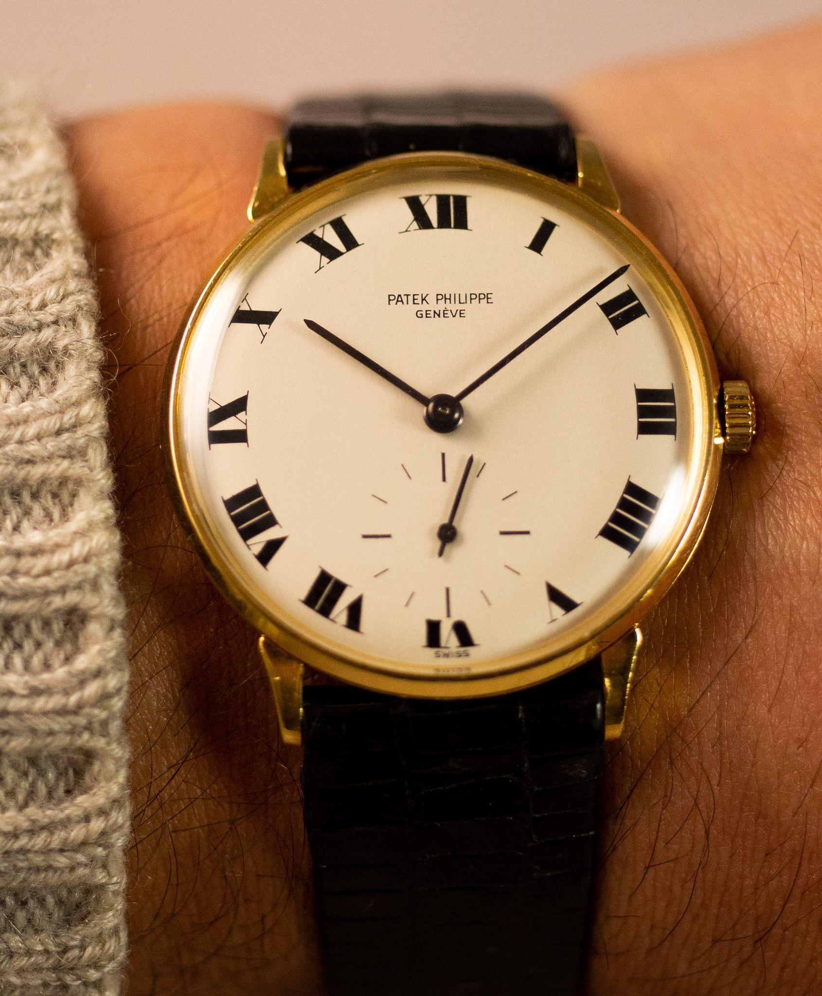 This is a rare 1960's Patek Philippe Calatrava in mint original condition! This is a reference 3420 but unlike most examples, it has a Roman Numeral dial and black hands. This combination is very modern and striking on the wrist. The condition of this watch is truly exceptional with a mint dial and sharp case. It also has its original buckle and box! Finding vintage Patek in this condition is very unusual and the watch is lovely on the wrist!