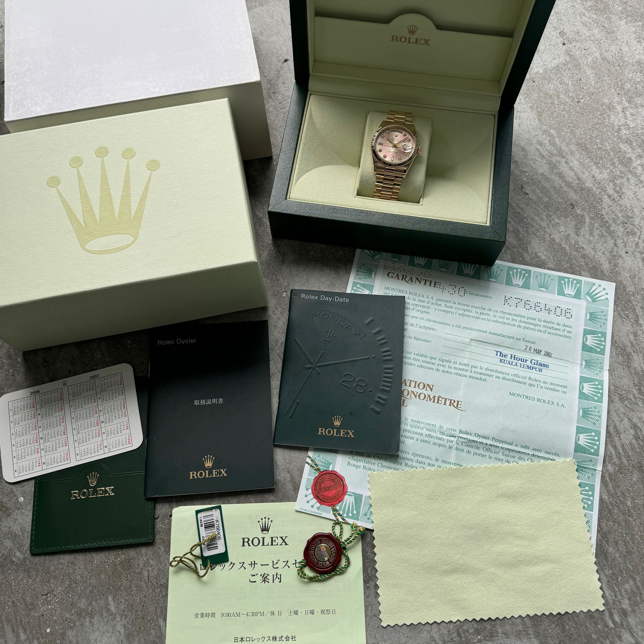Accessories: The watch comes with box and warranty card (dated 2002), booklets, Rolex seal, original hangtag, calendar, polishing cloth and everything else seen in the photos.