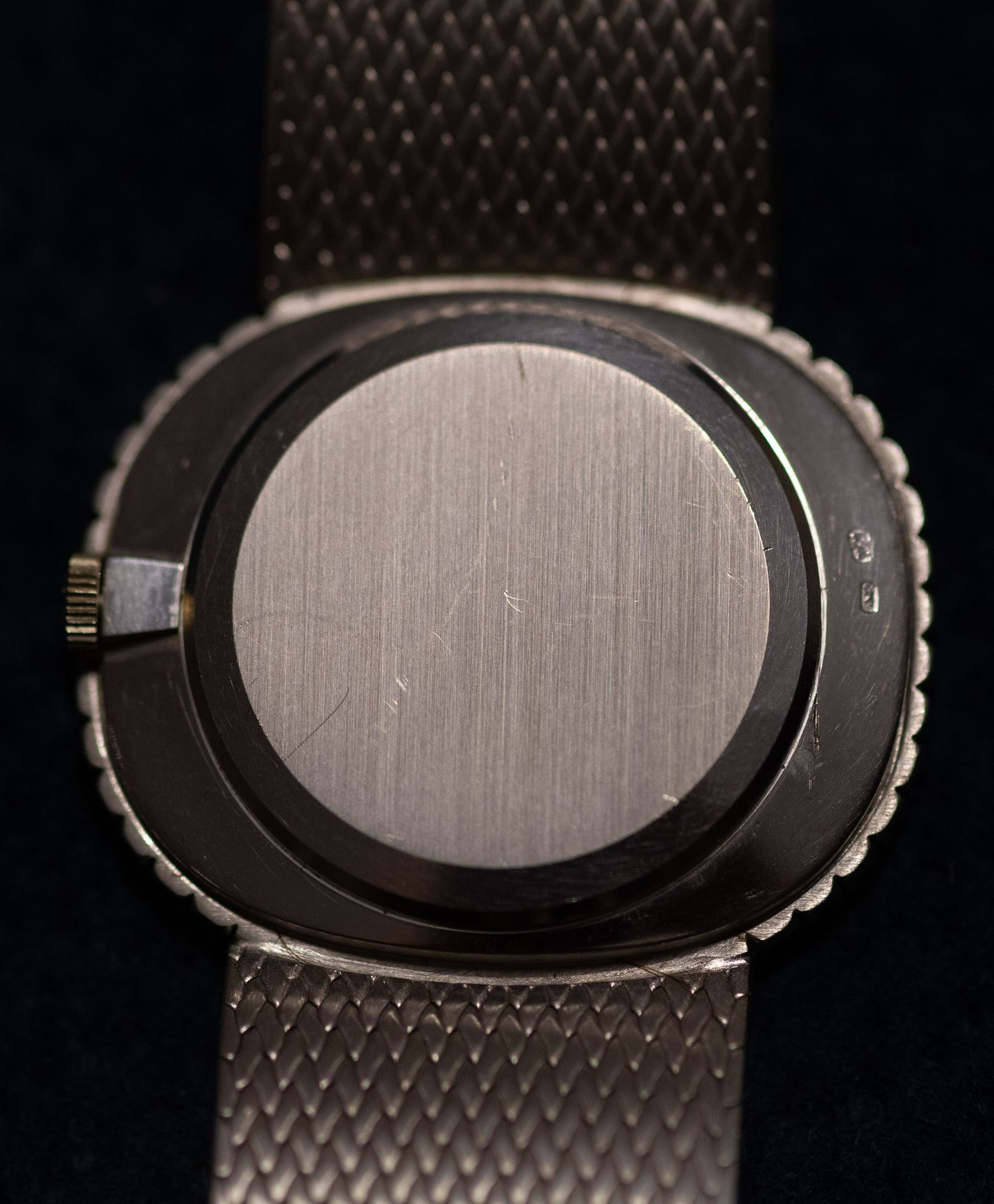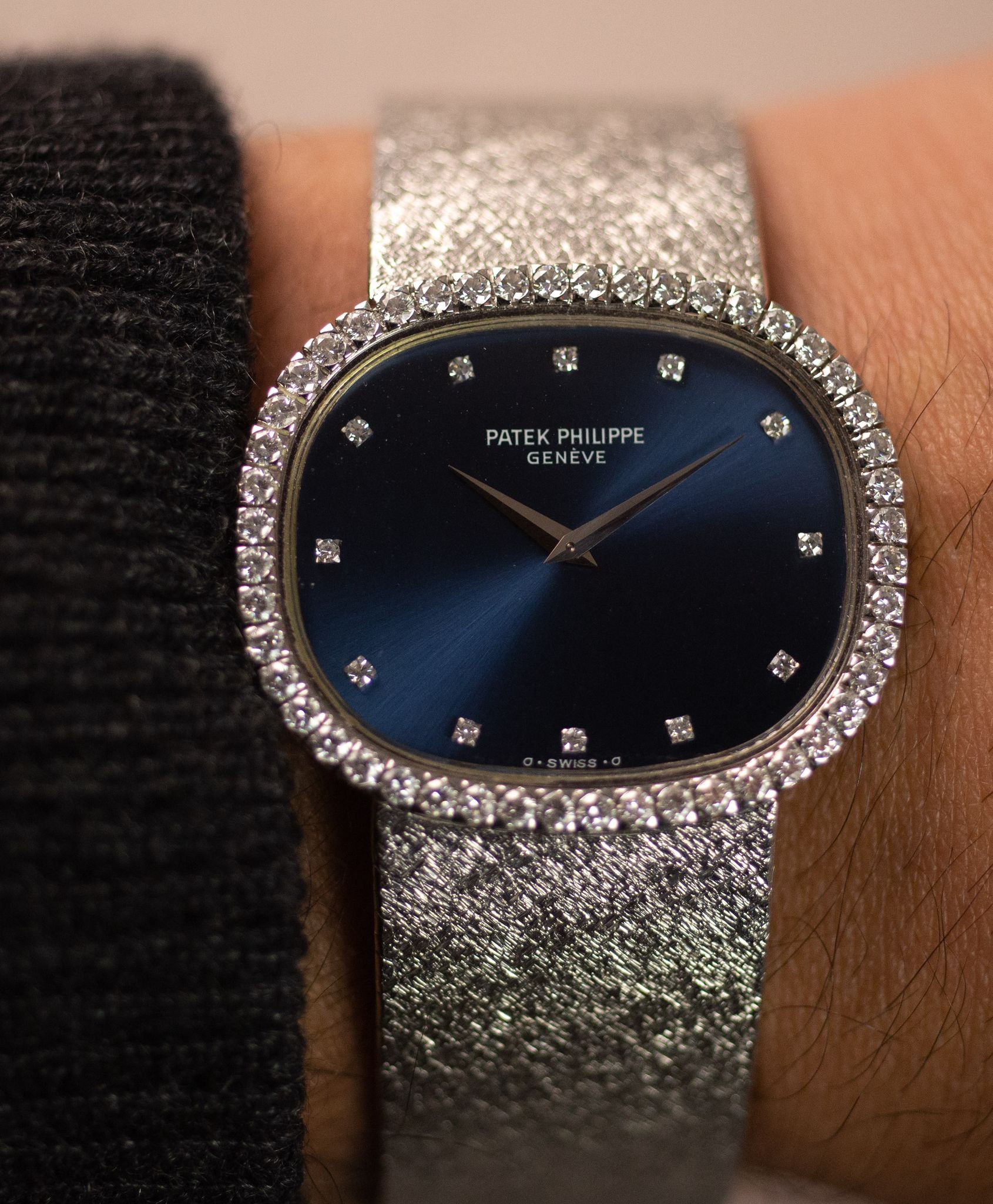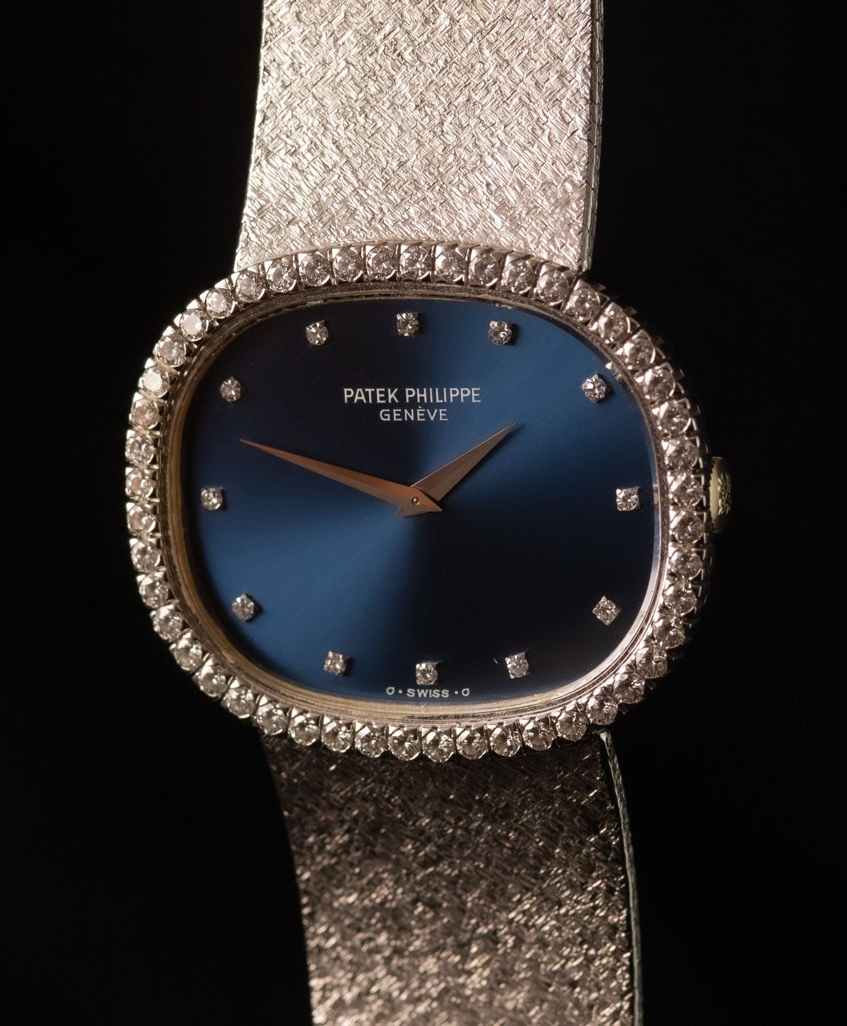 This is a lovely Patek Philippe reference 3745! This example has a striking blue dial with factory diamond markers and a factory diamond bezel. The watch has a textured 18k white gold bracelet and manual wind movement. Most bracelet watches like this have small cases but this has a nice 34mm case making it suitable for most collectors. The bracelet fits a 7-7.25 inch wrist. The condition is excellent and the watch is quite striking on the wrist!