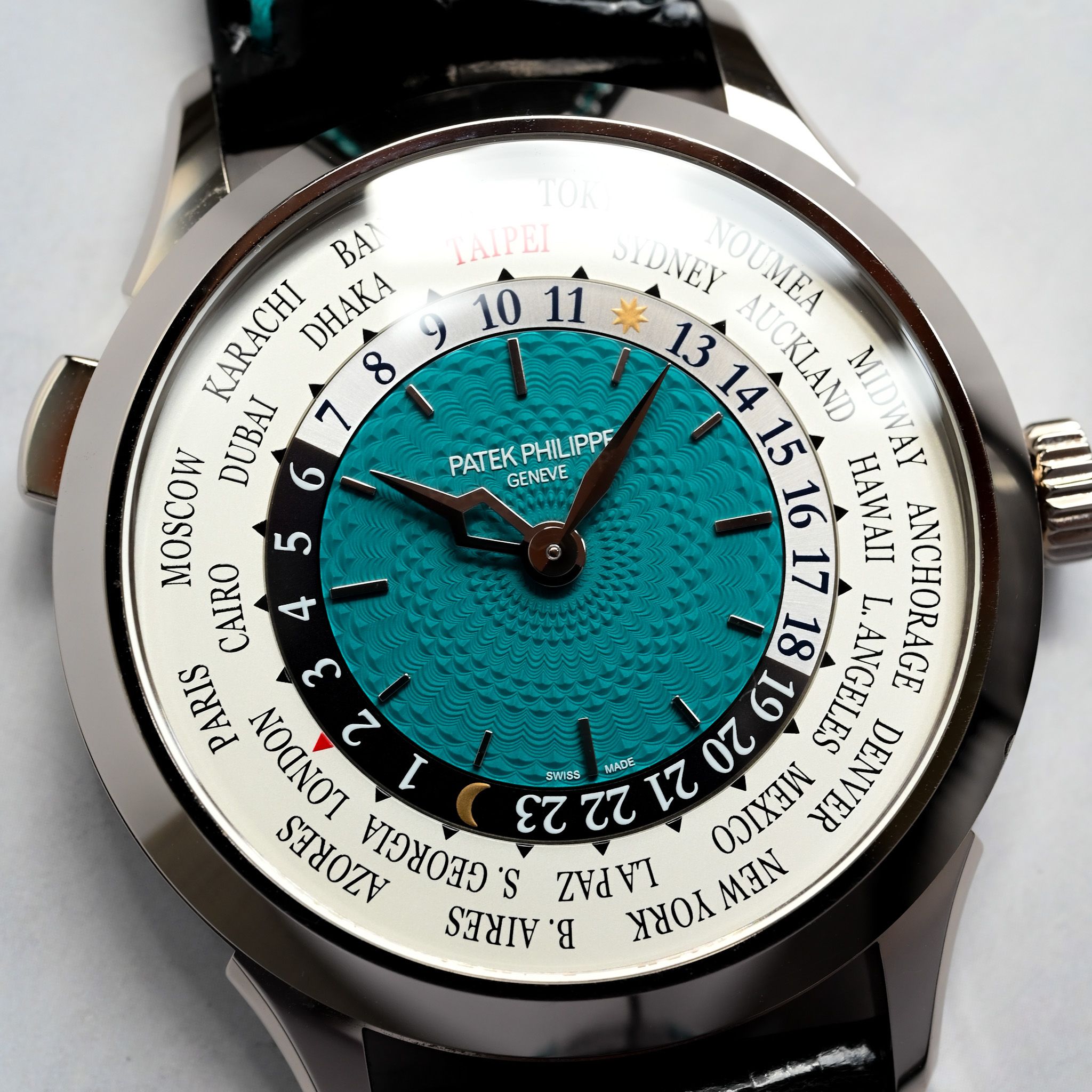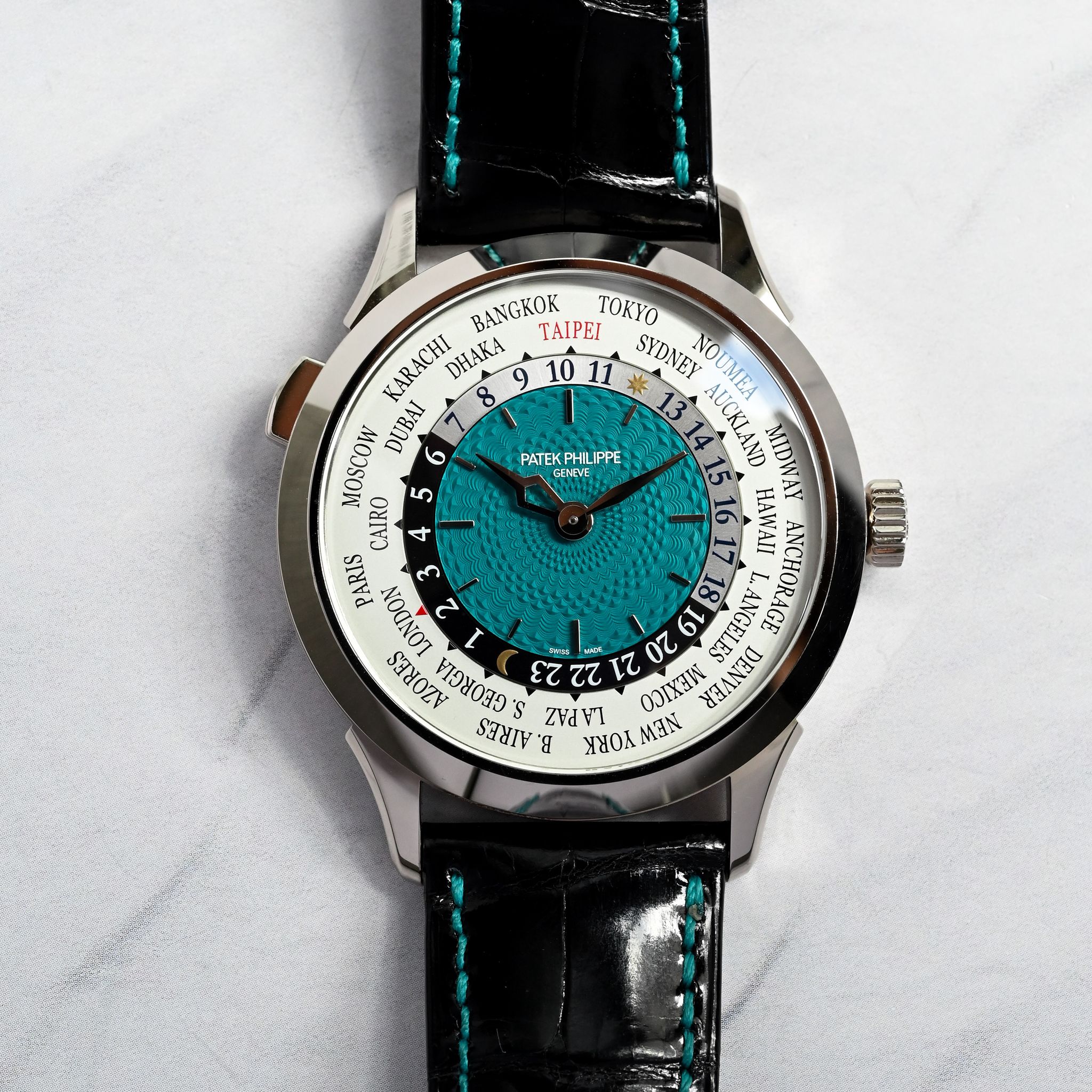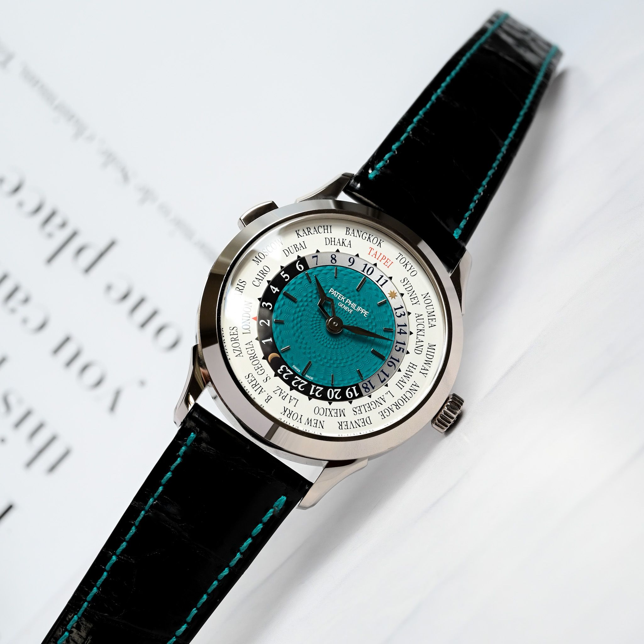 The dial is turquoise blue, and the city disc highlights the capital Taipei in red instead of the usual Hong Kong. The hands are inspired by those on reference 2523, but more contemporary. The center of the dial features a magnificent hand-engraved guilloché motif inspired by a pocket watch on display at the Patek Philippe Museum.