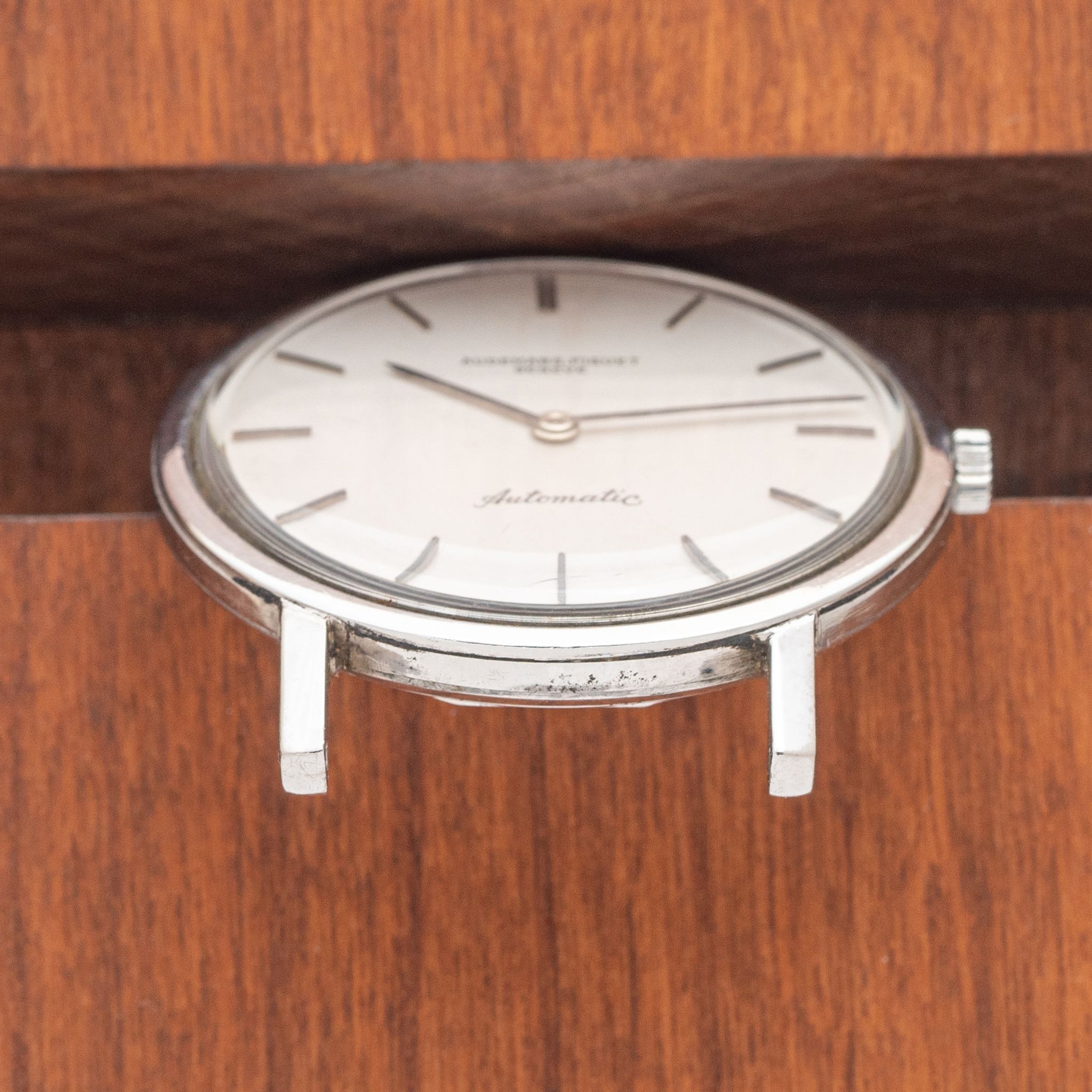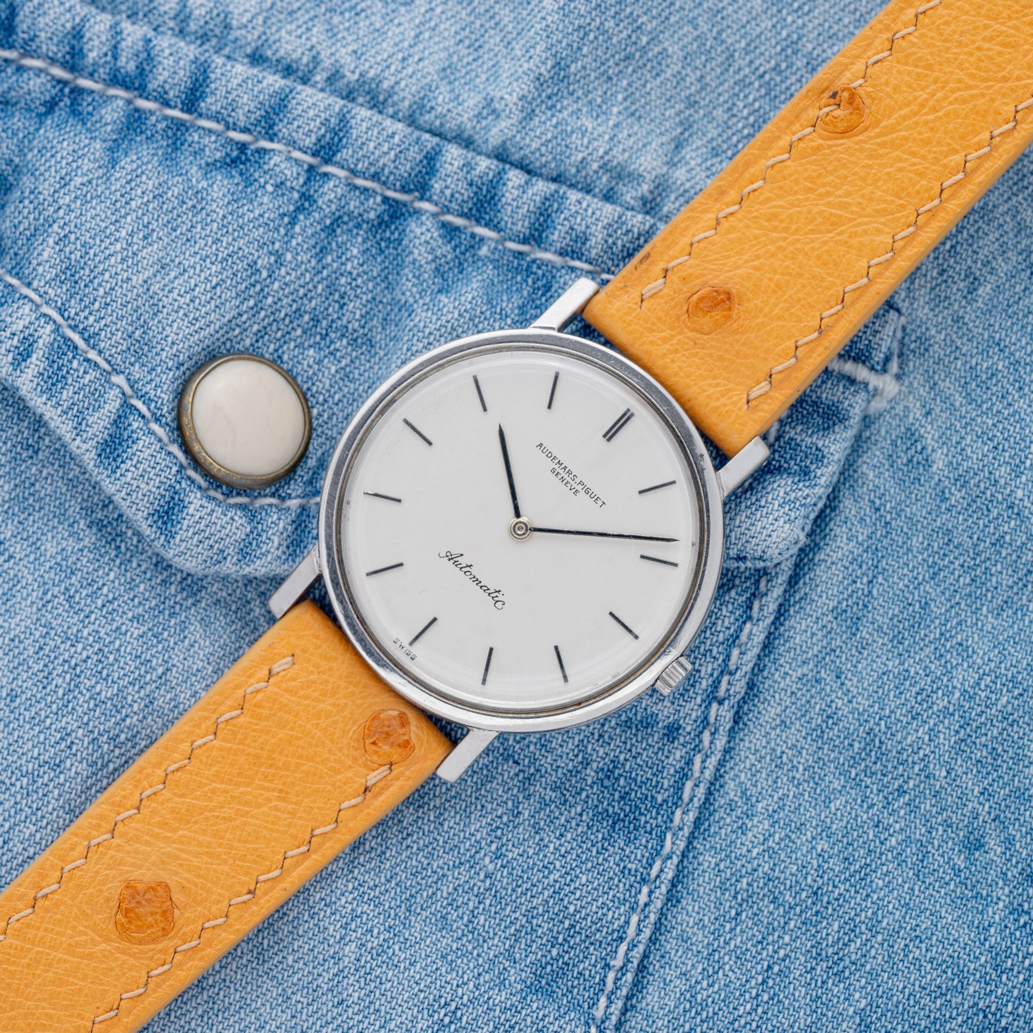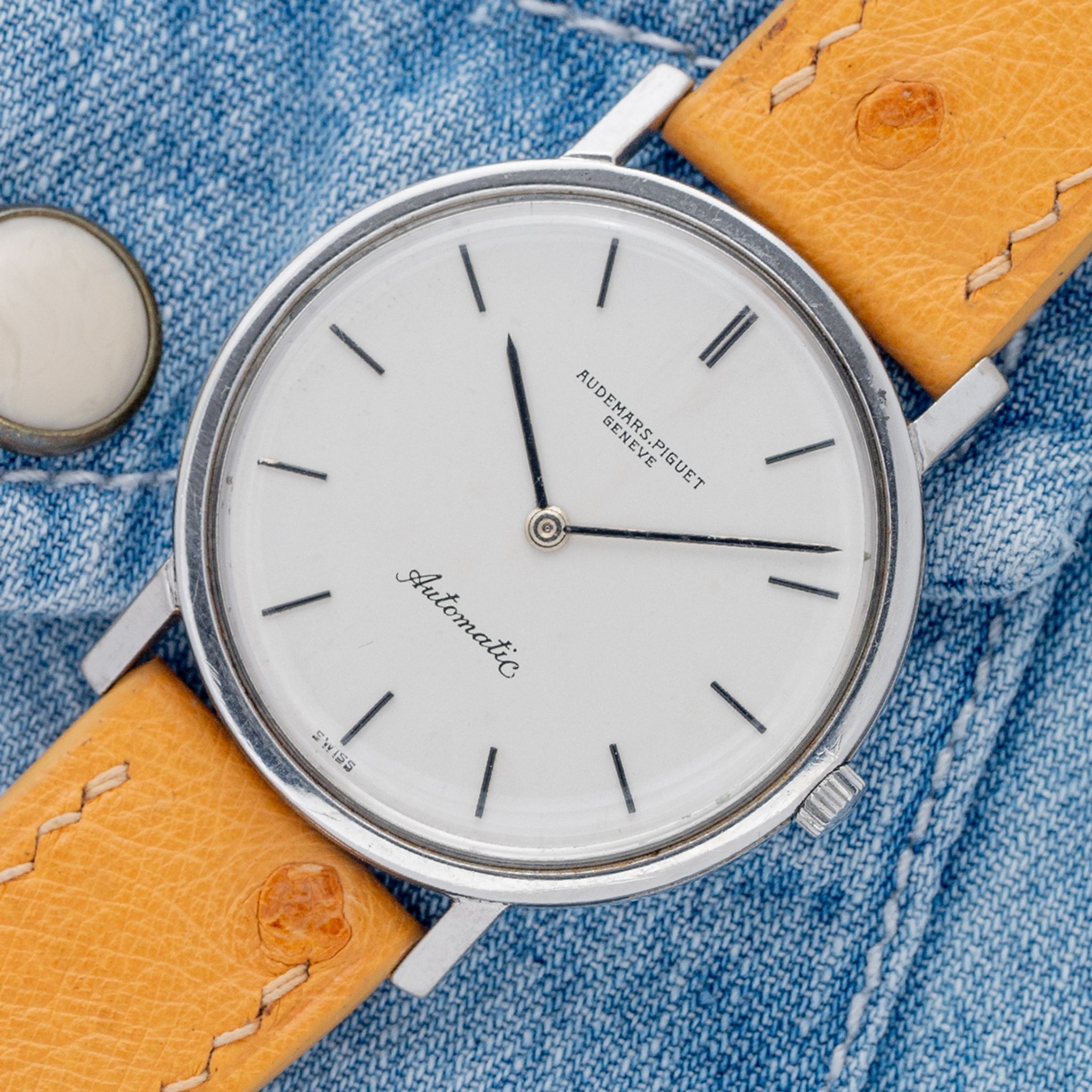 Audemars Piguet's ref. 5273 is a very rare vintage find with elegant proportions of 34mm, and just 5.9mm in thickness. The dial displays a beautiful "Automatic" text referencing the high grade caliber 2120 it houses. This movement is historically important due to its use in both of the first series of the Royal Oak (ref. 5402), as well as the Patek Philippe Nautilus (ref. 3700). For those who appreciate the seldom seen finds, the 5273 offers a "less is more" and "no frills" design language and makes for a practical dress addition being self-winding and in stainless steel. We could not be more proud to offer this example which has remained in fantastic vintage condition with a clean dial and unpolished case!