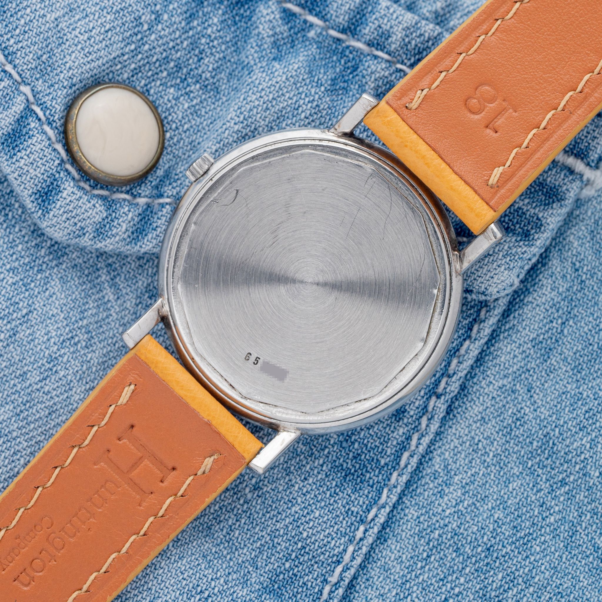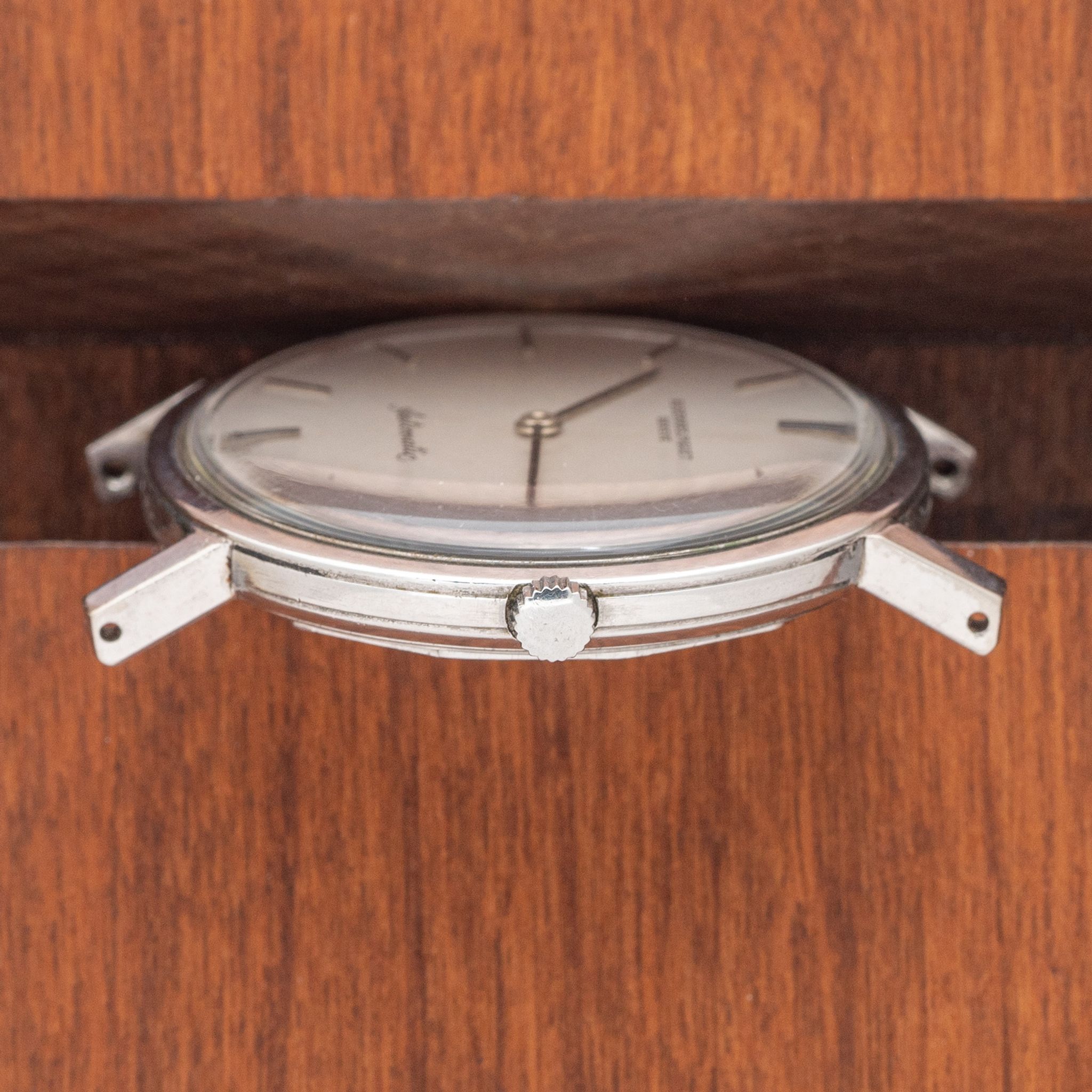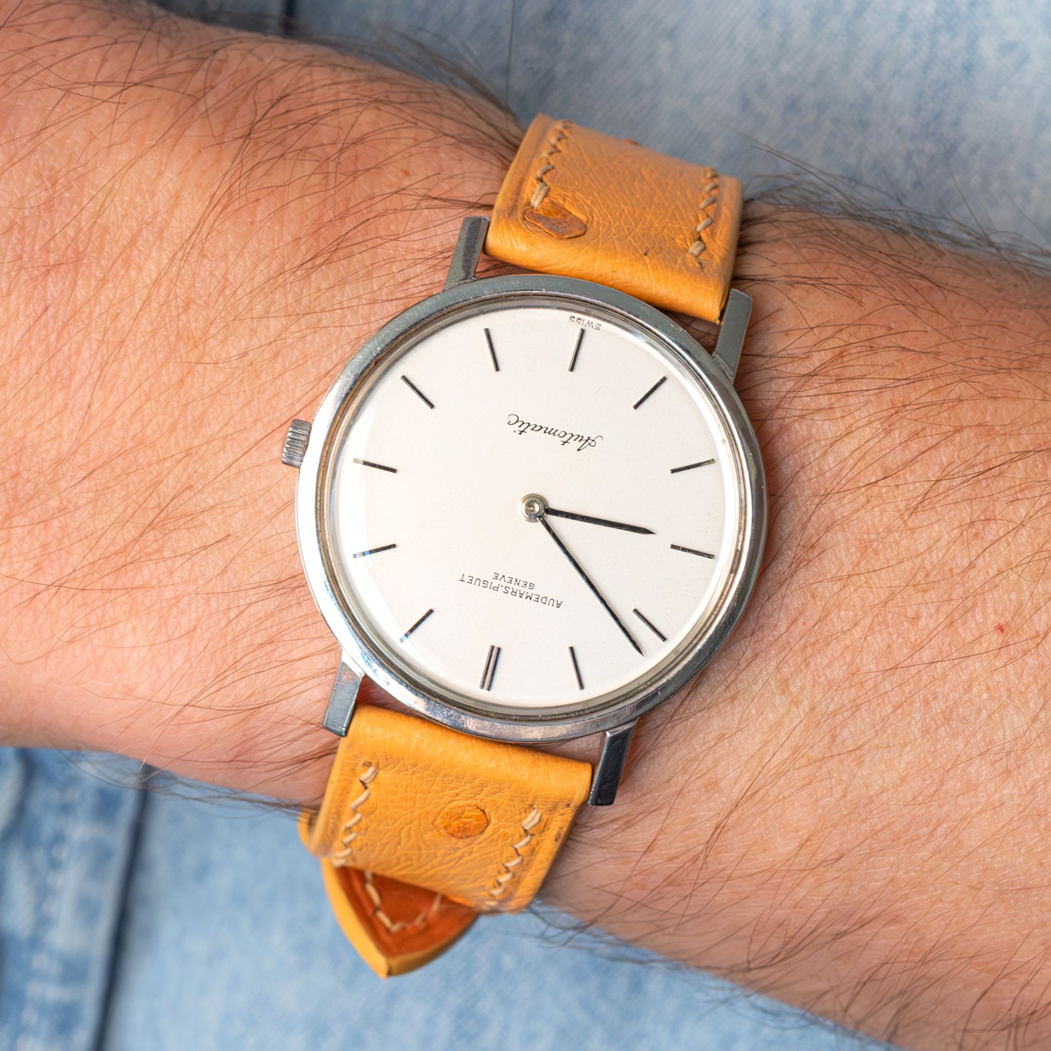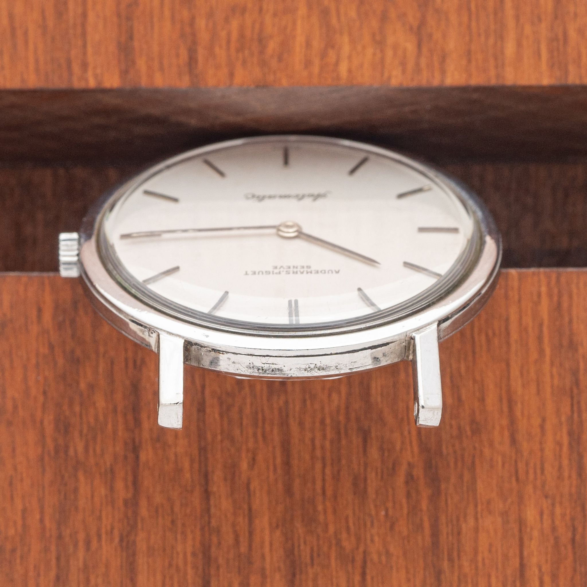 Audemars Piguet's ref. 5273 is a very rare vintage find with elegant proportions of 34mm, and just 5.9mm in thickness. The dial displays a beautiful "Automatic" text referencing the high grade caliber 2120 it houses. This movement is historically important due to its use in both of the first series of the Royal Oak (ref. 5402), as well as the Patek Philippe Nautilus (ref. 3700). For those who appreciate the seldom seen finds, the 5273 offers a "less is more" and "no frills" design language and makes for a practical dress addition being self-winding and in stainless steel. We could not be more proud to offer this example which has remained in fantastic vintage condition with a clean dial and unpolished case!