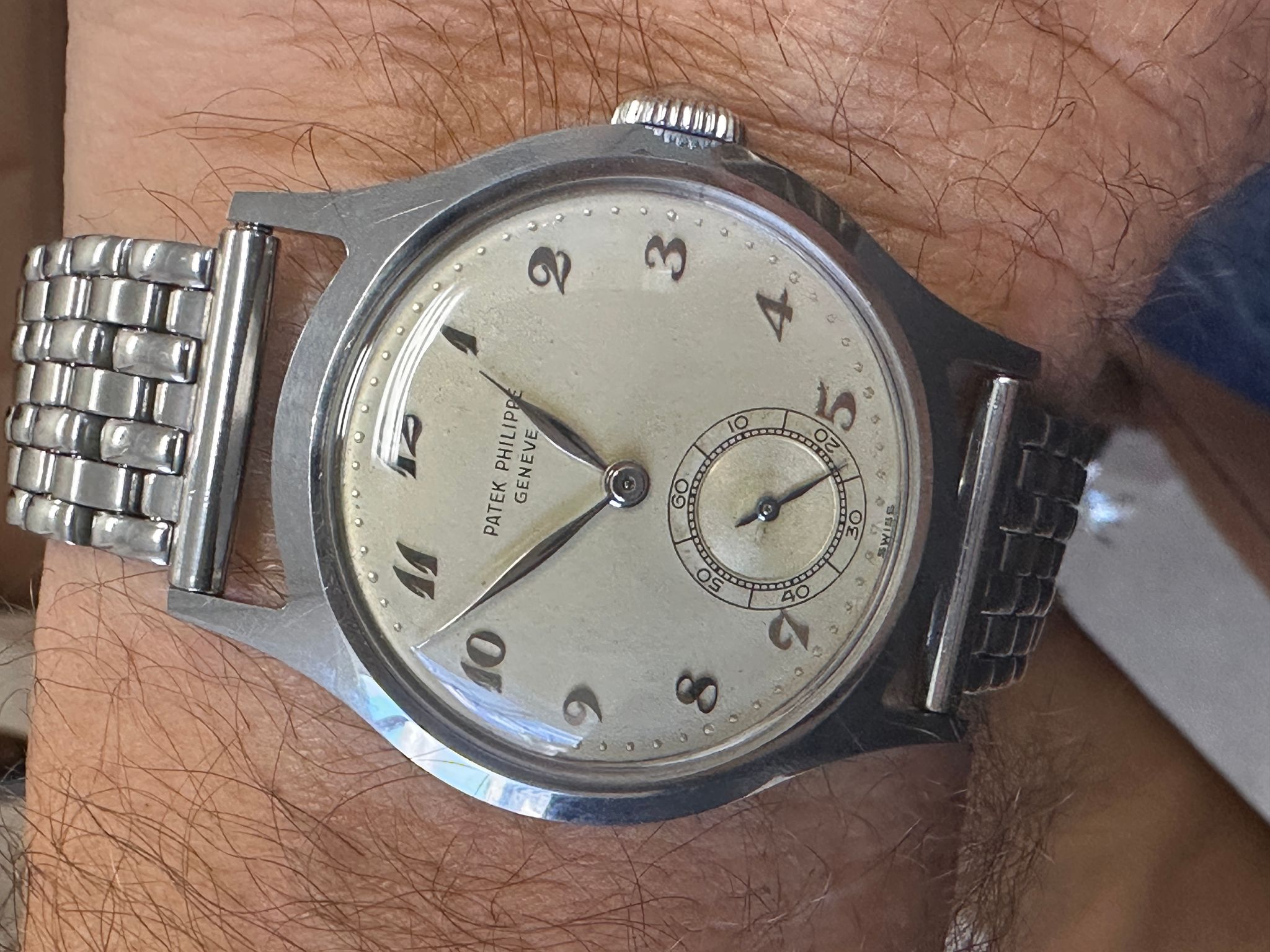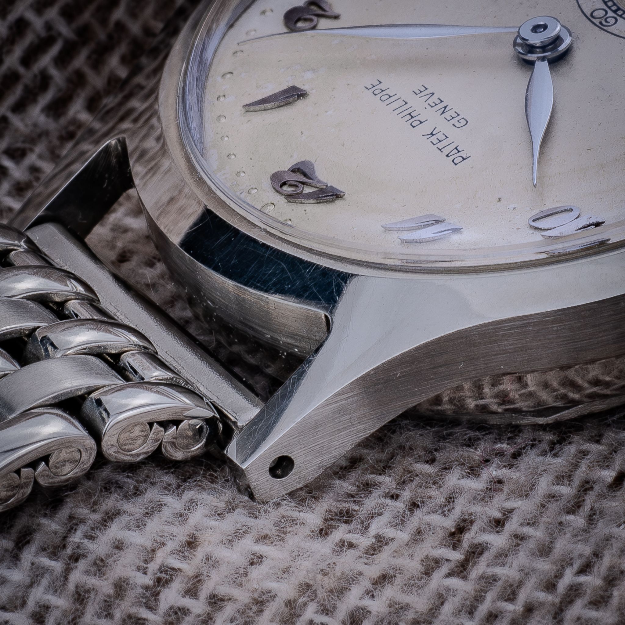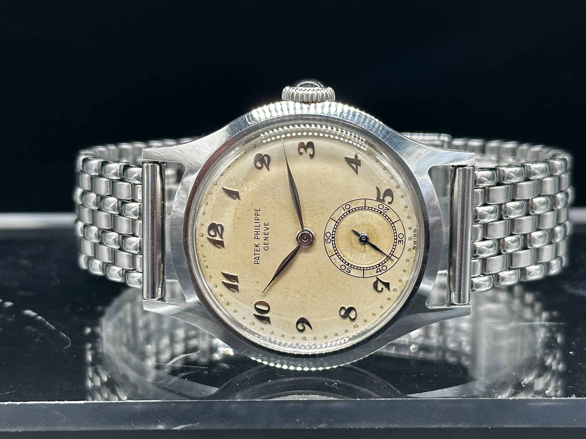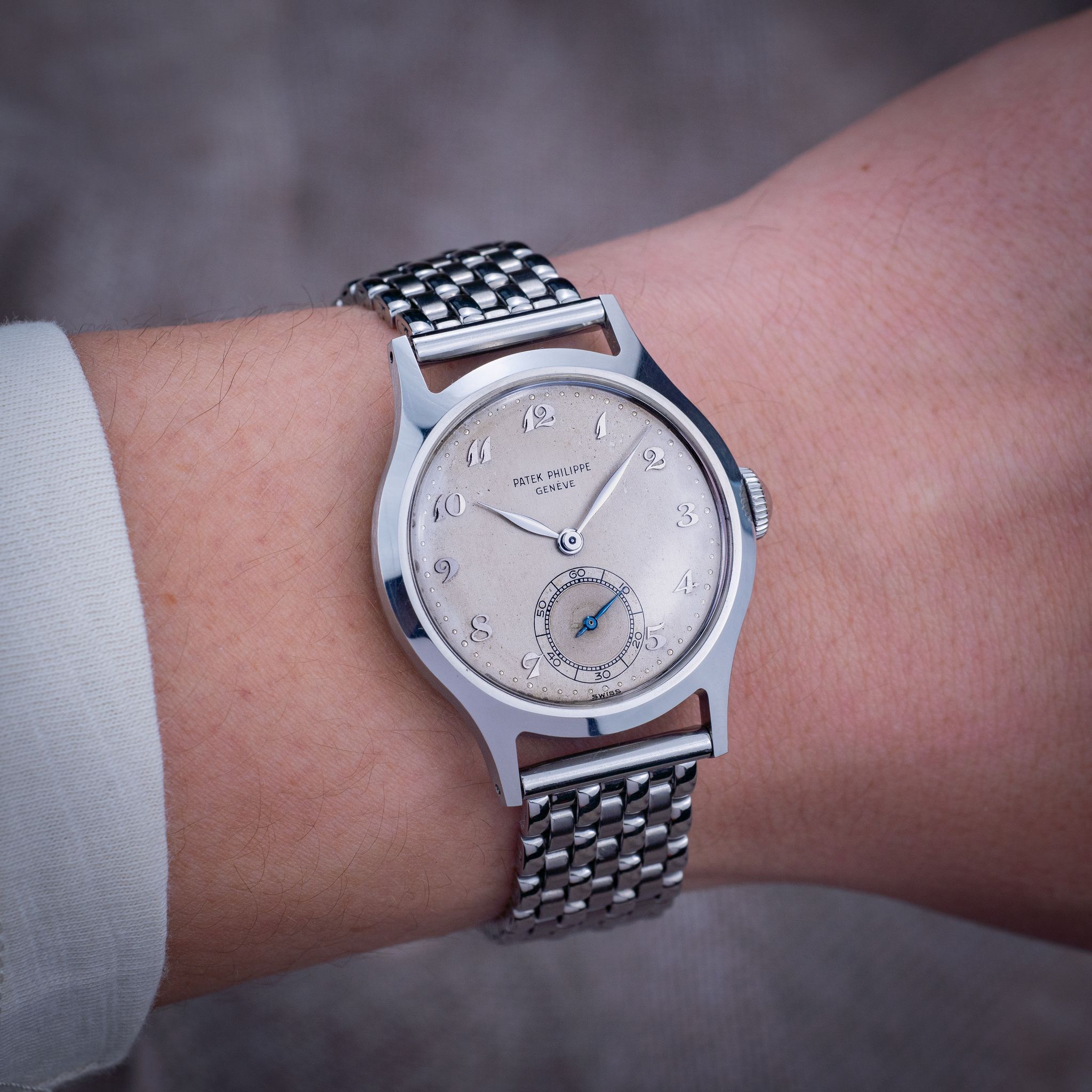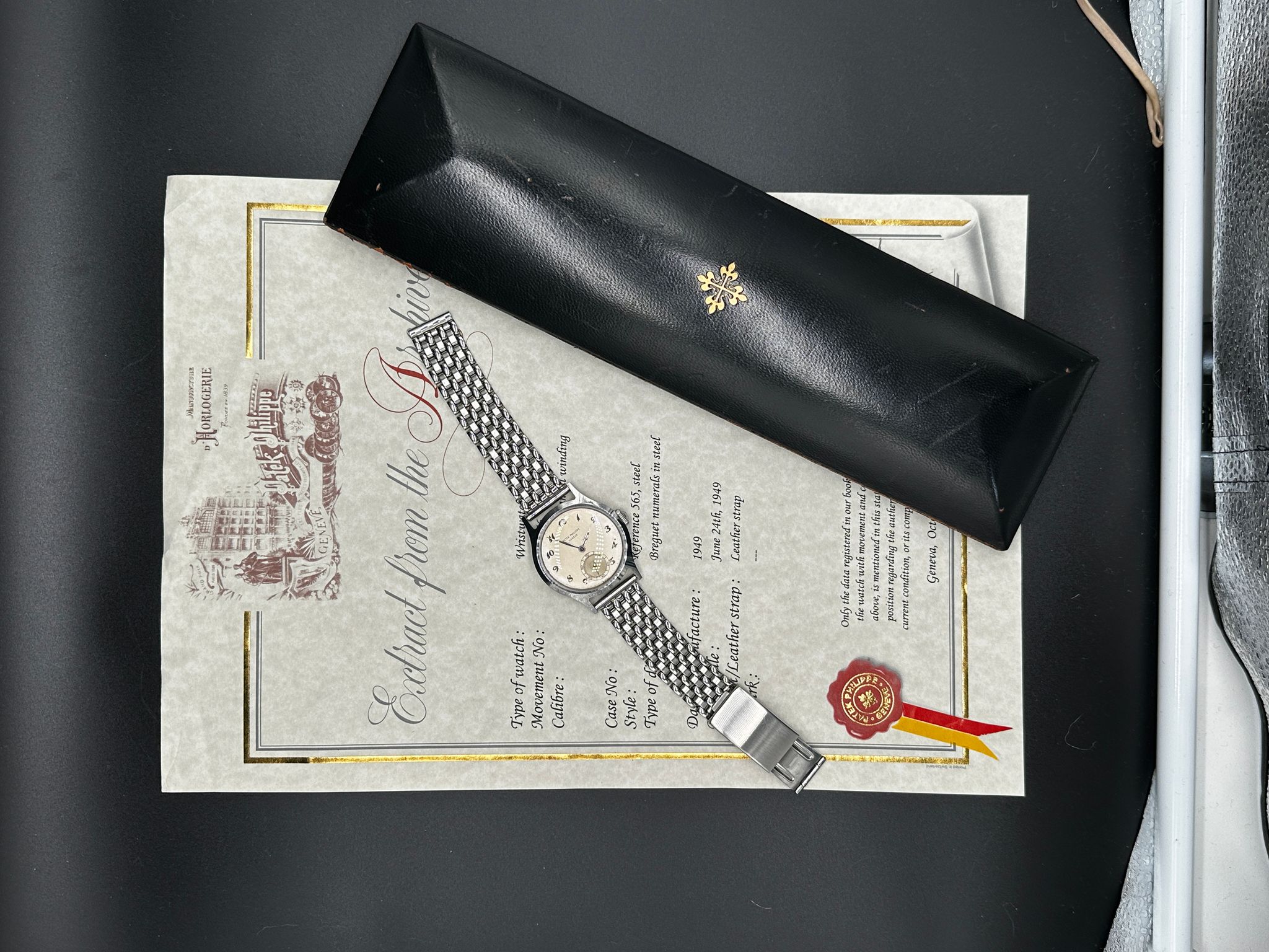 Patek Philippe reference 565 in stainless steel, produced from the late 30s until the early 50s, it saw multiple design shifts. A pioneering reference as it was Patek Philippe's response to the growing need for waterproof watches. The 565 has always been appreciated thanks to its generous proportions and very timeless case design; it saw multiple case materials and dial layouts during its production span. The present specimen features “Breguet” numerals and small seconds, it is accompanied by the Extract from the Archives by Patek Philippe that confirms the Breguet numerals in steel and the year of manufacture, 1949.