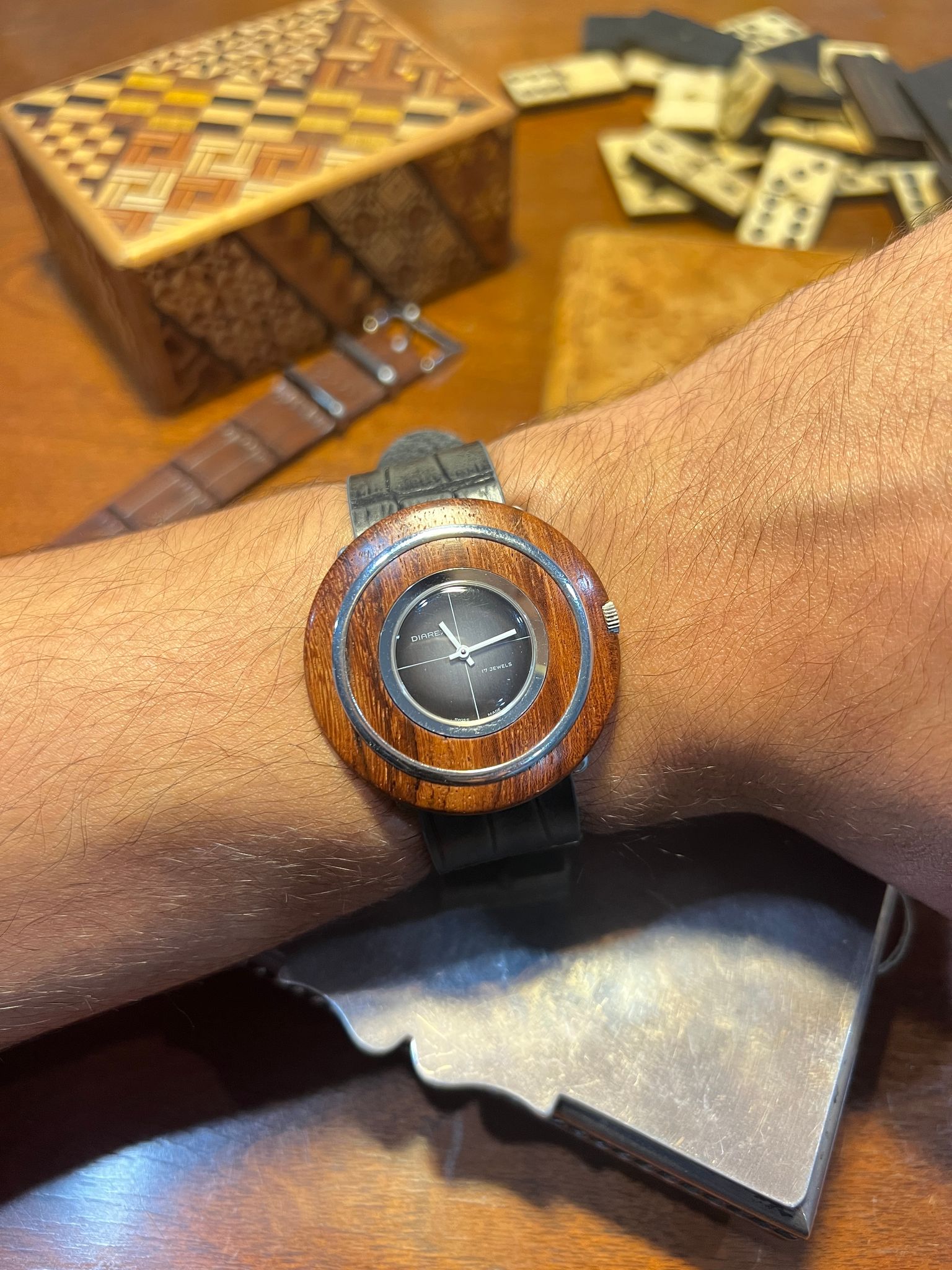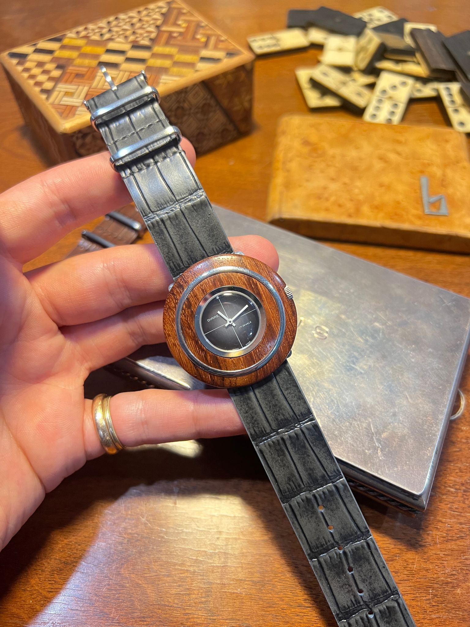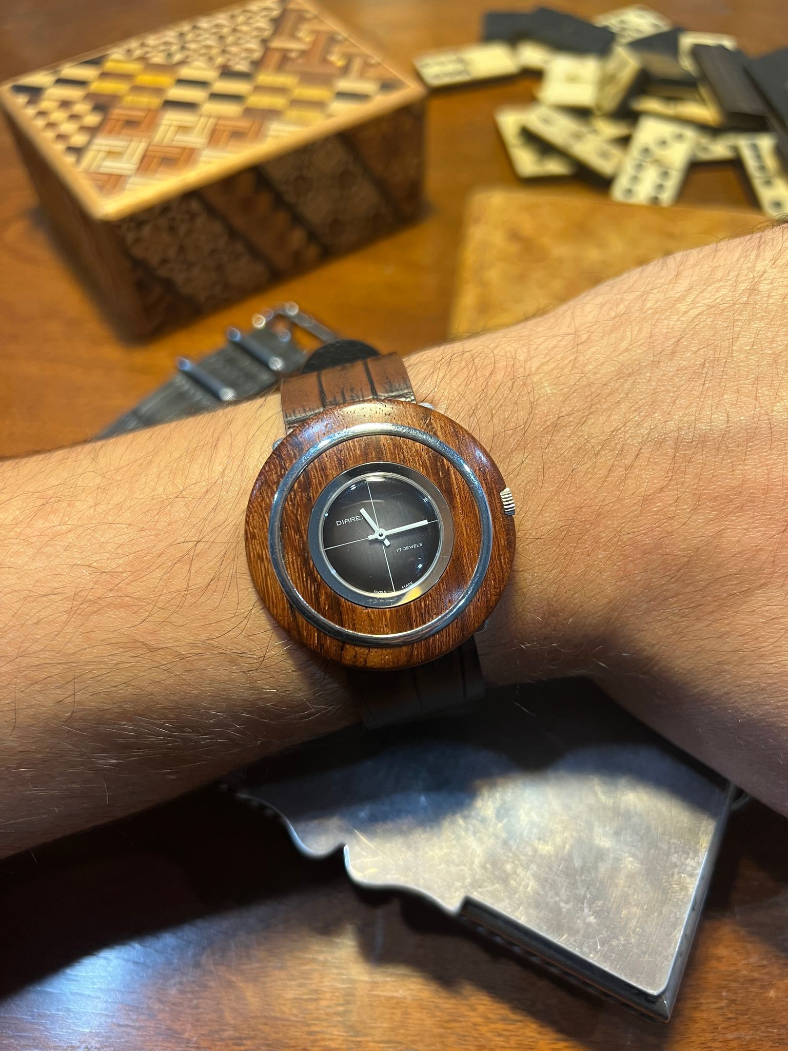 A wonderfully funky 60’s Diarex branded wrist watch, in a rosewood and .800 silver case.