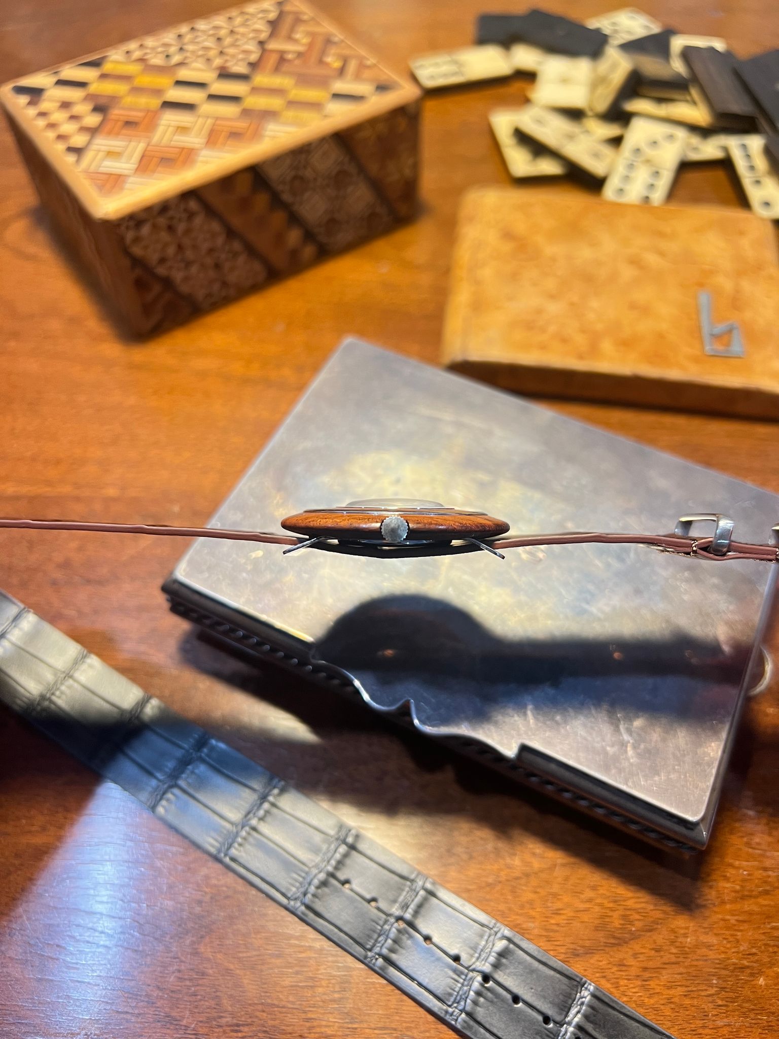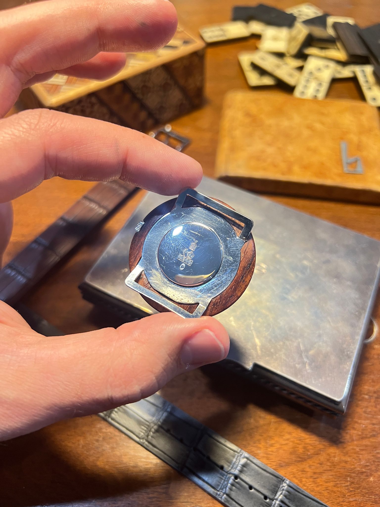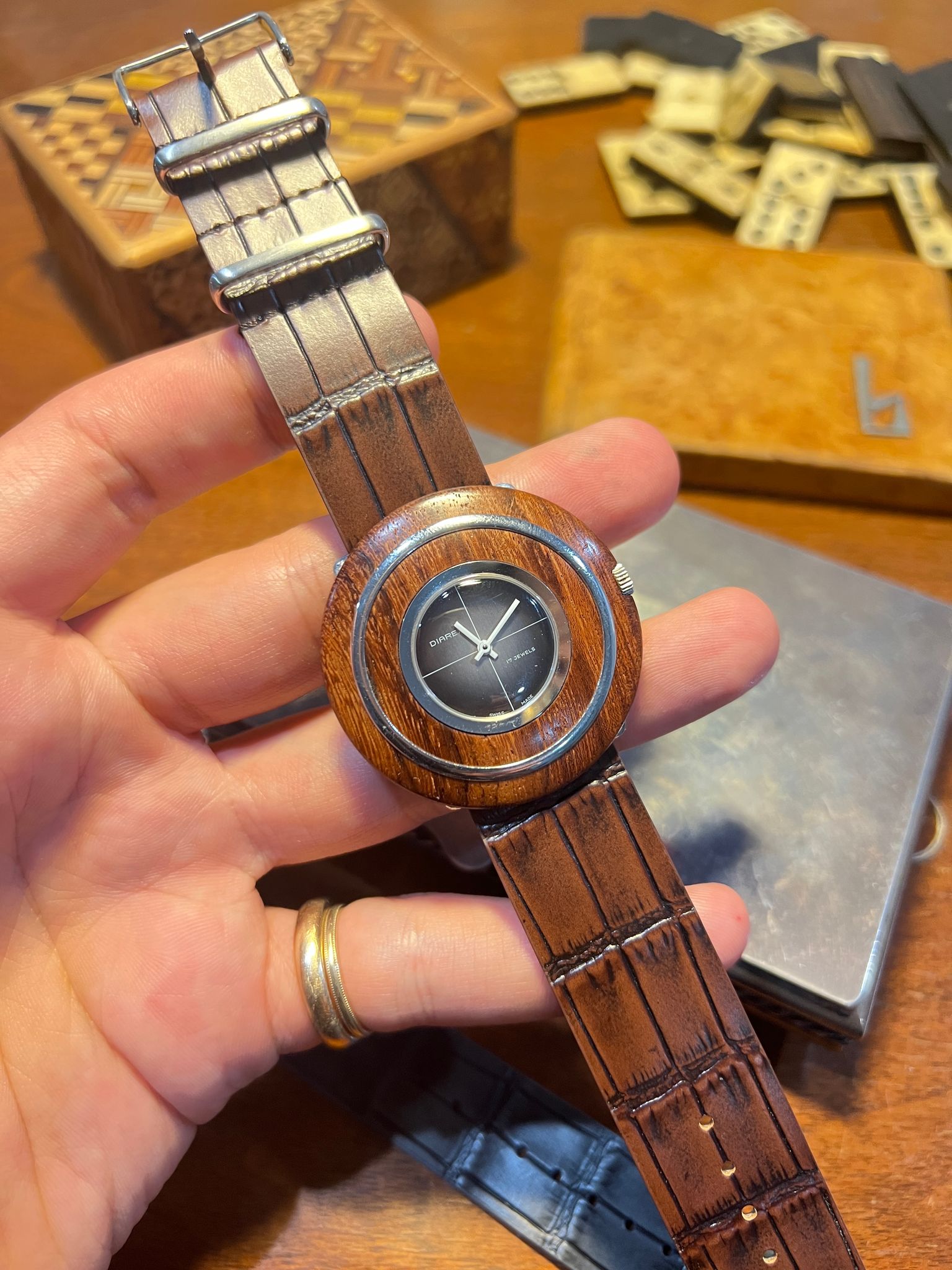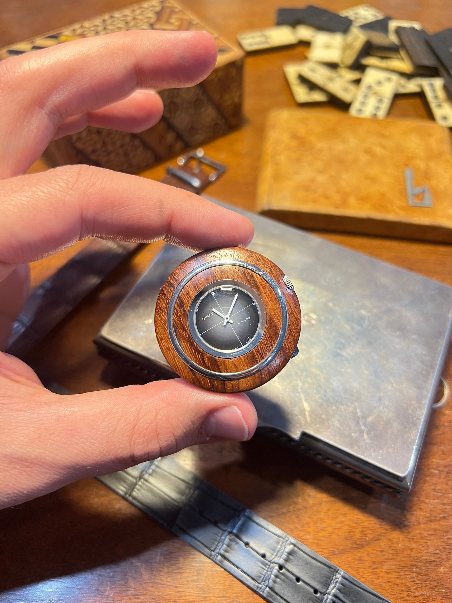 A wonderfully funky 60’s Diarex branded wrist watch, in a rosewood and .800 silver case.