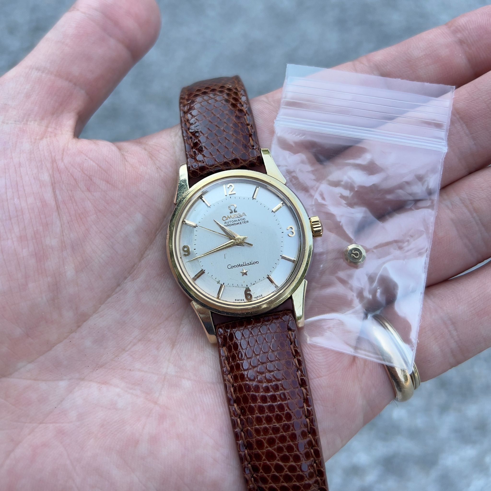 Being serviced by an Omega watchmaker, the crown was replaced with what Omega now deems is the optimal crown. As such, the era/model appropriate 10-sided crown is included with the watch for the new owner if they choose to have it installed.