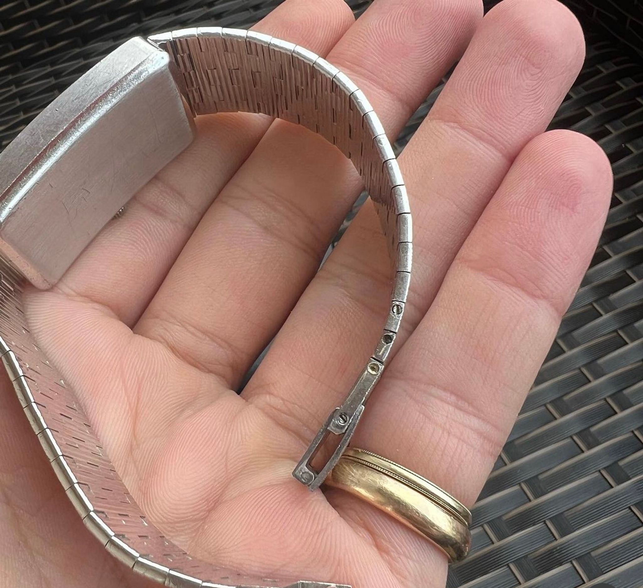 The bracelet, unlike most integrated precious metal bracelets of the time, features removable links (of which 4 extras are included in the set). Currently wearing around 7.5” with the addition of the extra links it would conceivably fit close to an 8” wrist.