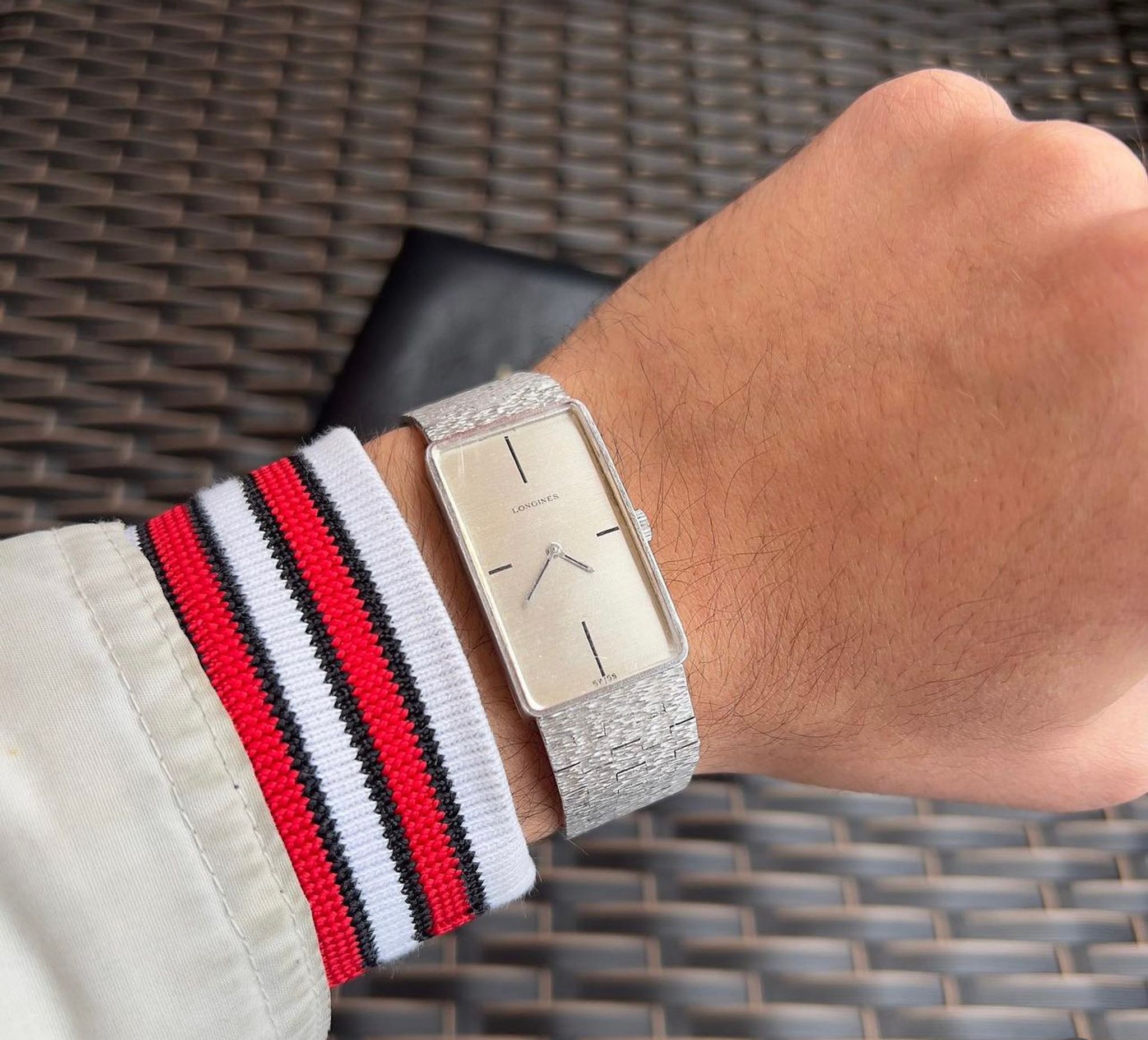 The elongated case is curved, with the link style integrated bracelet it allows the piece to wrap around the wrist comfortably.