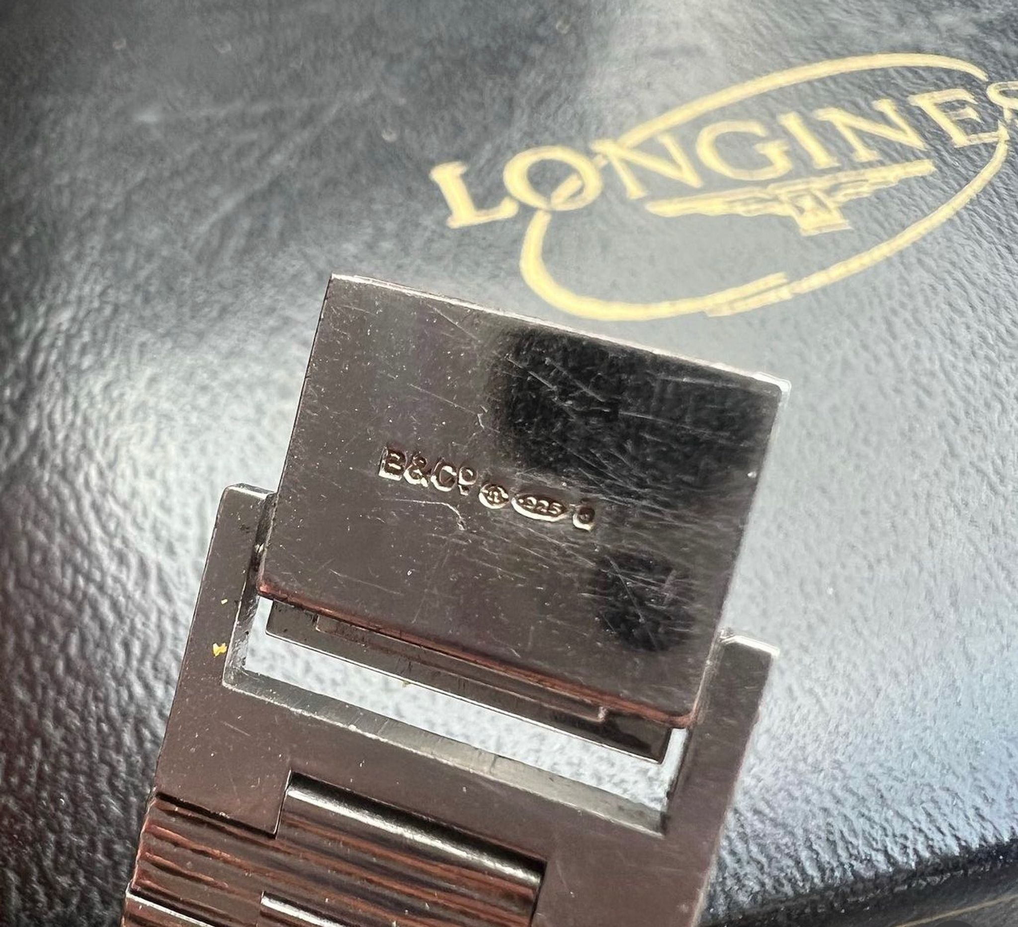 The sterling case and bracelet were produced by Baume & Co. known for their collaborations with Longines throughout the early and mid 20th century. The case and clasp are both hallmarked with British assay stamps and makers marks.